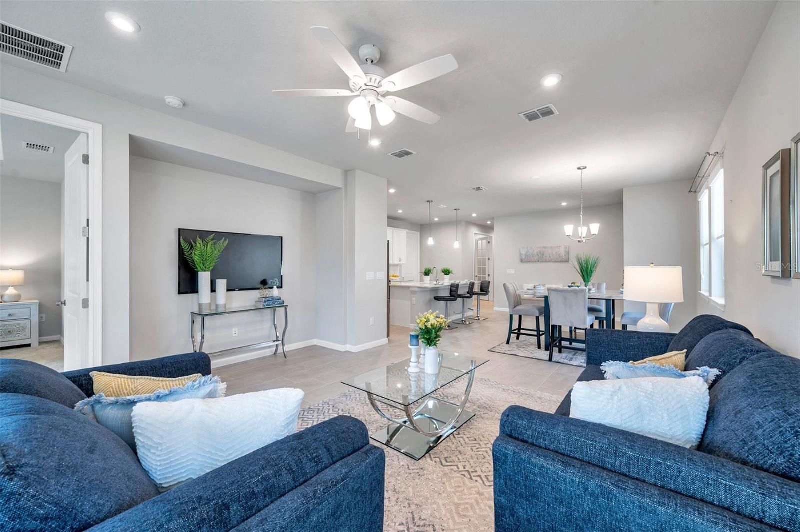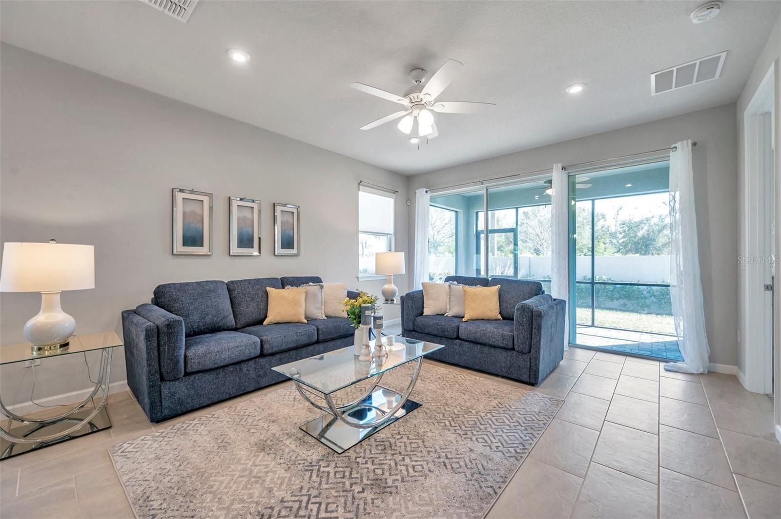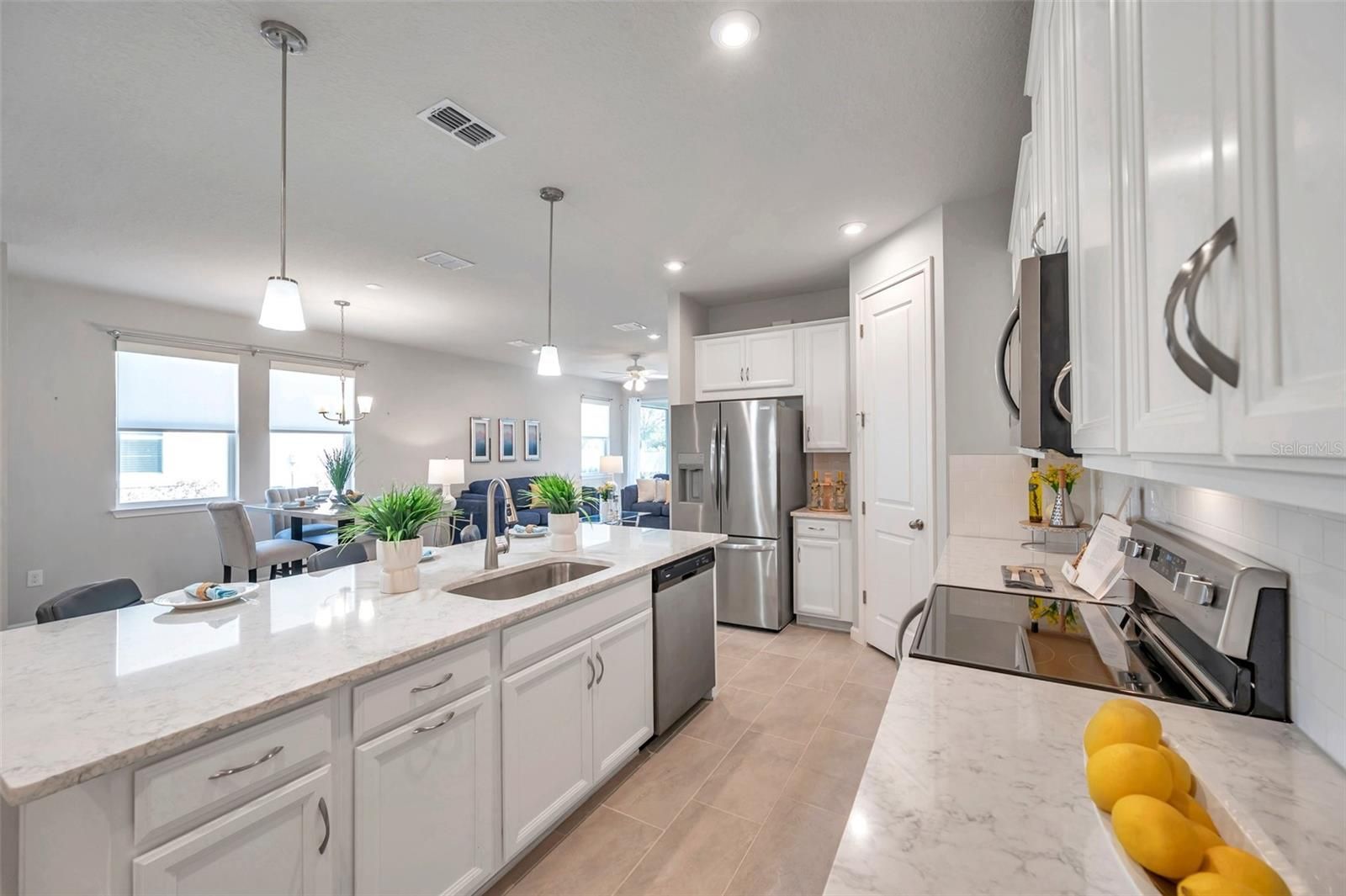 Don't miss your chance to own the stunning Topsail model home in the maintenance free, 55+ community of The Preserve at La Paloma! Barely lived in 1,765 sq. ft. residence offers 3 bedrooms, 2 bathrooms, a den/office, and a 2-car garage. Enjoy the beautifully landscaped yard and paver driveway as you step inside to discover an open floor plan filled with natural light. The modern kitchen features elegant quartz countertops, stainless steel appliances, and a spacious island with a breakfast bar—perfect for culinary adventures! The generous great room and screened-in back porch create an ideal setting for entertaining guests. The primary suite is complete with double vanities, a private water closet, and a large walk-in closet with built-in shelving. The Preserve at La Paloma is a secure gated community with low HOA fees, no CDD fees and offers fantastic amenities like a pool, pickleball courts, and a fire pit area just across the street. Plus, you’ll enjoy the convenience of being centrally located near golf courses, restaurants, shopping, hospitals, medical offices, beaches, and the interstate. Make this dream home yours today!