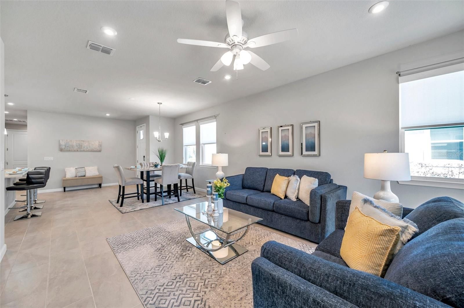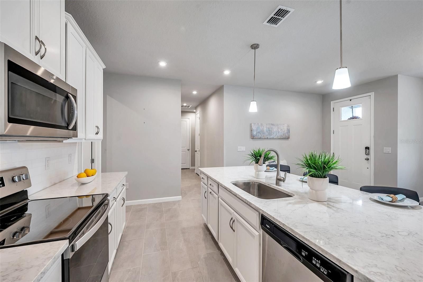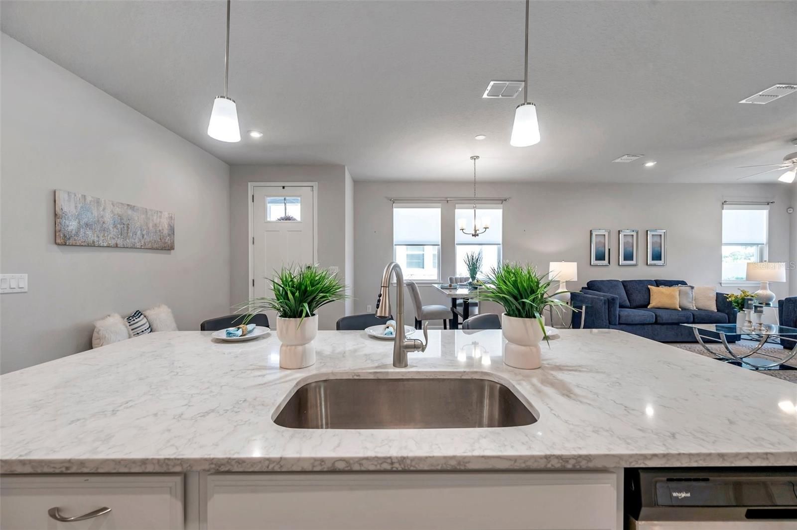 Don't miss your chance to own the stunning Topsail model home in the maintenance free, 55+ community of The Preserve at La Paloma! Barely lived in 1,765 sq. ft. residence offers 3 bedrooms, 2 bathrooms, a den/office, and a 2-car garage. Enjoy the beautifully landscaped yard and paver driveway as you step inside to discover an open floor plan filled with natural light. The modern kitchen features elegant quartz countertops, stainless steel appliances, and a spacious island with a breakfast bar—perfect for culinary adventures! The generous great room and screened-in back porch create an ideal setting for entertaining guests. The primary suite is complete with double vanities, a private water closet, and a large walk-in closet with built-in shelving. The Preserve at La Paloma is a secure gated community with low HOA fees, no CDD fees and offers fantastic amenities like a pool, pickleball courts, and a fire pit area just across the street. Plus, you’ll enjoy the convenience of being centrally located near golf courses, restaurants, shopping, hospitals, medical offices, beaches, and the interstate. Make this dream home yours today!