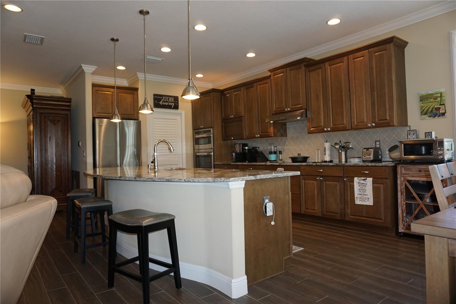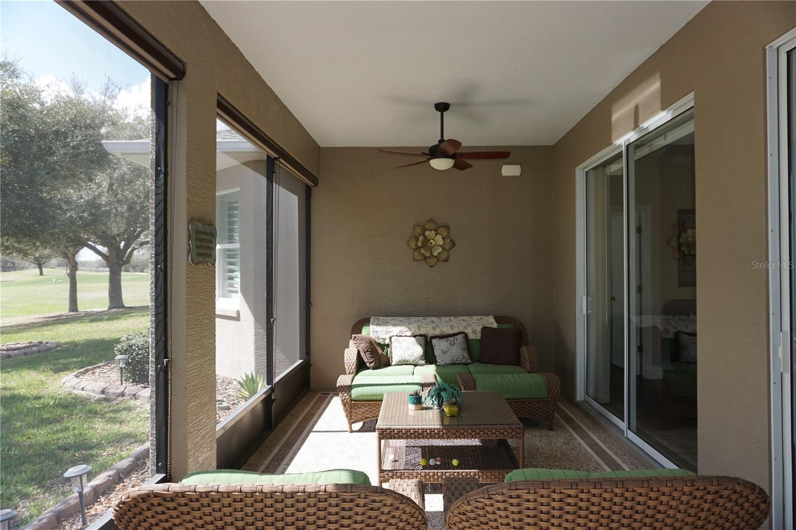 WOW… What an exemplary home that’s been very tastefully and thoughtfully upgraded. Over $80,000+ worth of upgrades has been spent perfecting this home and it’s located on a Premium lot overlooking the 13th green of the championship golf course in Arlington Ridge! From the moment you pull up to the house you start to notice the upgrades with the Epoxy painted driveway, the golf cart garage and the screened in front porch with an oversized screen door. You will then notice that the front door opens outward (This change is from the seller’s experience of living in Miami through many hurricanes so that the hurricane force winds cannot blow the door inwards). Once inside you will notice the porcelain tile and the tight grout lines with deeper base boards. Glance across to the kitchen and the large eyebrow island and the quartz counters stand out but look closer and there is the 42” tall upper cabinets that are 15” deep (To accommodate all sizes of large dinnerware), the refrigerator has been moved to a better workable position and create more counter space around the 30” GE cooktop with 5 burners and the built-in GE oven and microwave combo. Oh, and the cooktop hood vents to the outside, the appliances are stainless steel. There are pan draws below the cook top and slide outs in the other lower cabinets and all cabinets are soft close drawers or doors. Look up and you will see the crown molding that transitions into the Primary bedroom where you will notice the non-standard bay window overlooking the 13th green. Do you like tech? The HVAC thermostat, the CCTV security cameras and the irrigation system can be controlled remotely. There are many more upgrades/features in this home. Thoughtfully constructed for energy efficiency, the home offers exceptionally low utility costs, featuring spray foam insulation in exterior block walls, radiant barrier roofing, R38 attic insulation, and double-pane Low-E argon gas windows ensuring year-round comfort and peace of mind. The gas tankless hot water heater also add to the energy savings. The new roof installed in 12/2024 has an additional weatherproof membrane installed over & above the current roof membrane code regulations and should the power go out there is a natural gas Generac whole house generator (More Miami hurricane experience by the seller’s). Step onto the 24’x10’ screened lanai, a serene outdoor sanctuary ideal for morning coffee, evening relaxation, or simply enjoying Florida’s gentle breezes in the privacy created by solid wall design on either side of the lanai. Set within the award-winning Arlington Ridge Golf Community, highly acclaimed by Where to Retire magazine. Residents enjoy access to an exceptional suite of amenities, including: Full-service restaurant and pub, state-of-the-art fitness center, resort-style swimming pool & on-site movie theater. Ideally located in South Leesburg, this residence is moments from grocery shopping, medical facilities & restaurants. Enjoy the convenience of being less than one hour from Orlando’s International airport and world renowned attractions, with both the Atlantic and Gulf Coast beaches reachable in under 2 hours. This distinguished home offers the perfect balance of elegance, efficiency, and leisure in one of Central Florida’s most desirable active adult communities. An exceptional opportunity to elevate your Florida lifestyle—schedule your private showing today to fully appreciate what these fastidious seller’s have created with this home!
