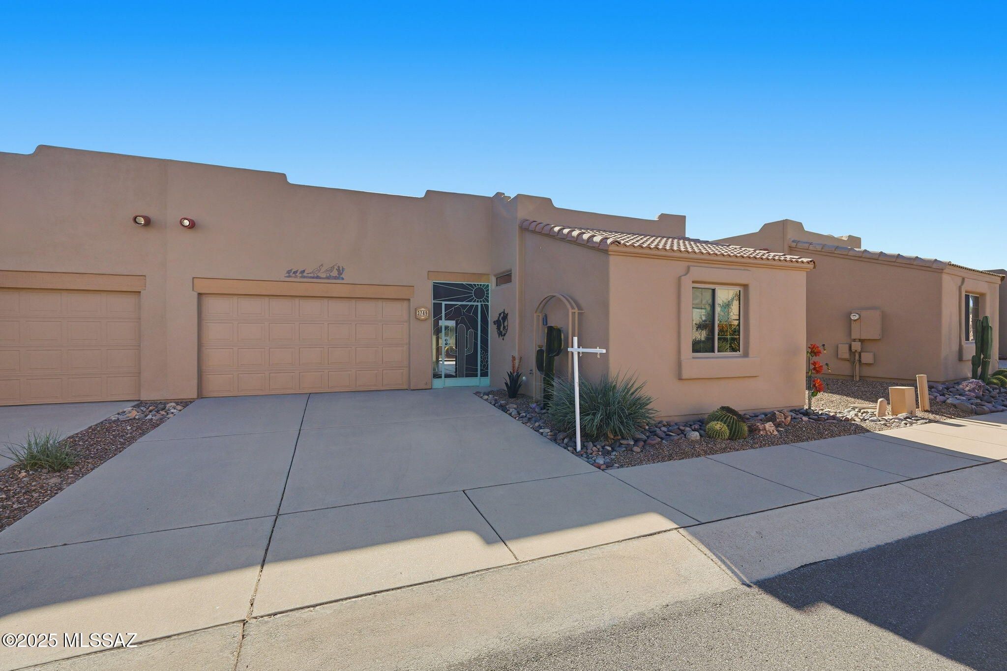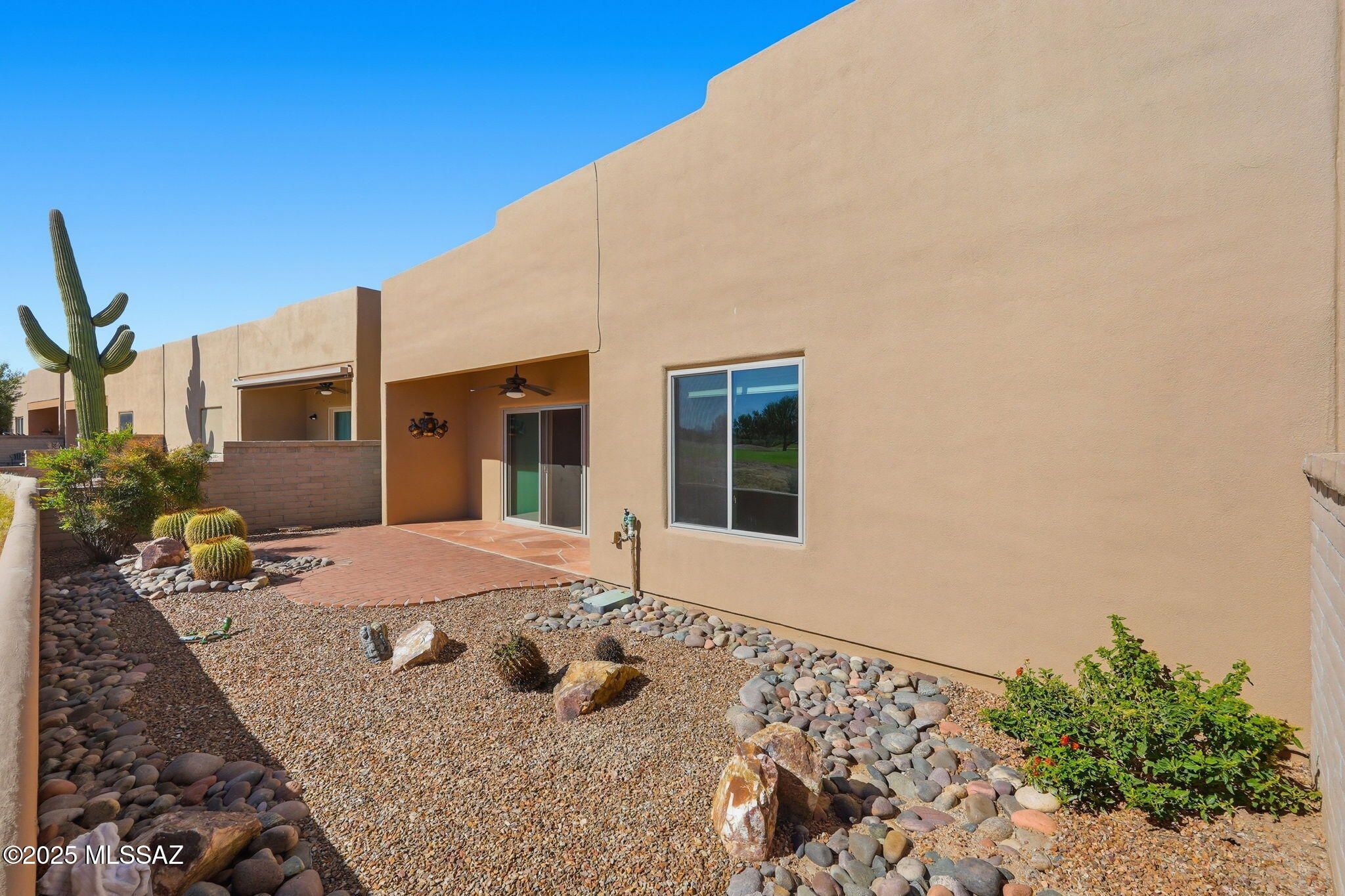 Wake up to breathtaking mountain views and enjoy your morning coffee on the sunlit paver patio while watching the early golfers tee off. This 2-bedroom, 2-bath townhouse offers a private guest suite, while the primary bedroom showcases magnificent mountain views, a remodeled bath with double vanity and walk-in shower, plus two closets for ample storage. The updated kitchen makes meal prep a pleasure as you look out to the Santa Ritas. Lovely cabinetry with soft close doors and drawers. Easy-care tile flooring flows throughout, and new windows with Hunter Douglas blinds let natural light pour in while keeping the winter chill out. The garage provides plenty of storage along with space for a vehicle and golf cart or bikes. Welcome to paradise--your new ''Home Sweet Desert Home!