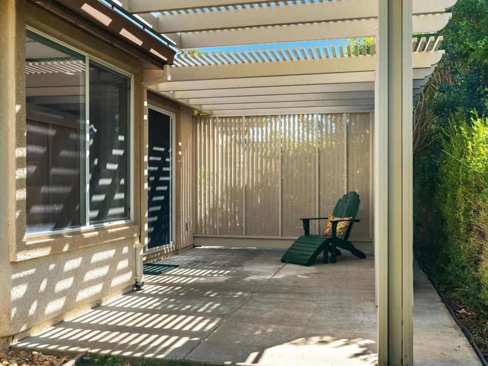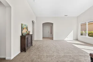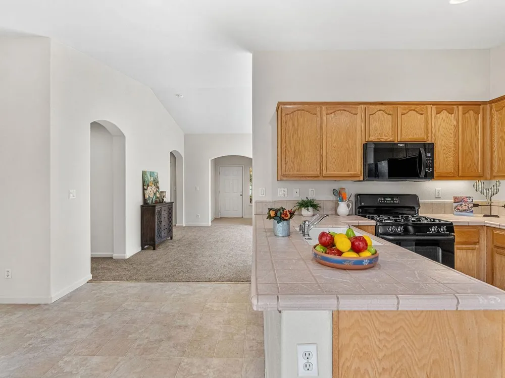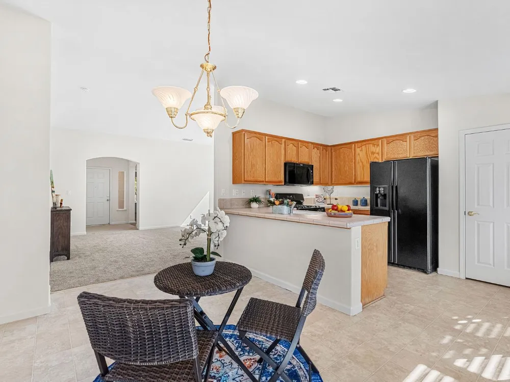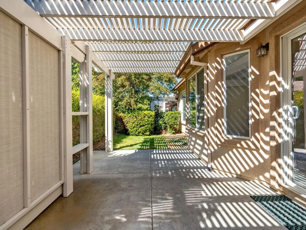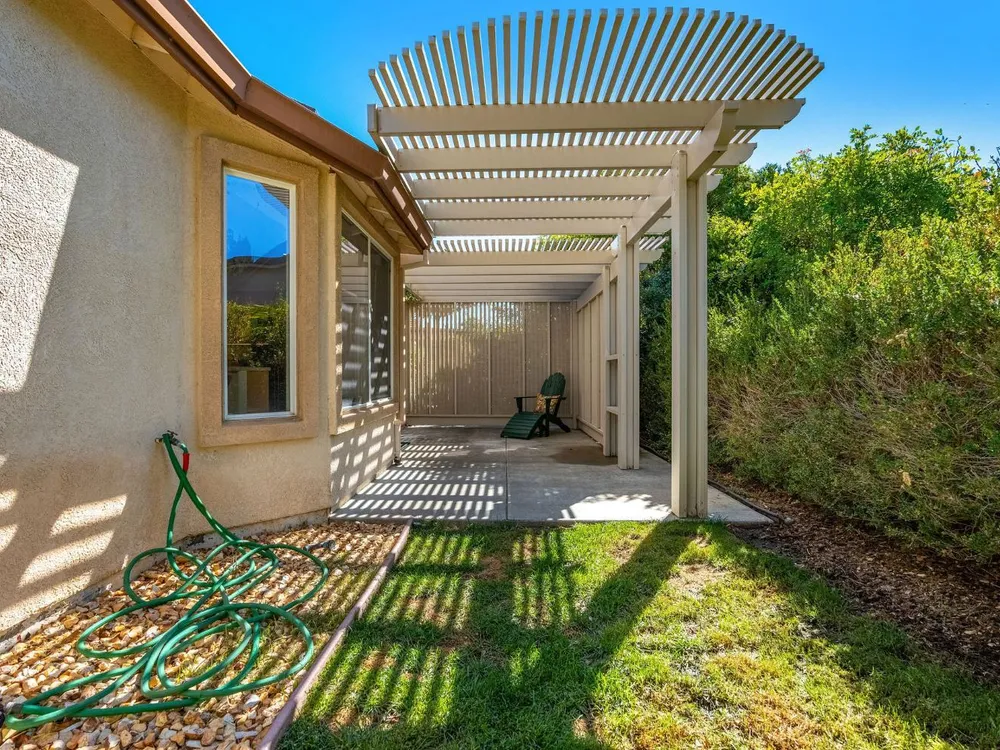 Beautiful Pebble Beach Floor Plan surrounded by lush landscaping and a cozy covered patio in the back yard. This popular floor plan has 2 bedrooms, 2 baths, plus den/office and 2 car garage. New carpet and new interior paint, ceiling fan in primary bedroom, bay window in dining room and oak cabinets throughout. Interior laundry room includes washer and dryer, and the kitchen boasts a roomy pantry, tile counters, gas range, microwave, refrigerator and dishwasher. Mature shade trees complete the front yard. A lovely home from which to enjoy the 55+ lifestyle of Trilogy with its abundant activities and amenities.