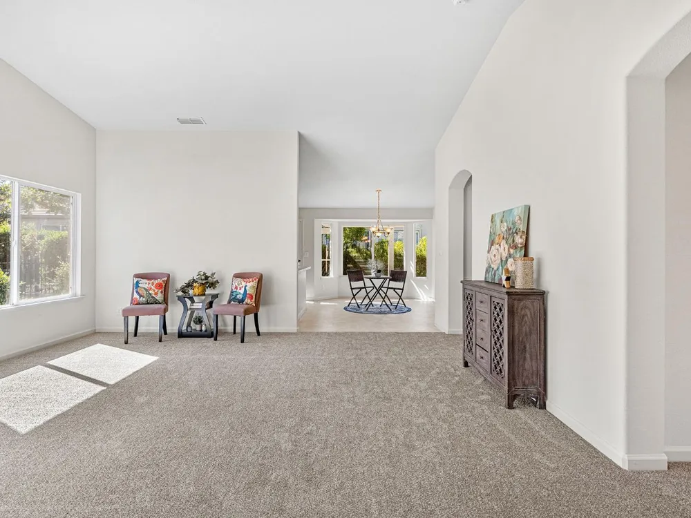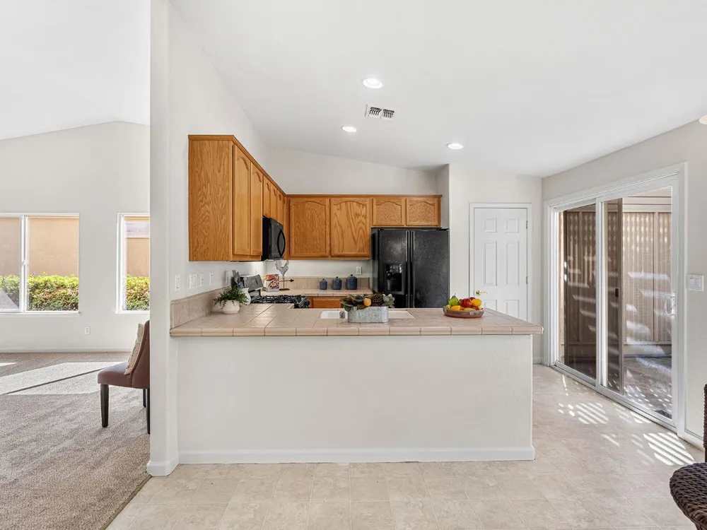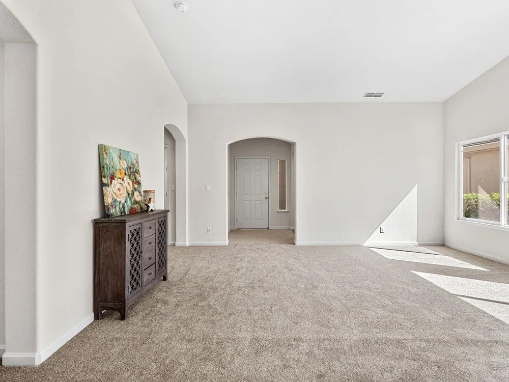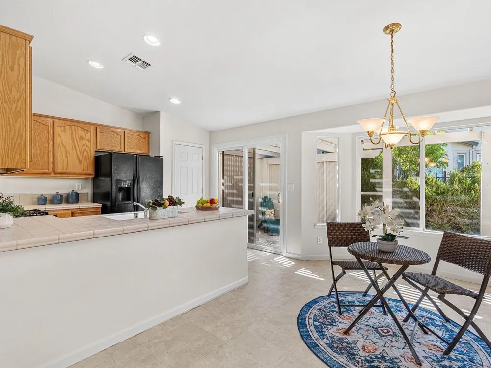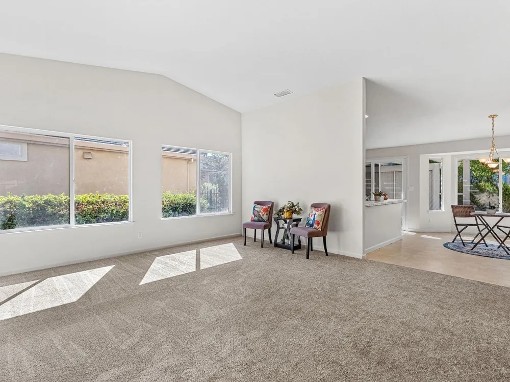 Beautiful Pebble Beach Floor Plan surrounded by lush landscaping and a cozy covered patio in the back yard. This popular floor plan has 2 bedrooms, 2 baths, plus den/office and 2 car garage. New carpet and new interior paint, ceiling fan in primary bedroom, bay window in dining room and oak cabinets throughout. Interior laundry room includes washer and dryer, and the kitchen boasts a roomy pantry, tile counters, gas range, microwave, refrigerator and dishwasher. Mature shade trees complete the front yard. A lovely home from which to enjoy the 55+ lifestyle of Trilogy with its abundant activities and amenities.