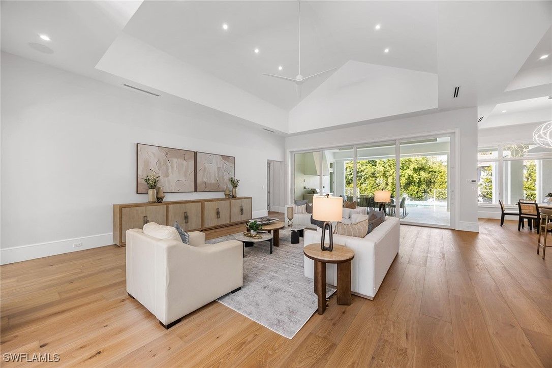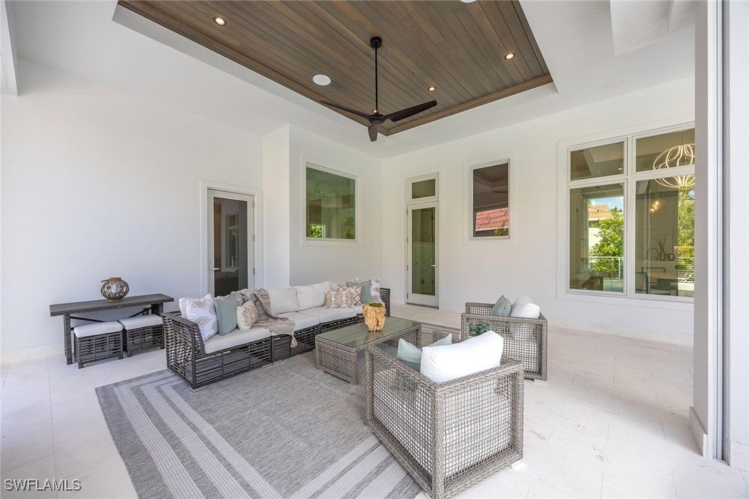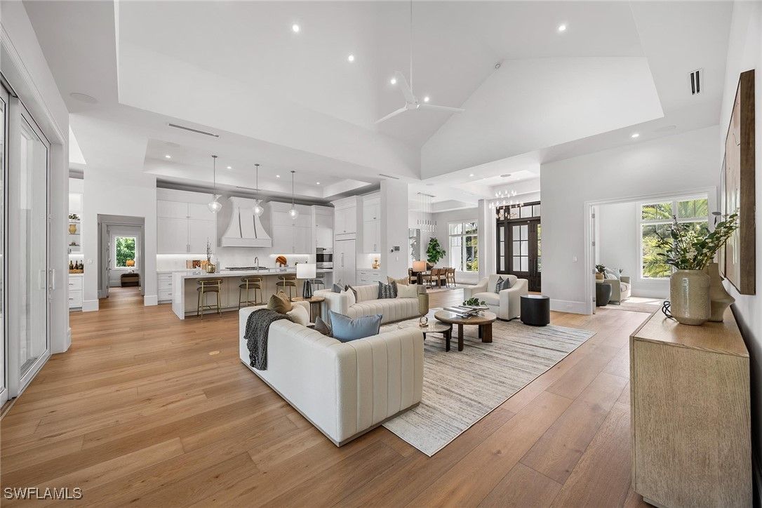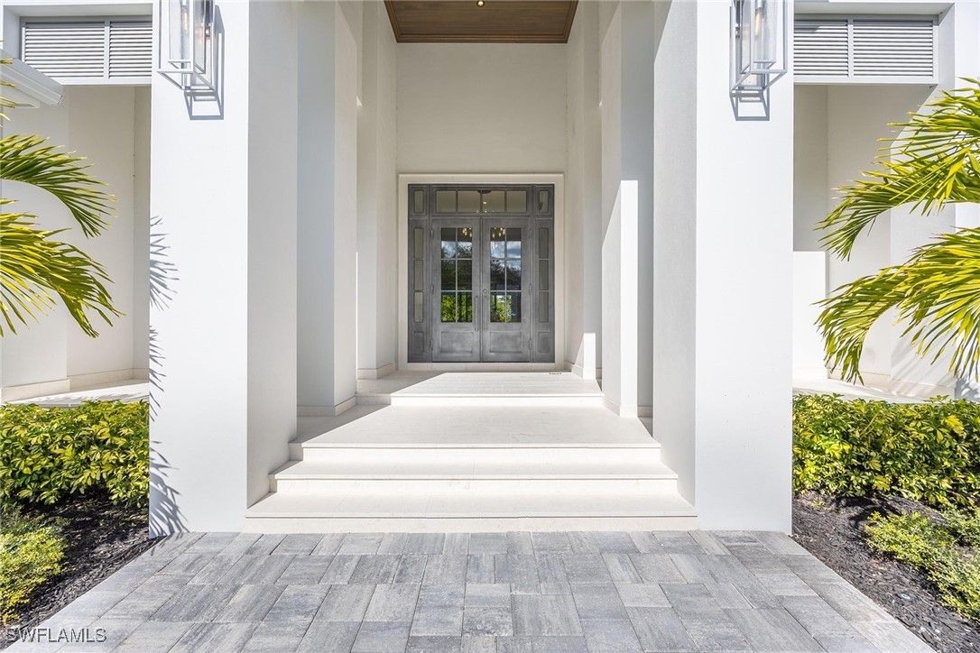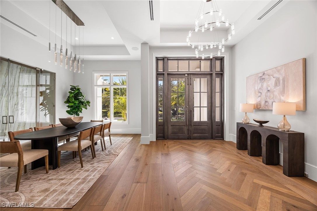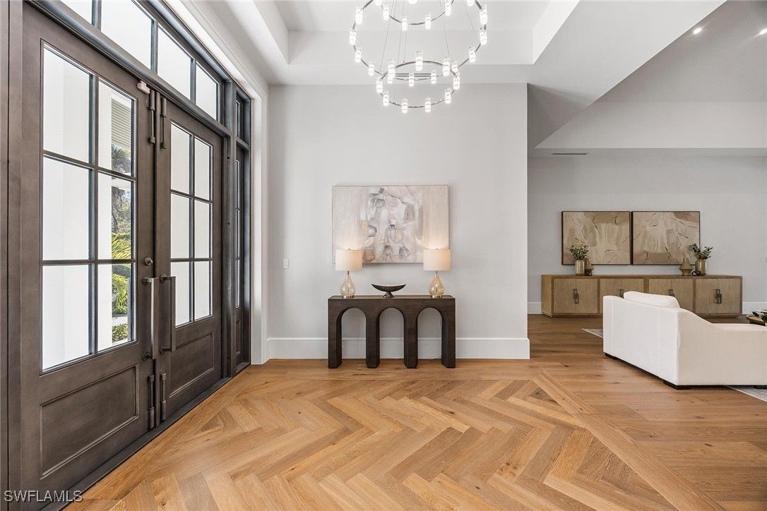 Setting a new benchmark for luxury living, this newly constructed architectural masterpiece is an exceptional offering in the prestigious Moorings neighborhood. Positioned on a tree-lined street with tranquil green space across the way, this sophisticated four-bedroom plus den, 4.5-bath, three-car garage residence delivers an unparalleled blend of elegance, comfort and functionality. From the moment you arrive, the home’s striking curb appeal and 10-foot custom iron entry door set the tone for what lies beyond. The grand foyer welcomes you with abundant natural light, soaring vaulted ceilings and seamless indoor-outdoor transitions. Thoughtfully designed architecture paired with bespoke designer selections by Anna Roze Design Studio make this residence one of a kind. The expansive open floor plan is adorned with 10-inch white oak flooring throughout, custom solid wood cabinetry and doors, and curated designer lighting. A spacious and inviting leisure room creates a setting for intimate gatherings and grand entertaining. The chef’s kitchen is a statement of beauty and function, featuring a large marble island with bar seating, white custom cabinetry, and Wolf and Sub-Zero appliances. A charming breakfast nook with a custom built-in bar, mirrored accents, cabinetry and refrigerator drawers adds style and convenience. The adjacent dining area showcases a floor-to-ceiling glass wine room, offering a stunning display ready for your personal collection. The luxurious primary suite is a private retreat overlooking the pool, complete with a spa-inspired bath and generously sized custom closets. Three additional en-suite guest bedrooms, a pool bath, and an elegant powder room provide comfort and privacy for family and guests alike. A beautifully designed office, framed by classic French doors and filled with natural light, offers an ideal work-from-home sanctuary. Outdoor living is equally impressive, designed as a private oasis. Enjoy a saltwater pool and spa, covered dining area with a fully equipped outdoor kitchen, leisure space and fireplace, ideal for entertaining year-round. Whether envisioned as a full-time residence or a seasonal escape, this home offers an extraordinary lifestyle. Go to or take a golf cart ride to Venetian Village Shops for world-class dining, enjoy a short drive to Fifth Avenue and take advantage of exclusive Moorings private beach access, all just moments from your door!