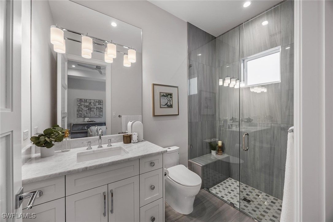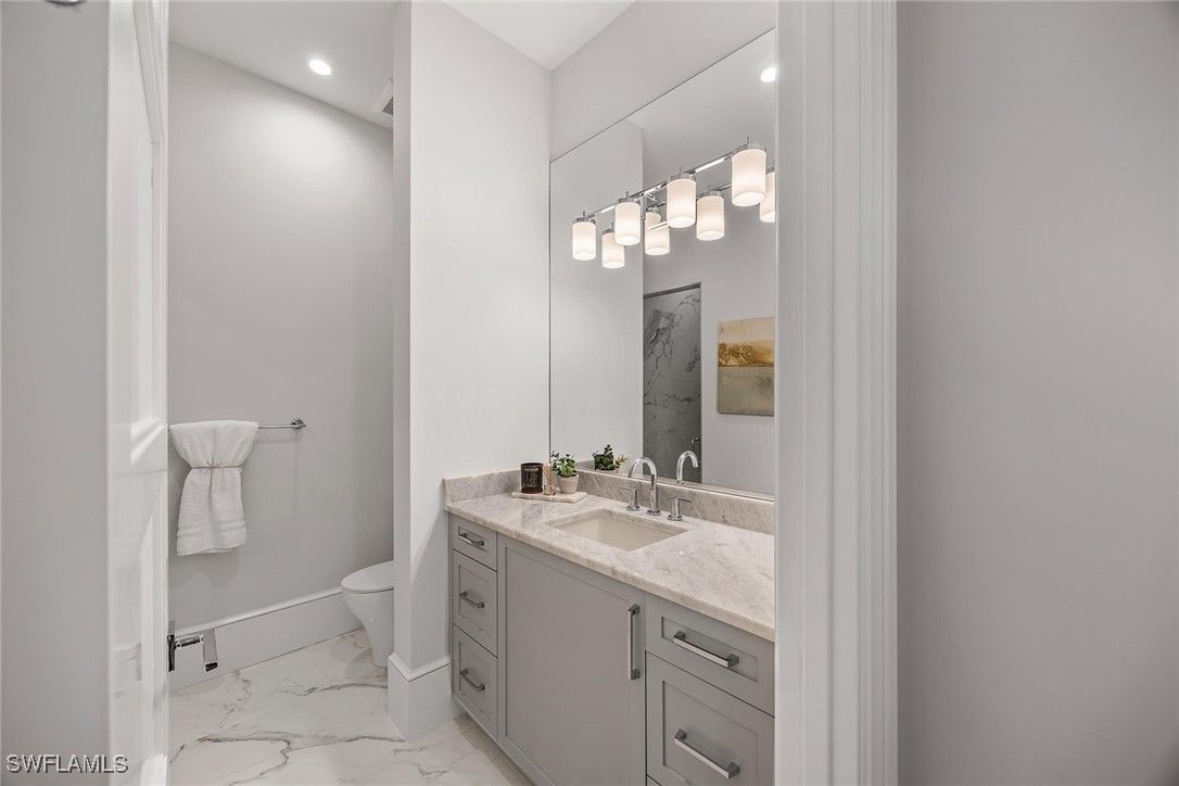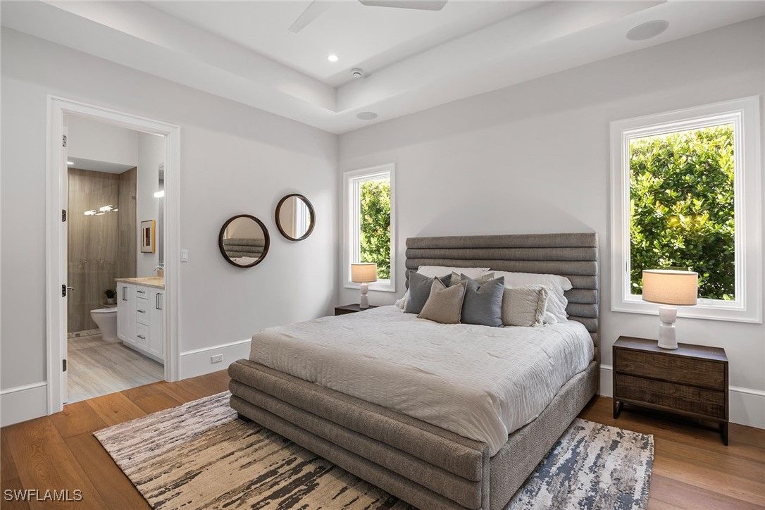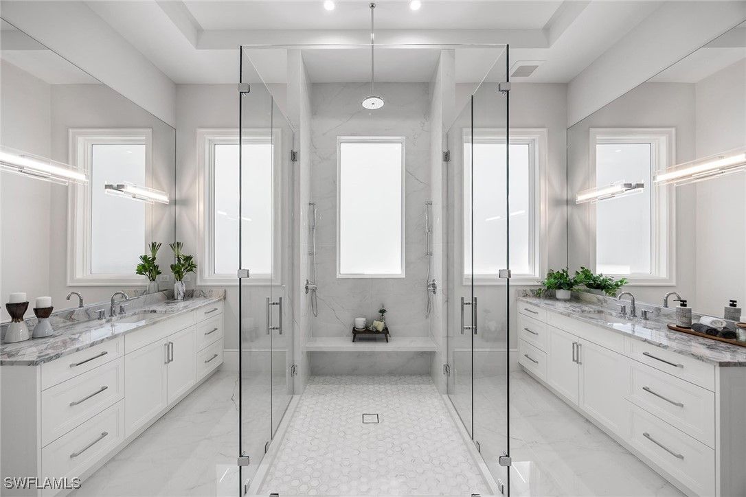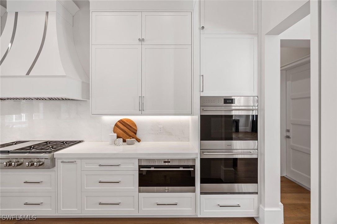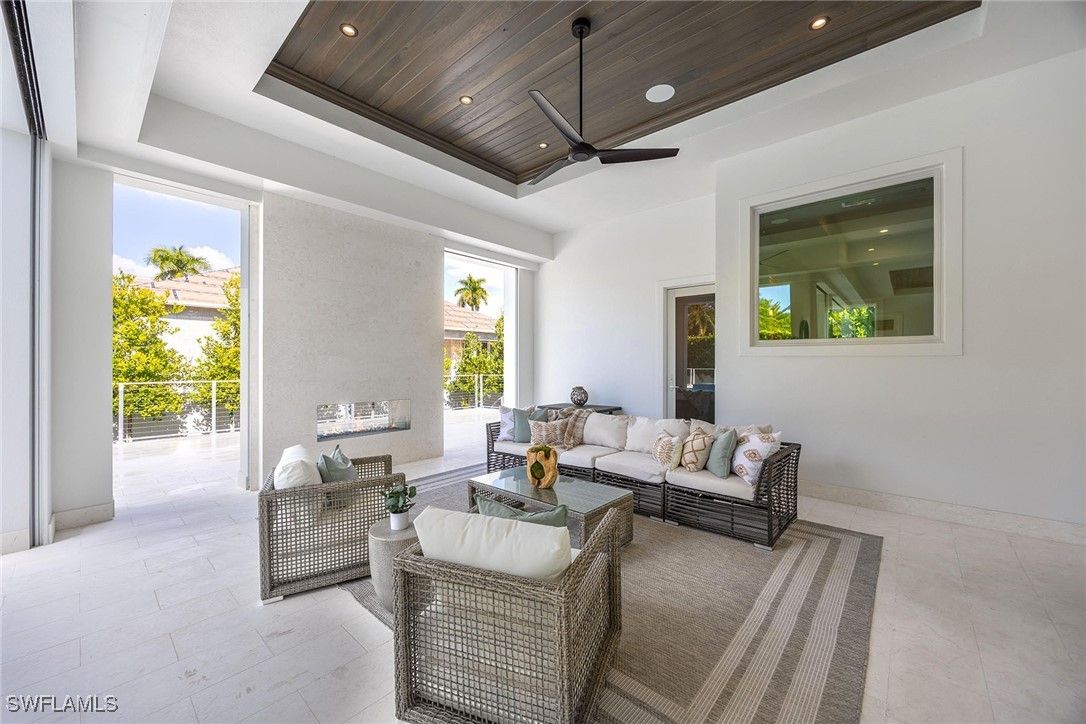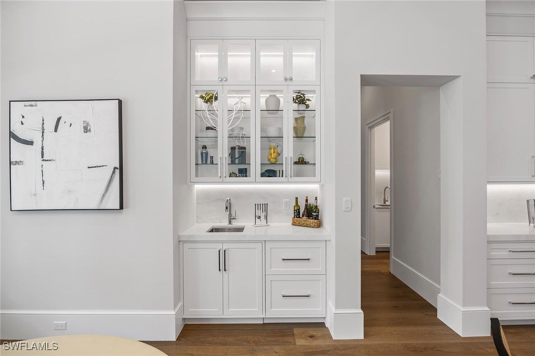 Setting a new benchmark for luxury living, this newly constructed architectural masterpiece is an exceptional offering in the prestigious Moorings neighborhood. Positioned on a tree-lined street with tranquil green space across the way, this sophisticated four-bedroom plus den, 4.5-bath, three-car garage residence delivers an unparalleled blend of elegance, comfort and functionality. From the moment you arrive, the home’s striking curb appeal and 10-foot custom iron entry door set the tone for what lies beyond. The grand foyer welcomes you with abundant natural light, soaring vaulted ceilings and seamless indoor-outdoor transitions. Thoughtfully designed architecture paired with bespoke designer selections by Anna Roze Design Studio make this residence one of a kind. The expansive open floor plan is adorned with 10-inch white oak flooring throughout, custom solid wood cabinetry and doors, and curated designer lighting. A spacious and inviting leisure room creates a setting for intimate gatherings and grand entertaining. The chef’s kitchen is a statement of beauty and function, featuring a large marble island with bar seating, white custom cabinetry, and Wolf and Sub-Zero appliances. A charming breakfast nook with a custom built-in bar, mirrored accents, cabinetry and refrigerator drawers adds style and convenience. The adjacent dining area showcases a floor-to-ceiling glass wine room, offering a stunning display ready for your personal collection. The luxurious primary suite is a private retreat overlooking the pool, complete with a spa-inspired bath and generously sized custom closets. Three additional en-suite guest bedrooms, a pool bath, and an elegant powder room provide comfort and privacy for family and guests alike. A beautifully designed office, framed by classic French doors and filled with natural light, offers an ideal work-from-home sanctuary. Outdoor living is equally impressive, designed as a private oasis. Enjoy a saltwater pool and spa, covered dining area with a fully equipped outdoor kitchen, leisure space and fireplace, ideal for entertaining year-round. Whether envisioned as a full-time residence or a seasonal escape, this home offers an extraordinary lifestyle. Go to or take a golf cart ride to Venetian Village Shops for world-class dining, enjoy a short drive to Fifth Avenue and take advantage of exclusive Moorings private beach access, all just moments from your door!
