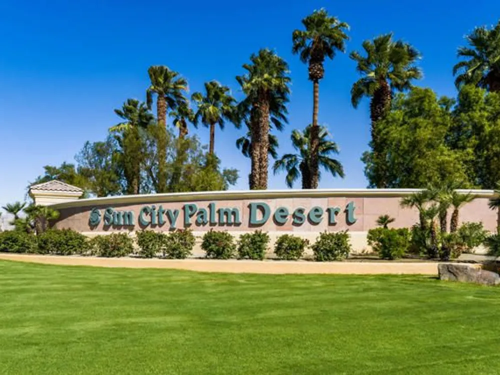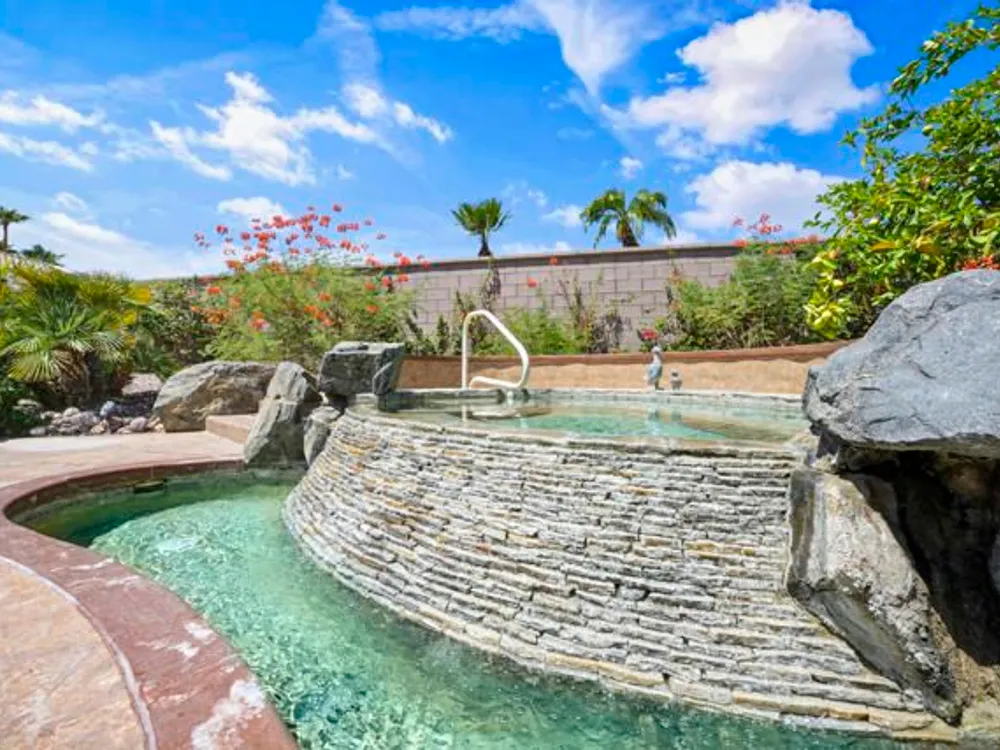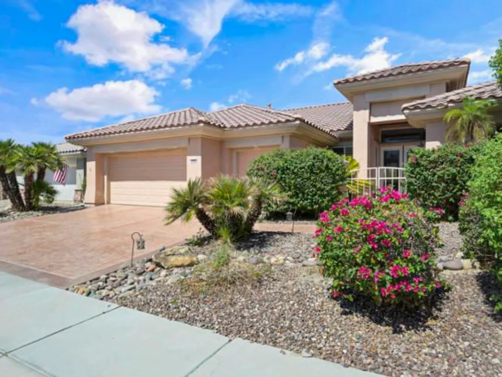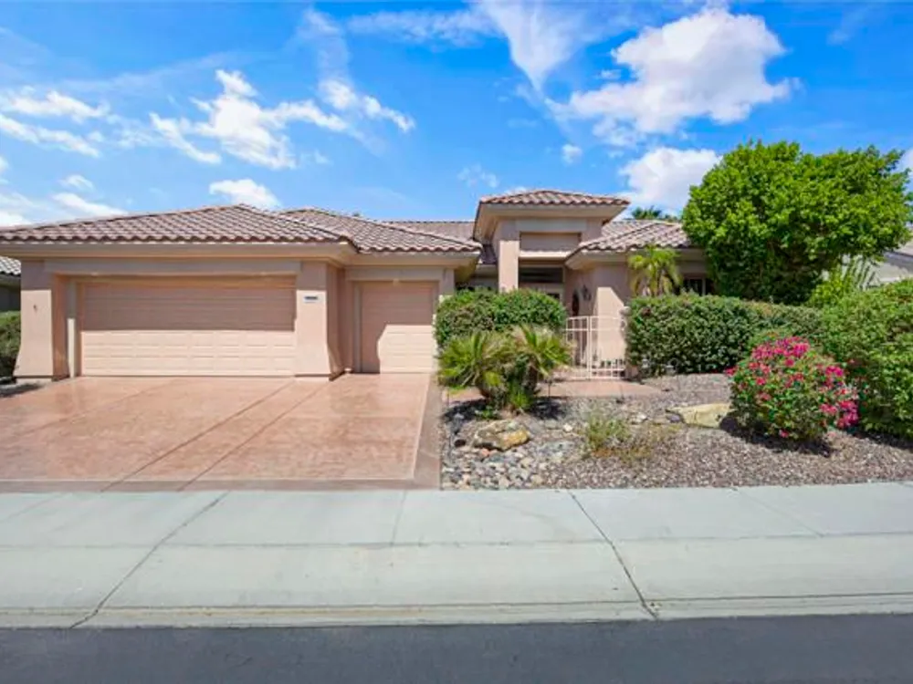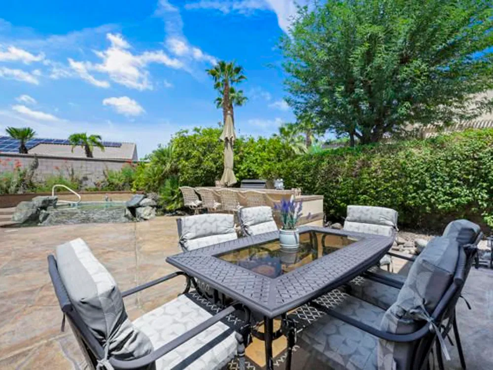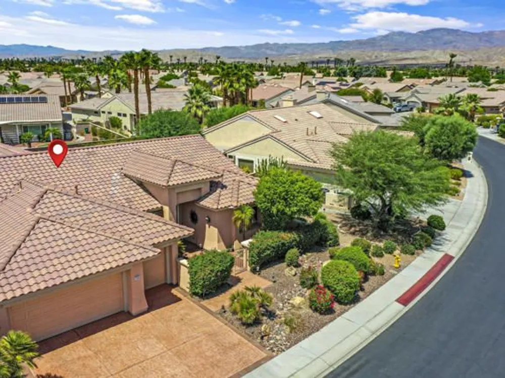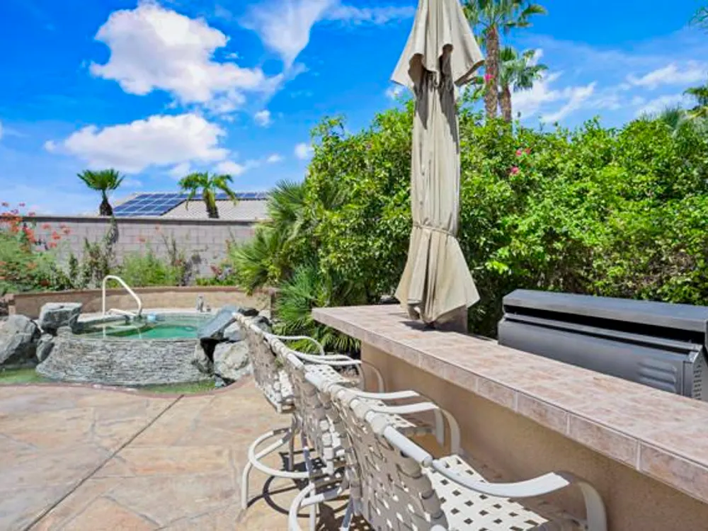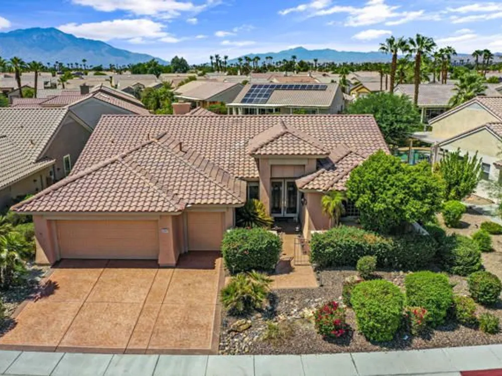 Sophisticated San Remo Estate Model on Premium Lot! Step into refined desert living with this San Remo floor plan Estate model, offering 2,432 sq. ft. of well-designed space on a premium 9,583 sq. ft. lot. Built in 1999, this residence blends timeless elegance with modern updates, creating the perfect retreat in the heart of Sun City Palm Desert. A grand double-door entry welcomes you into a home filled with natural light. The formal dining room and living area are ideal for entertaining, while the open-concept great room boasts a custom built-in entertainment center, a cozy fireplace, and expansive windows framing the stunning backyard oasis. The chef's kitchen is a true showstopper--featuring crisp white cabinetry, a designer backsplash, sleek black appliances, stylish pendant lighting, and bar seating. Whether preparing an intimate meal or hosting friends, this kitchen strikes the perfect balance of function and style. There is tile flooring with detailed border patterns in the main living spaces and luxury vinyl plank in the bedrooms, offering durability and warmth. The primary suite is a private sanctuary with direct patio access and a spa-like bath featuring dual vanities, a soaking tub, walk-in shower, and abundant storage. Two guest bedrooms and an additional full bath provide comfort for visitors, while a dedicated office with custom built-ins offers the flexibility to work from home with ease. Step outside to your own desert paradise--a spacious covered patio anchors multiple lounging and dining areas, complete with a built-in BBQ bar. A sparkling spa with stone surround and cascading waterfall is set among mature landscaping, providing both privacy and beauty for year-round enjoyment. You'll love the orange, lime and grapefruit trees in your backyard oasis. A 2-car plus golf cart garage completes this exceptional home, located in one of the desert's premier 55+ communities, where world-class amenities and vibrant social opportunities await. As a resident of Sun City Palm Desert, you'll enjoy access to two championship golf courses, three clubhouses, two fitness centers, an indoor pool and outdoor pools, pickleball and tennis courts, and a vibrant social calendar. Experience the best of resort-style living in Sun City Palm Desert--this is the desert retreat you've been waiting for!