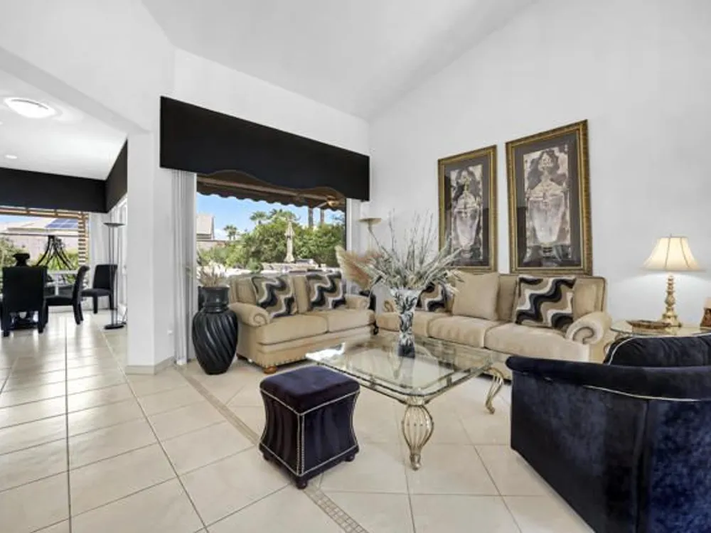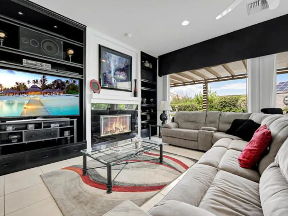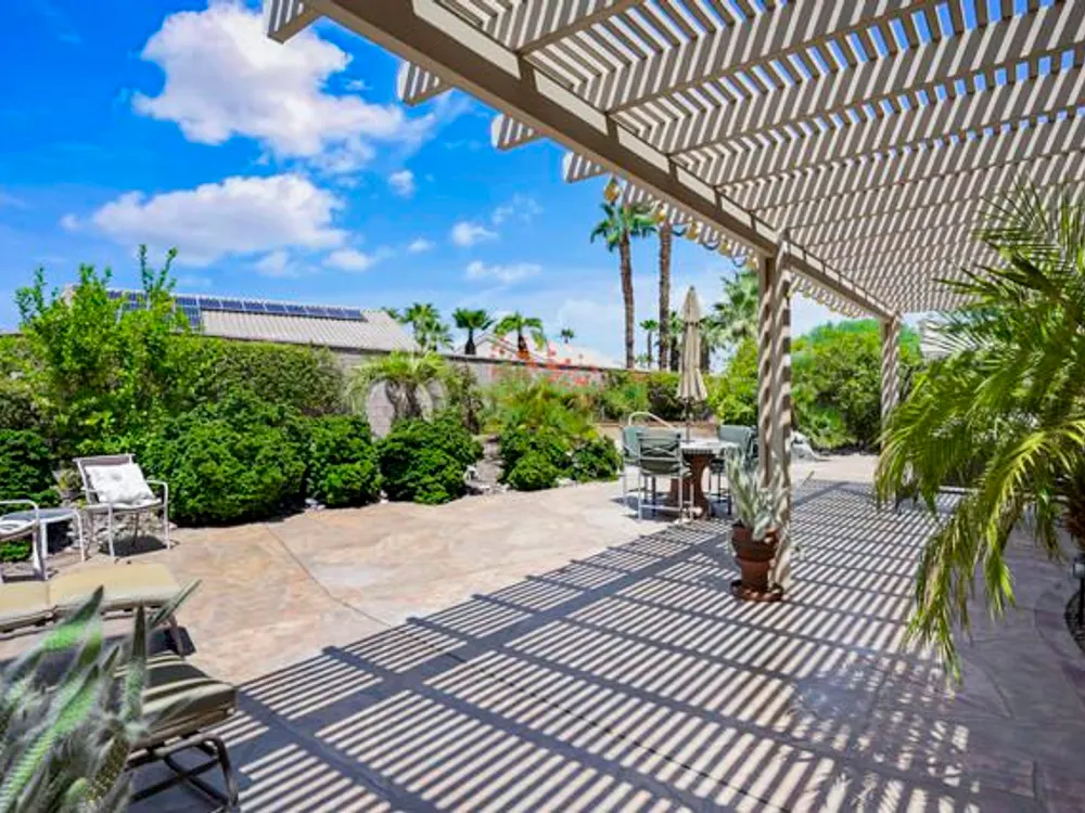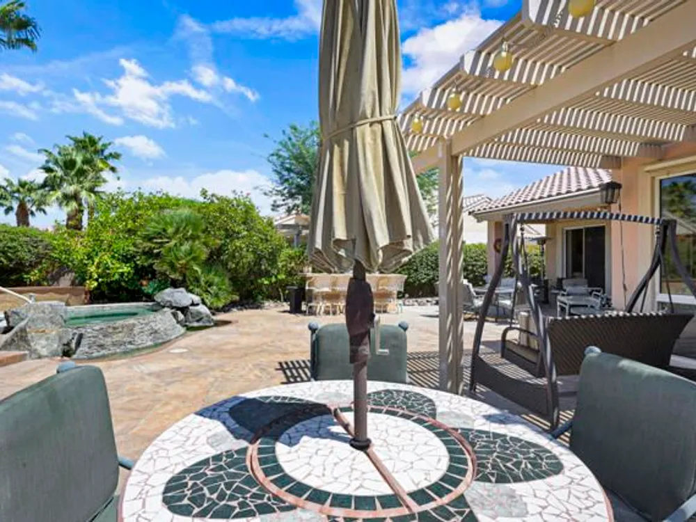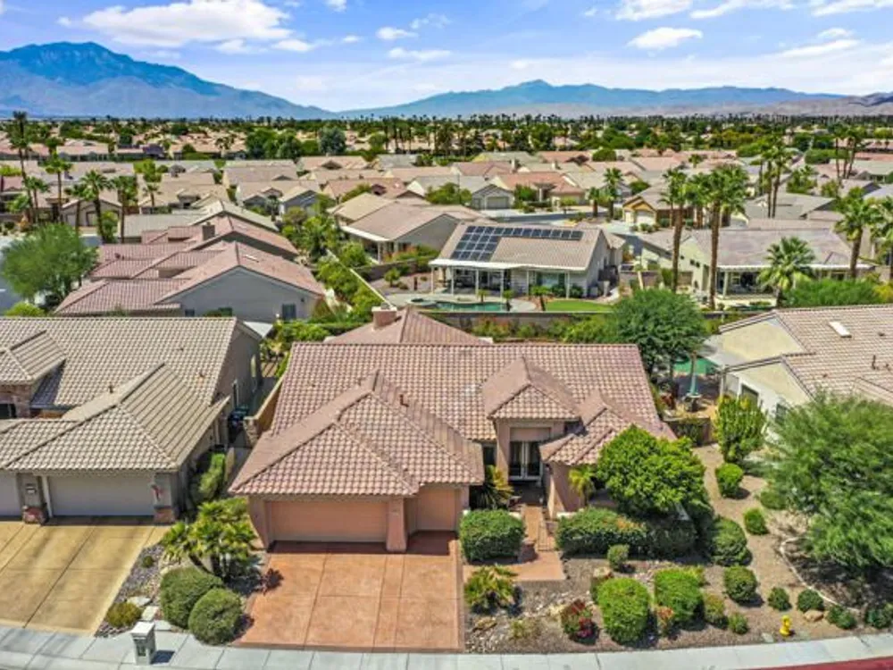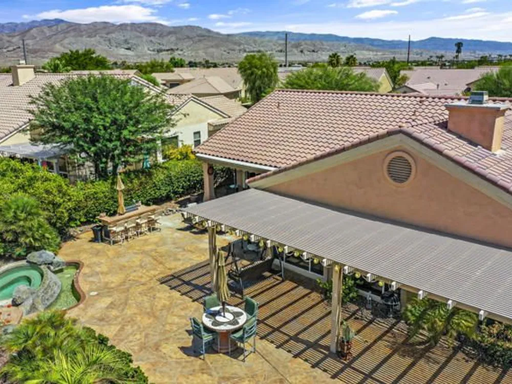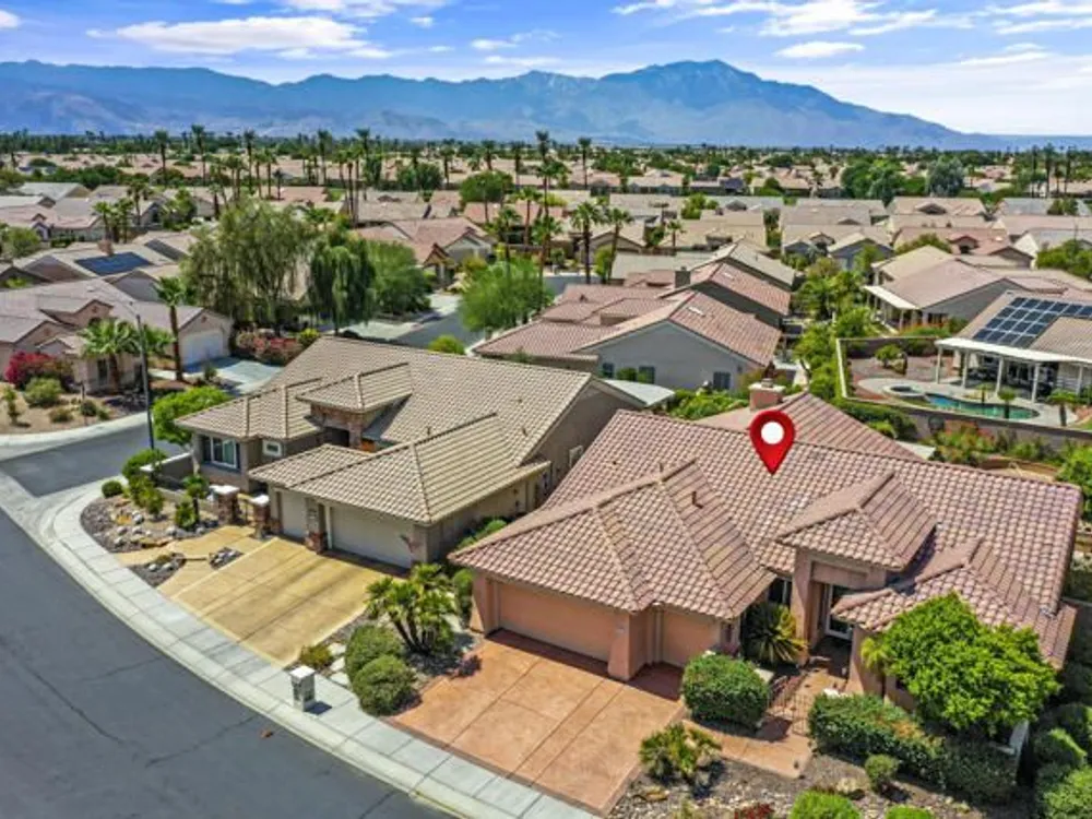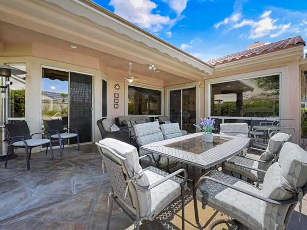 Sophisticated San Remo Estate Model on Premium Lot! Step into refined desert living with this San Remo floor plan Estate model, offering 2,432 sq. ft. of well-designed space on a premium 9,583 sq. ft. lot. Built in 1999, this residence blends timeless elegance with modern updates, creating the perfect retreat in the heart of Sun City Palm Desert. A grand double-door entry welcomes you into a home filled with natural light. The formal dining room and living area are ideal for entertaining, while the open-concept great room boasts a custom built-in entertainment center, a cozy fireplace, and expansive windows framing the stunning backyard oasis. The chef's kitchen is a true showstopper--featuring crisp white cabinetry, a designer backsplash, sleek black appliances, stylish pendant lighting, and bar seating. Whether preparing an intimate meal or hosting friends, this kitchen strikes the perfect balance of function and style. There is tile flooring with detailed border patterns in the main living spaces and luxury vinyl plank in the bedrooms, offering durability and warmth. The primary suite is a private sanctuary with direct patio access and a spa-like bath featuring dual vanities, a soaking tub, walk-in shower, and abundant storage. Two guest bedrooms and an additional full bath provide comfort for visitors, while a dedicated office with custom built-ins offers the flexibility to work from home with ease. Step outside to your own desert paradise--a spacious covered patio anchors multiple lounging and dining areas, complete with a built-in BBQ bar. A sparkling spa with stone surround and cascading waterfall is set among mature landscaping, providing both privacy and beauty for year-round enjoyment. You'll love the orange, lime and grapefruit trees in your backyard oasis. A 2-car plus golf cart garage completes this exceptional home, located in one of the desert's premier 55+ communities, where world-class amenities and vibrant social opportunities await. As a resident of Sun City Palm Desert, you'll enjoy access to two championship golf courses, three clubhouses, two fitness centers, an indoor pool and outdoor pools, pickleball and tennis courts, and a vibrant social calendar. Experience the best of resort-style living in Sun City Palm Desert--this is the desert retreat you've been waiting for!