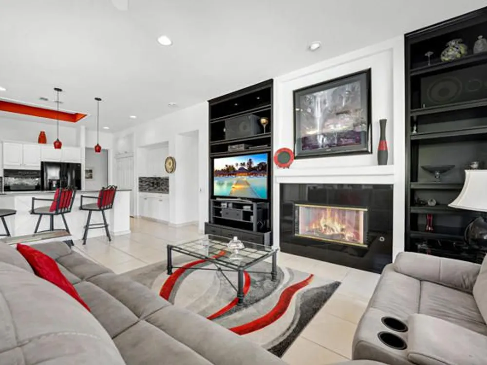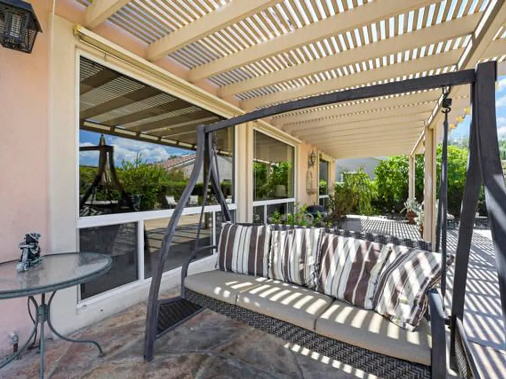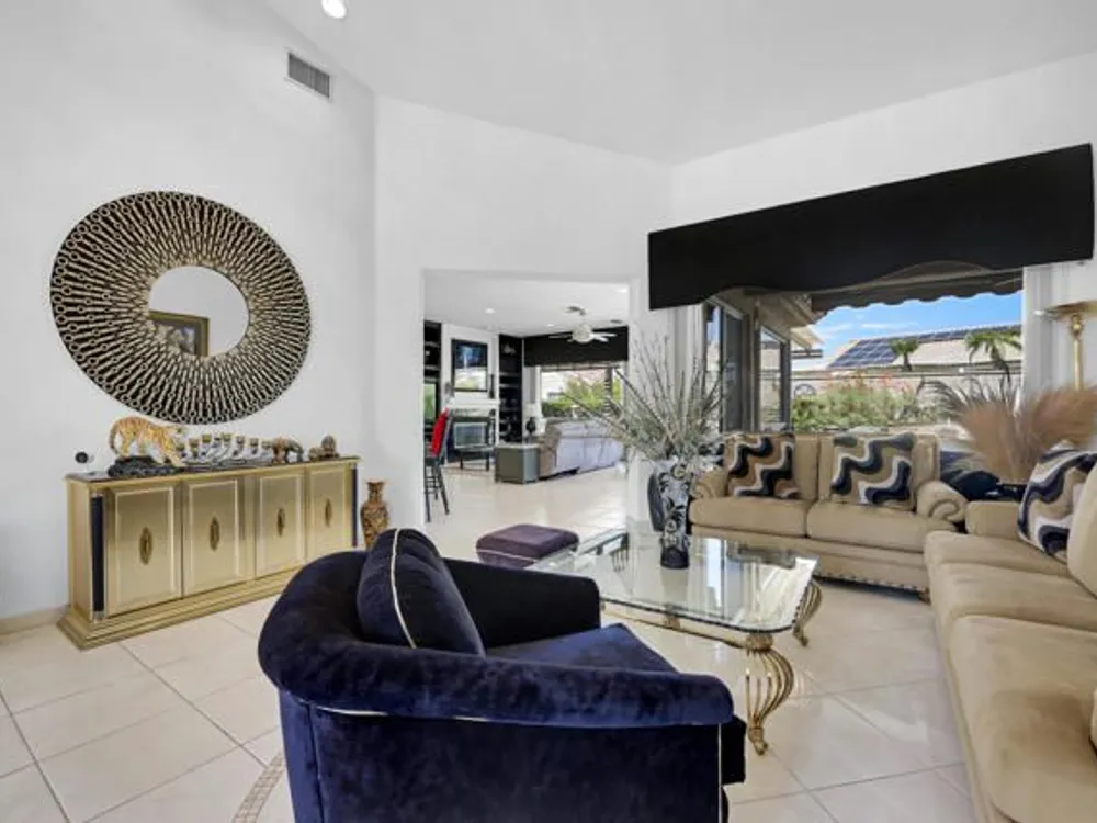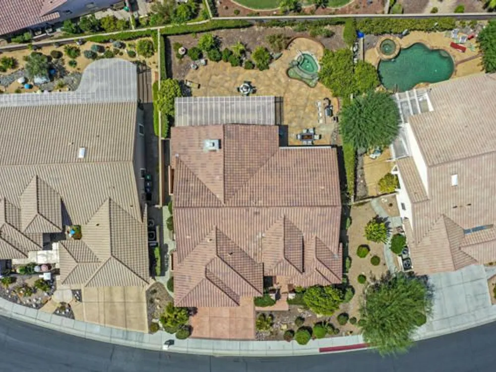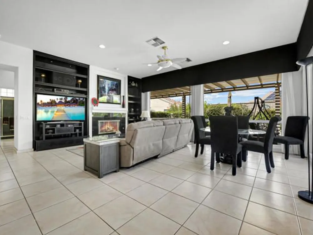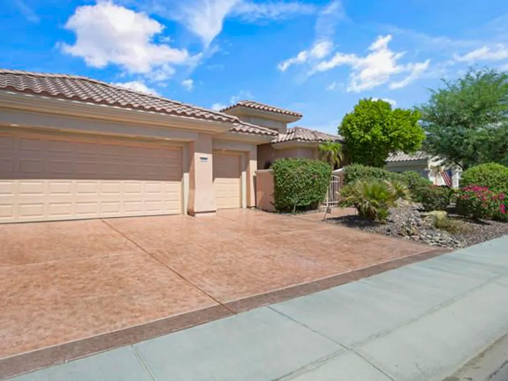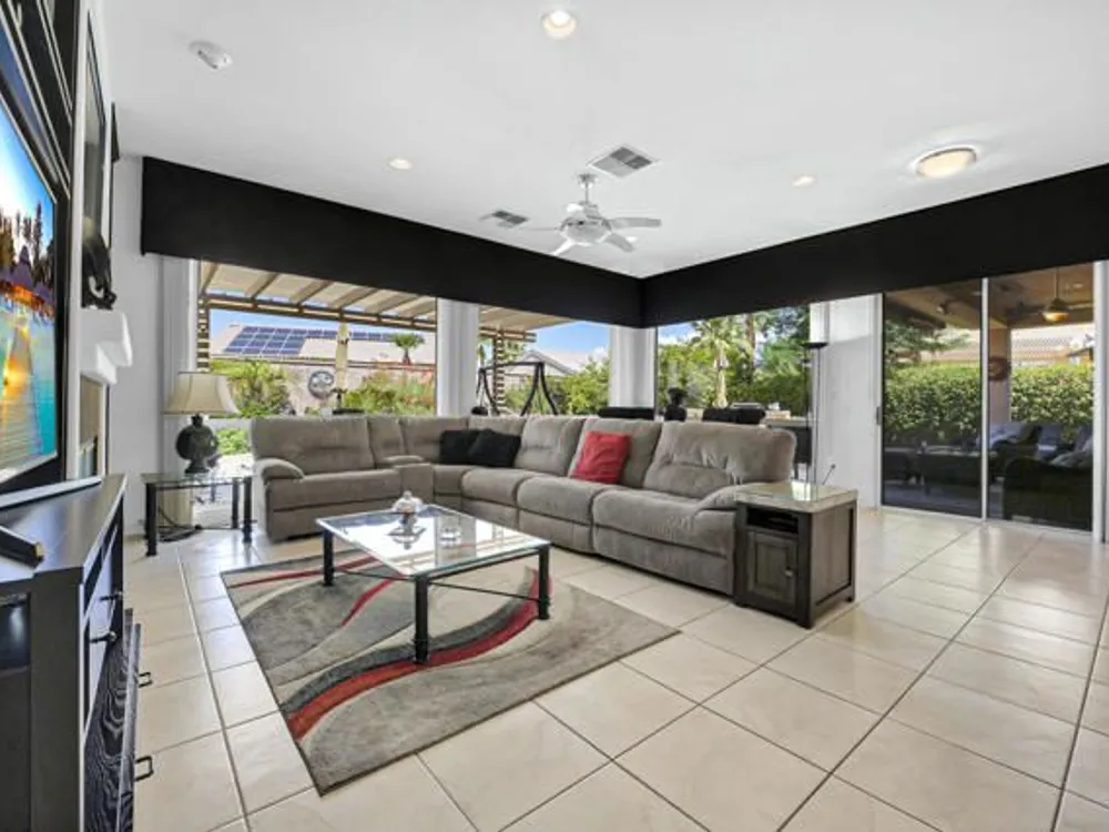 Sophisticated San Remo Estate Model on Premium Lot! Step into refined desert living with this San Remo floor plan Estate model, offering 2,432 sq. ft. of well-designed space on a premium 9,583 sq. ft. lot. Built in 1999, this residence blends timeless elegance with modern updates, creating the perfect retreat in the heart of Sun City Palm Desert. A grand double-door entry welcomes you into a home filled with natural light. The formal dining room and living area are ideal for entertaining, while the open-concept great room boasts a custom built-in entertainment center, a cozy fireplace, and expansive windows framing the stunning backyard oasis. The chef's kitchen is a true showstopper--featuring crisp white cabinetry, a designer backsplash, sleek black appliances, stylish pendant lighting, and bar seating. Whether preparing an intimate meal or hosting friends, this kitchen strikes the perfect balance of function and style. There is tile flooring with detailed border patterns in the main living spaces and luxury vinyl plank in the bedrooms, offering durability and warmth. The primary suite is a private sanctuary with direct patio access and a spa-like bath featuring dual vanities, a soaking tub, walk-in shower, and abundant storage. Two guest bedrooms and an additional full bath provide comfort for visitors, while a dedicated office with custom built-ins offers the flexibility to work from home with ease. Step outside to your own desert paradise--a spacious covered patio anchors multiple lounging and dining areas, complete with a built-in BBQ bar. A sparkling spa with stone surround and cascading waterfall is set among mature landscaping, providing both privacy and beauty for year-round enjoyment. You'll love the orange, lime and grapefruit trees in your backyard oasis. A 2-car plus golf cart garage completes this exceptional home, located in one of the desert's premier 55+ communities, where world-class amenities and vibrant social opportunities await. As a resident of Sun City Palm Desert, you'll enjoy access to two championship golf courses, three clubhouses, two fitness centers, an indoor pool and outdoor pools, pickleball and tennis courts, and a vibrant social calendar. Experience the best of resort-style living in Sun City Palm Desert--this is the desert retreat you've been waiting for!