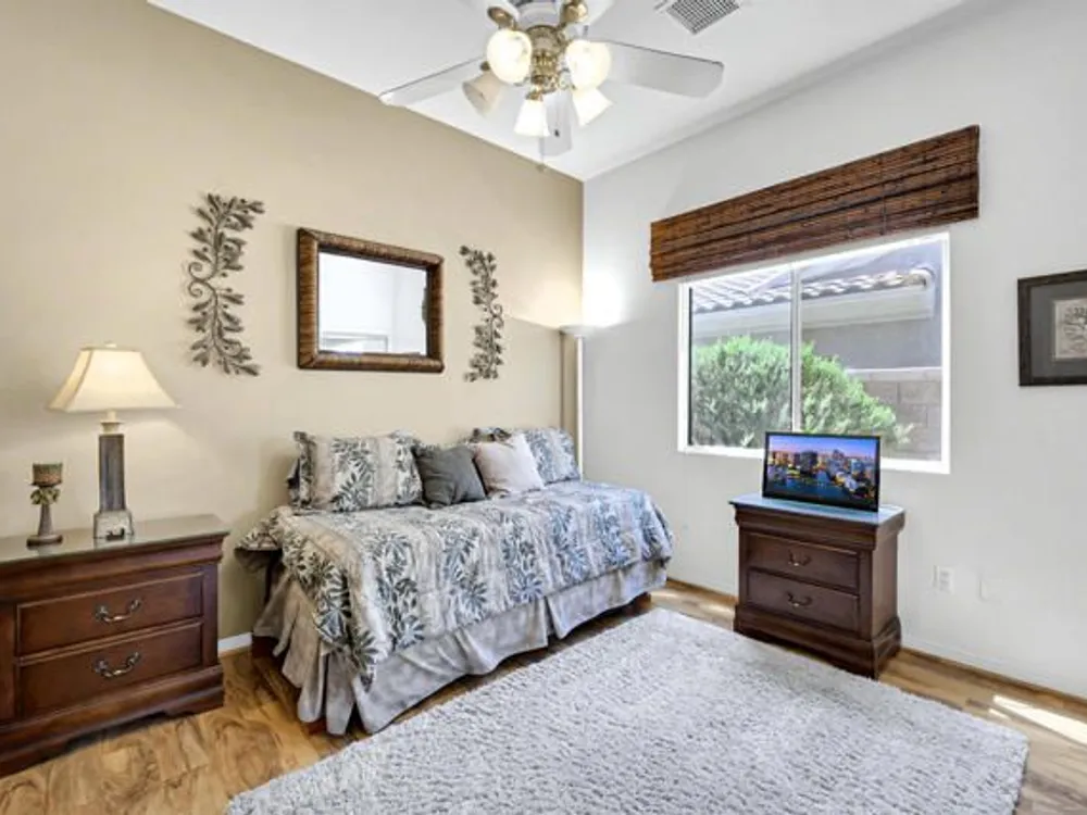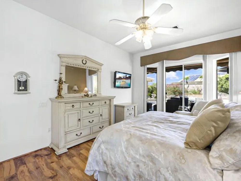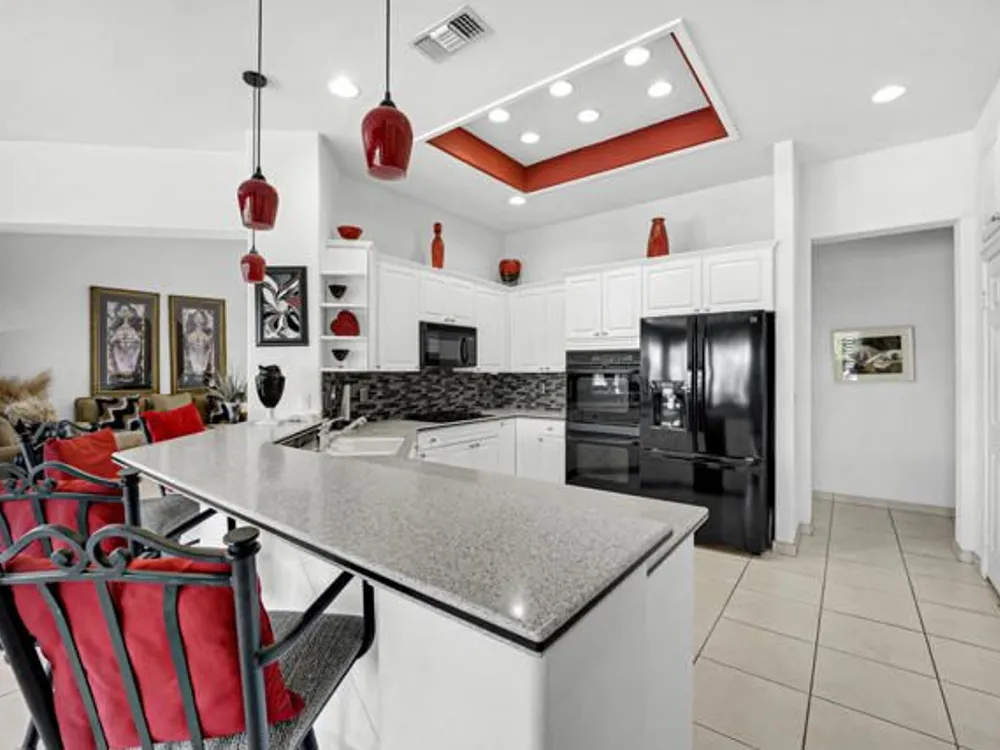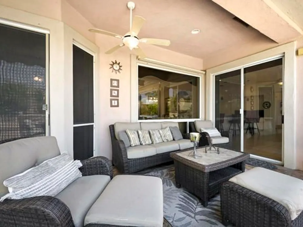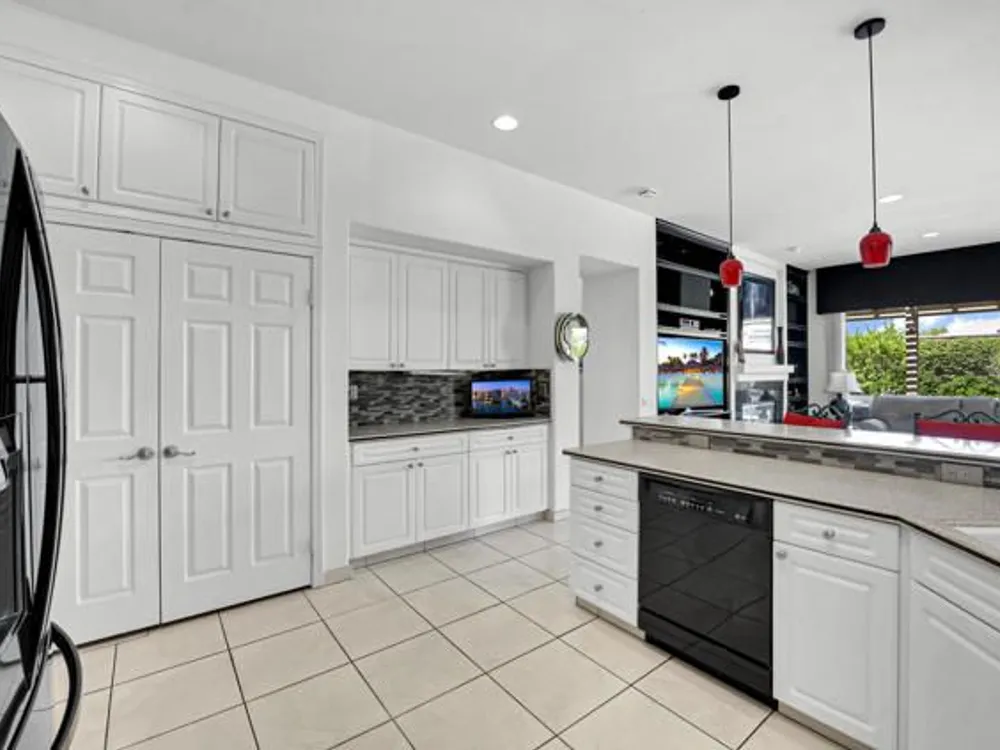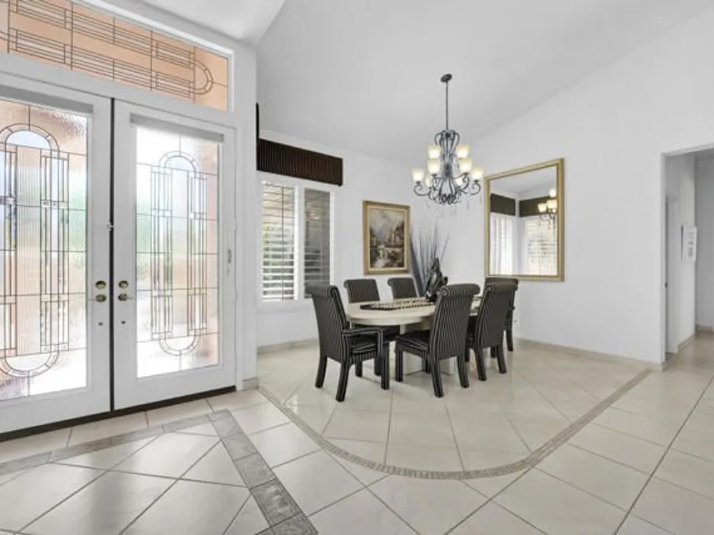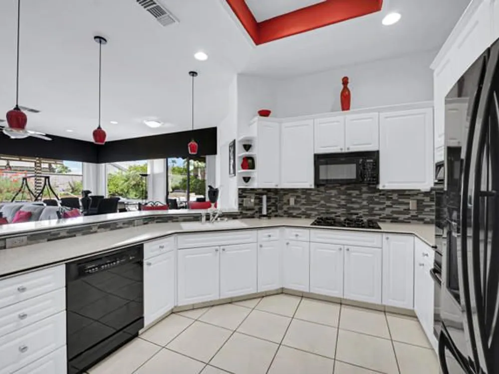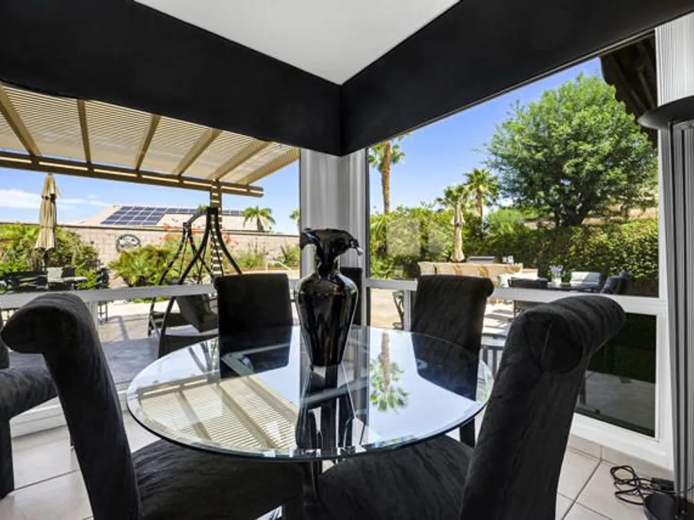 Sophisticated San Remo Estate Model on Premium Lot! Step into refined desert living with this San Remo floor plan Estate model, offering 2,432 sq. ft. of well-designed space on a premium 9,583 sq. ft. lot. Built in 1999, this residence blends timeless elegance with modern updates, creating the perfect retreat in the heart of Sun City Palm Desert. A grand double-door entry welcomes you into a home filled with natural light. The formal dining room and living area are ideal for entertaining, while the open-concept great room boasts a custom built-in entertainment center, a cozy fireplace, and expansive windows framing the stunning backyard oasis. The chef's kitchen is a true showstopper--featuring crisp white cabinetry, a designer backsplash, sleek black appliances, stylish pendant lighting, and bar seating. Whether preparing an intimate meal or hosting friends, this kitchen strikes the perfect balance of function and style. There is tile flooring with detailed border patterns in the main living spaces and luxury vinyl plank in the bedrooms, offering durability and warmth. The primary suite is a private sanctuary with direct patio access and a spa-like bath featuring dual vanities, a soaking tub, walk-in shower, and abundant storage. Two guest bedrooms and an additional full bath provide comfort for visitors, while a dedicated office with custom built-ins offers the flexibility to work from home with ease. Step outside to your own desert paradise--a spacious covered patio anchors multiple lounging and dining areas, complete with a built-in BBQ bar. A sparkling spa with stone surround and cascading waterfall is set among mature landscaping, providing both privacy and beauty for year-round enjoyment. You'll love the orange, lime and grapefruit trees in your backyard oasis. A 2-car plus golf cart garage completes this exceptional home, located in one of the desert's premier 55+ communities, where world-class amenities and vibrant social opportunities await. As a resident of Sun City Palm Desert, you'll enjoy access to two championship golf courses, three clubhouses, two fitness centers, an indoor pool and outdoor pools, pickleball and tennis courts, and a vibrant social calendar. Experience the best of resort-style living in Sun City Palm Desert--this is the desert retreat you've been waiting for!