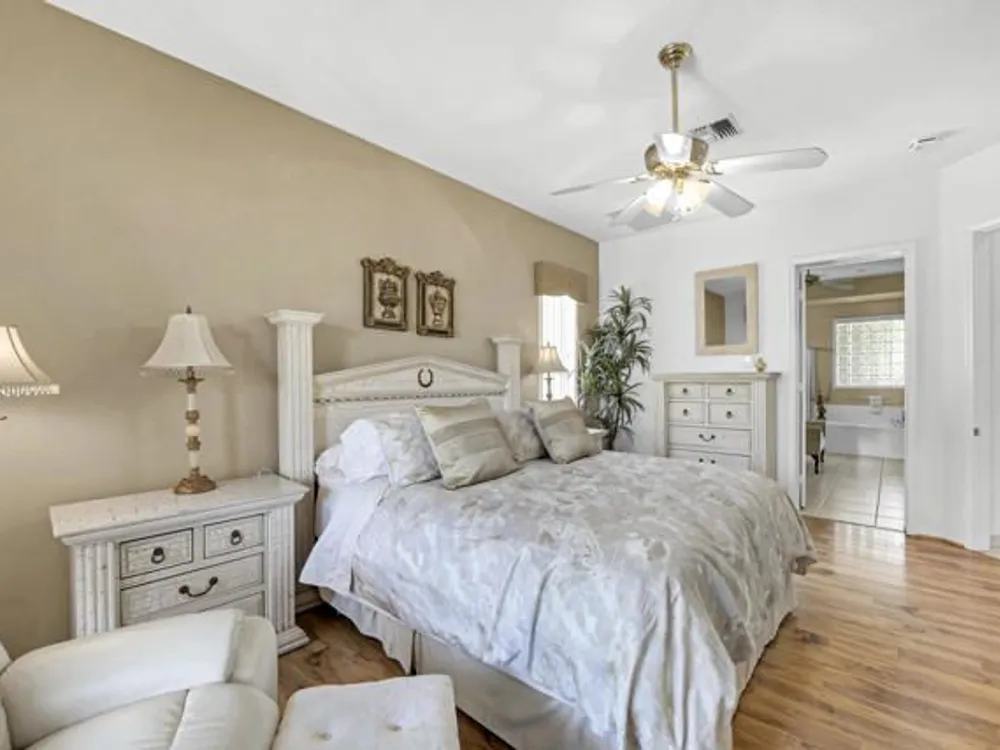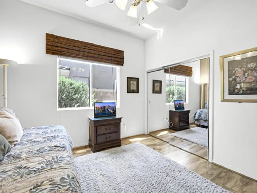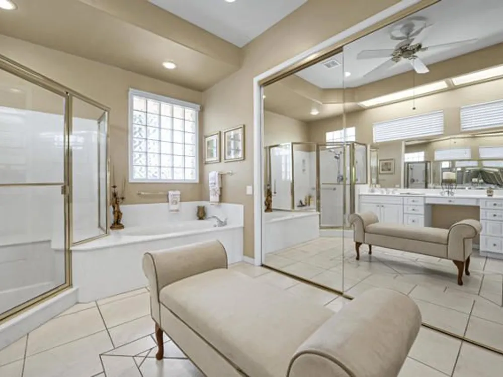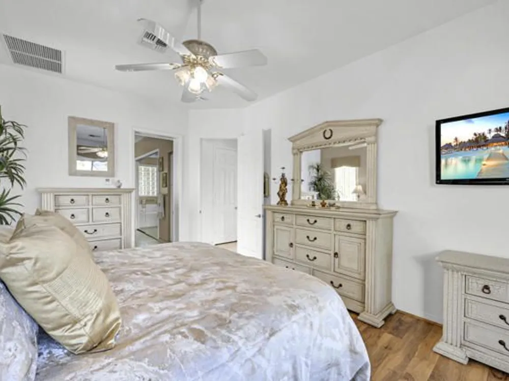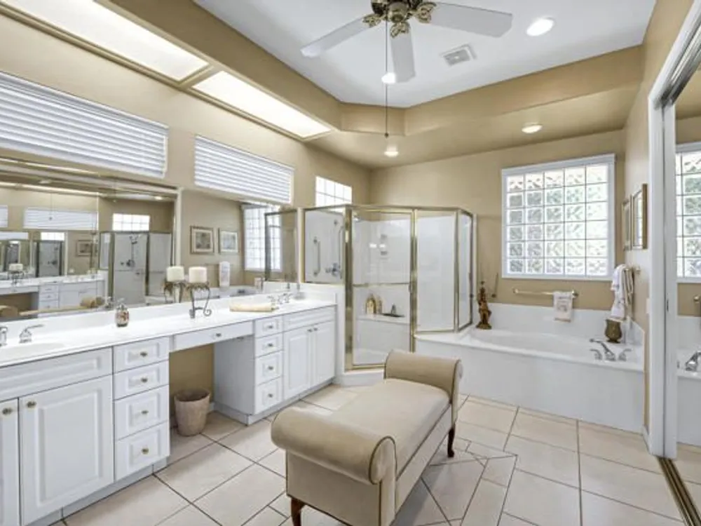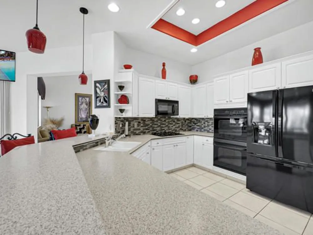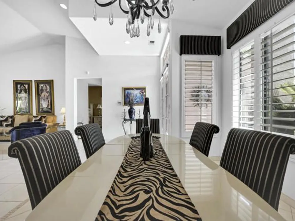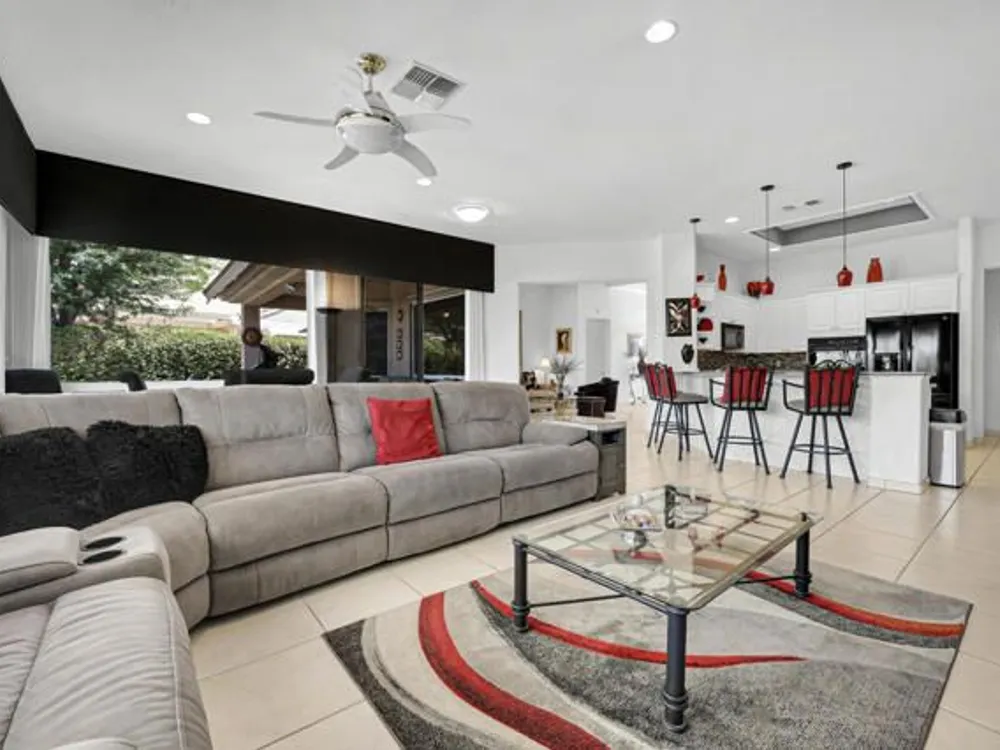 Sophisticated San Remo Estate Model on Premium Lot! Step into refined desert living with this San Remo floor plan Estate model, offering 2,432 sq. ft. of well-designed space on a premium 9,583 sq. ft. lot. Built in 1999, this residence blends timeless elegance with modern updates, creating the perfect retreat in the heart of Sun City Palm Desert. A grand double-door entry welcomes you into a home filled with natural light. The formal dining room and living area are ideal for entertaining, while the open-concept great room boasts a custom built-in entertainment center, a cozy fireplace, and expansive windows framing the stunning backyard oasis. The chef's kitchen is a true showstopper--featuring crisp white cabinetry, a designer backsplash, sleek black appliances, stylish pendant lighting, and bar seating. Whether preparing an intimate meal or hosting friends, this kitchen strikes the perfect balance of function and style. There is tile flooring with detailed border patterns in the main living spaces and luxury vinyl plank in the bedrooms, offering durability and warmth. The primary suite is a private sanctuary with direct patio access and a spa-like bath featuring dual vanities, a soaking tub, walk-in shower, and abundant storage. Two guest bedrooms and an additional full bath provide comfort for visitors, while a dedicated office with custom built-ins offers the flexibility to work from home with ease. Step outside to your own desert paradise--a spacious covered patio anchors multiple lounging and dining areas, complete with a built-in BBQ bar. A sparkling spa with stone surround and cascading waterfall is set among mature landscaping, providing both privacy and beauty for year-round enjoyment. You'll love the orange, lime and grapefruit trees in your backyard oasis. A 2-car plus golf cart garage completes this exceptional home, located in one of the desert's premier 55+ communities, where world-class amenities and vibrant social opportunities await. As a resident of Sun City Palm Desert, you'll enjoy access to two championship golf courses, three clubhouses, two fitness centers, an indoor pool and outdoor pools, pickleball and tennis courts, and a vibrant social calendar. Experience the best of resort-style living in Sun City Palm Desert--this is the desert retreat you've been waiting for!