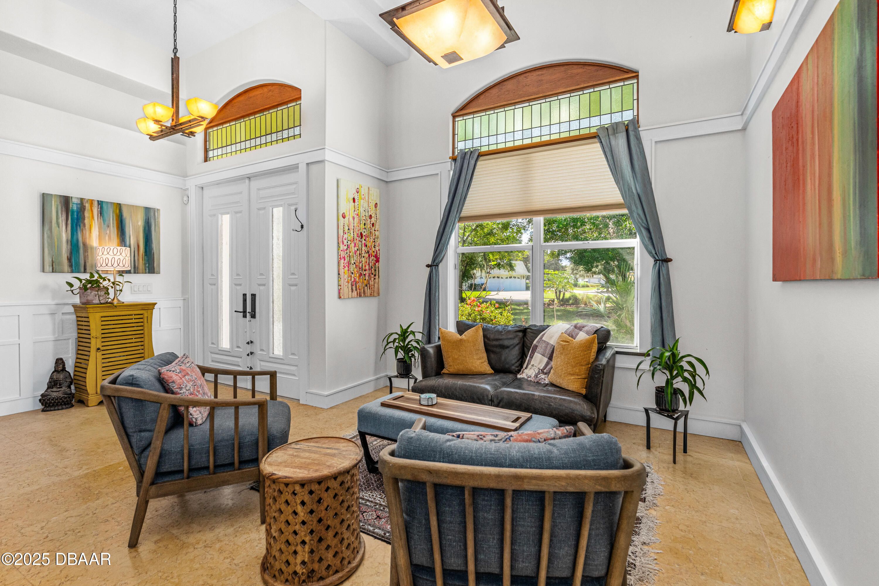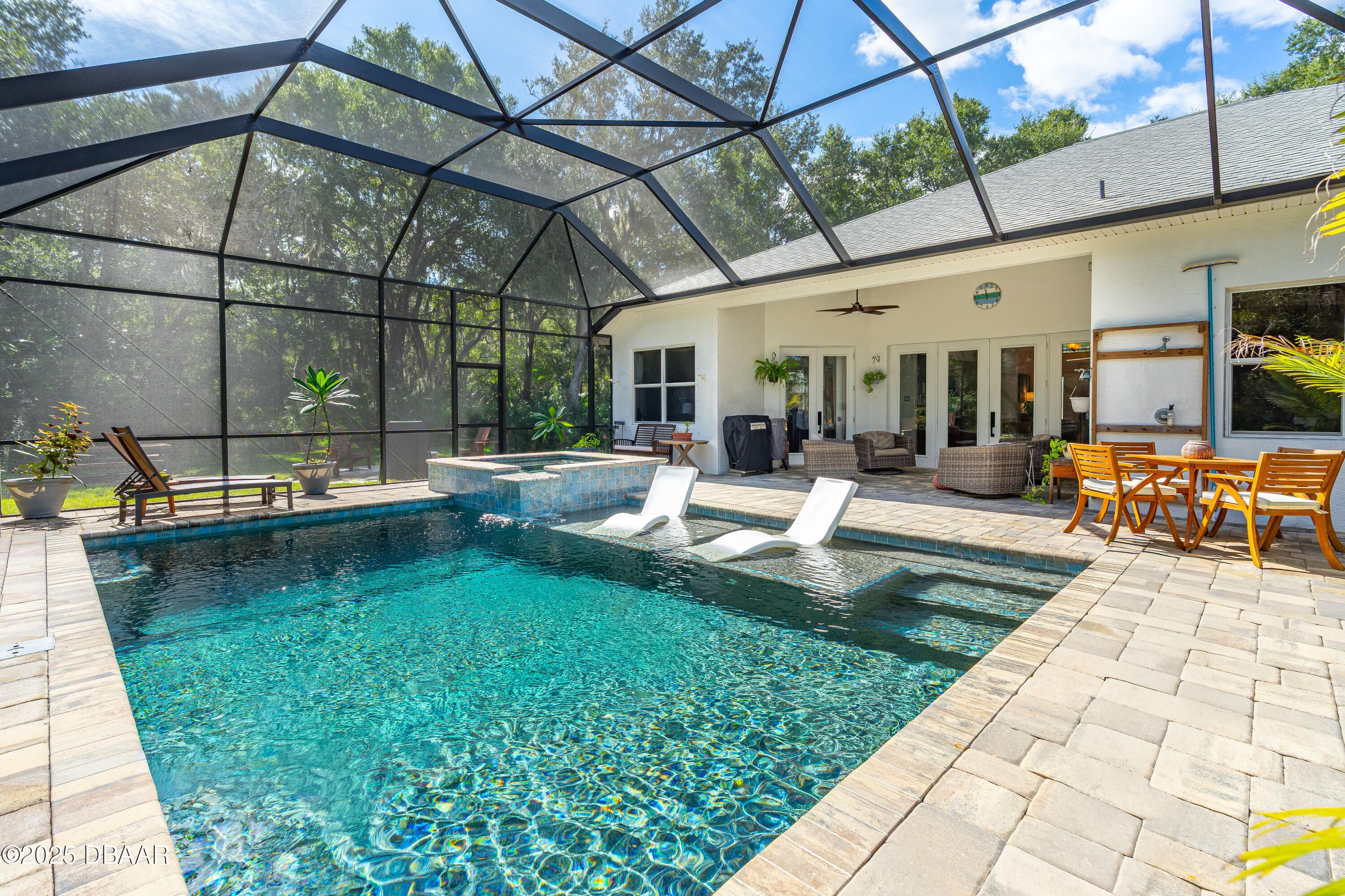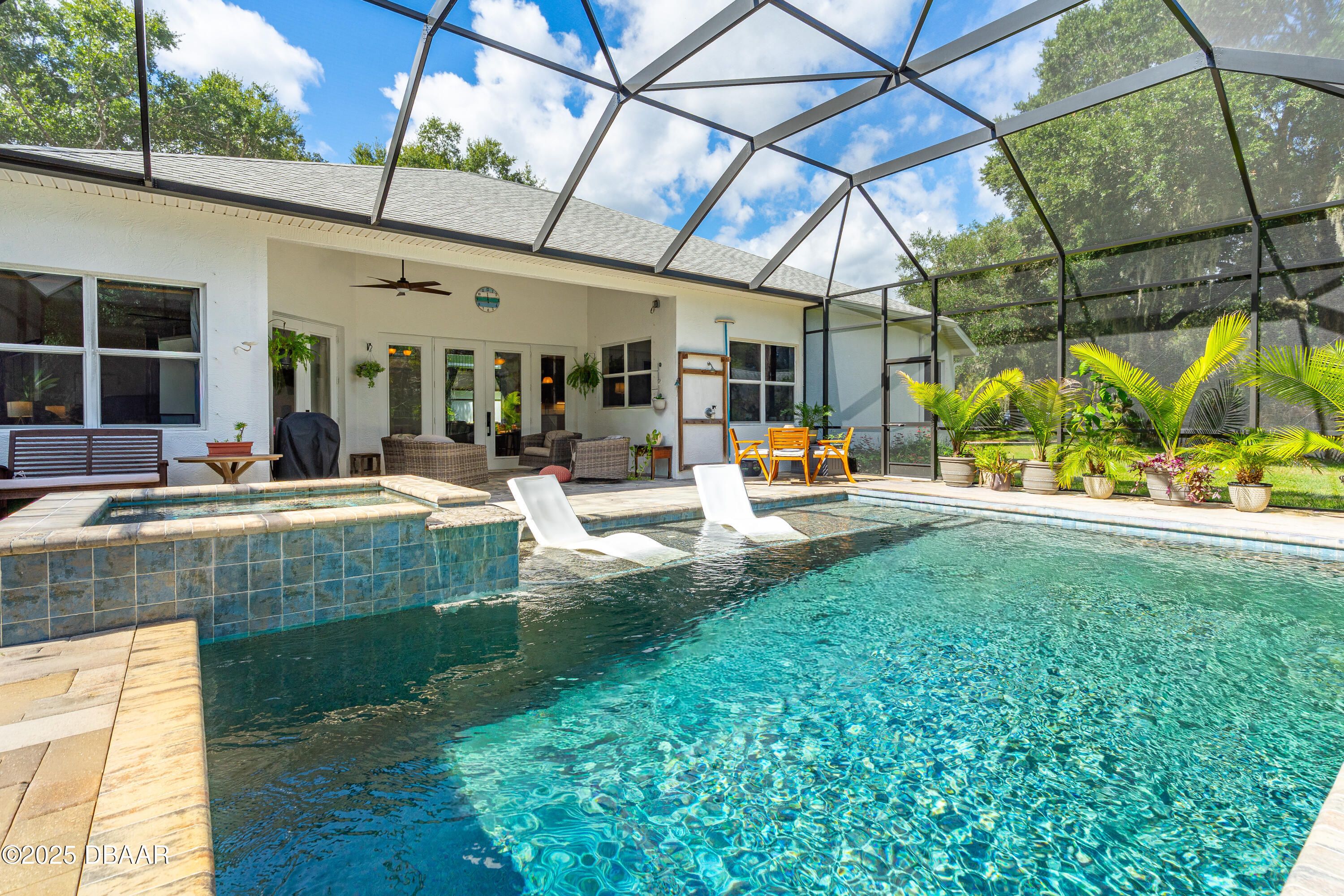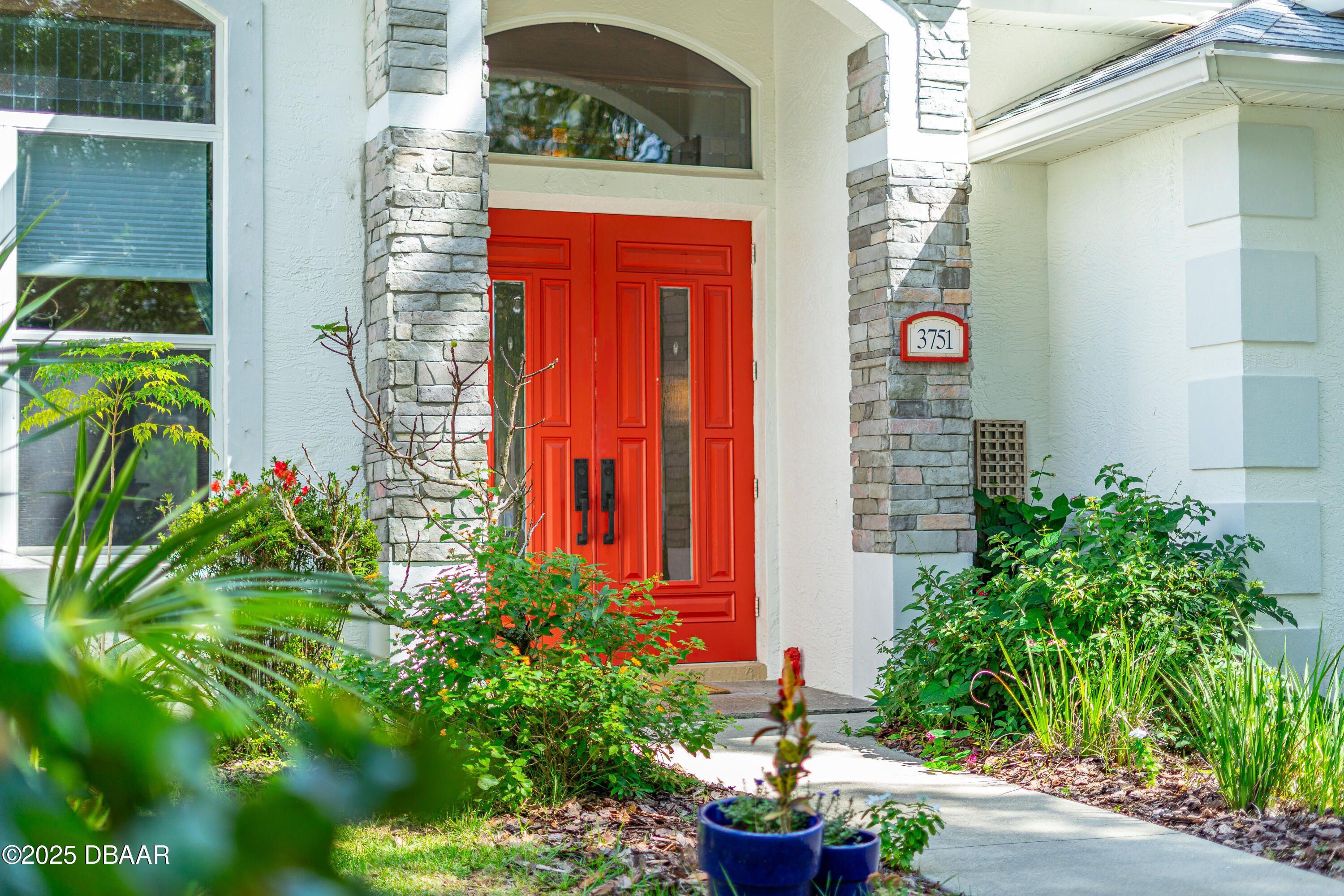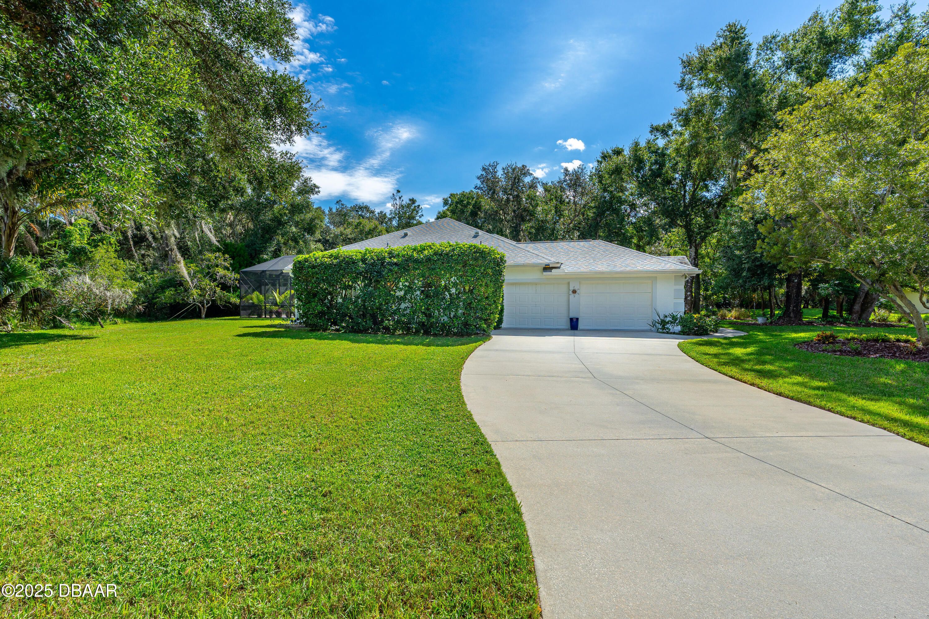 Stunning Halifax Plantation golf course custom pool home on a huge and private ¾ acre corner lot the 6th tee. Limestone flooring welcomes you into this expansive, light-filled home with a beautiful wood trim package and turn of the century stained glass windows. Custom hickory cabinetry and doors with Emtek Arts and Crafts bronze hardware throughout. Extensive MIII Pack and Minka Lavery Bronze Lighting w/Murano Glass throughout home. You will love the chef's dream gourmet kitchen with 42'' hickory cabinets with water mark glass, level 8 granite and stainless appliances with large eat-in area with built-ins and formal dining room. Large master bedroom features a sitting area, trey ceilings, his and hers walk-in closets and large ensuite bathroom with dual vanities, large soaker tub plus walk-in shower. The outside oasis feels like you are on vacation with new in 2023 fully automated saltwater heated and enclosed pebbletec resort style pool with large sun shelf and heated spa. Covered sitting area looks out over private back yard with citrus trees and fire pit area. Other upgrades include new roof 2021, fresh paint inside and out, shark coated garage floors in the oversized garage, stone sills on all the windows and new ceiling fans throughout. You will feel protected with a home warranty in place. Hurry before this gem is gone.
