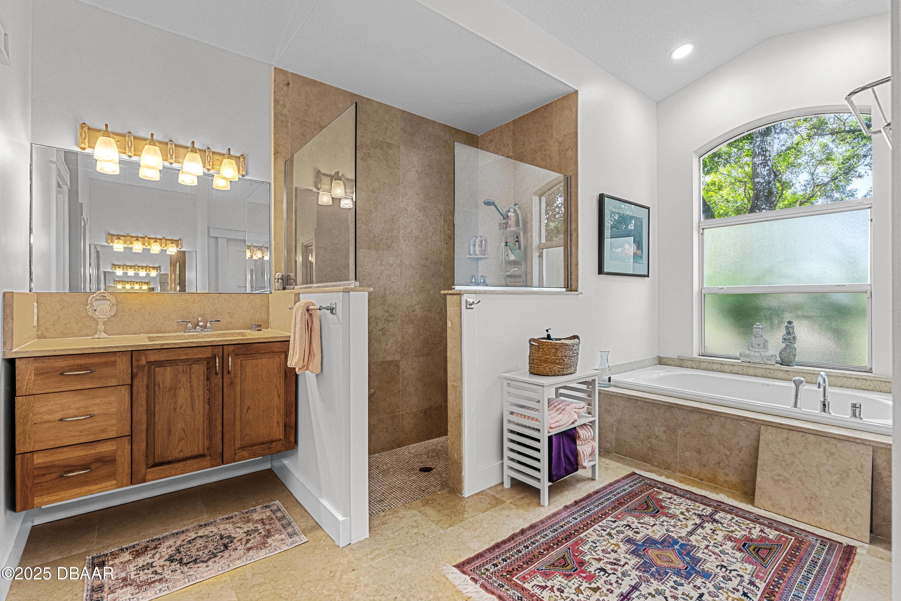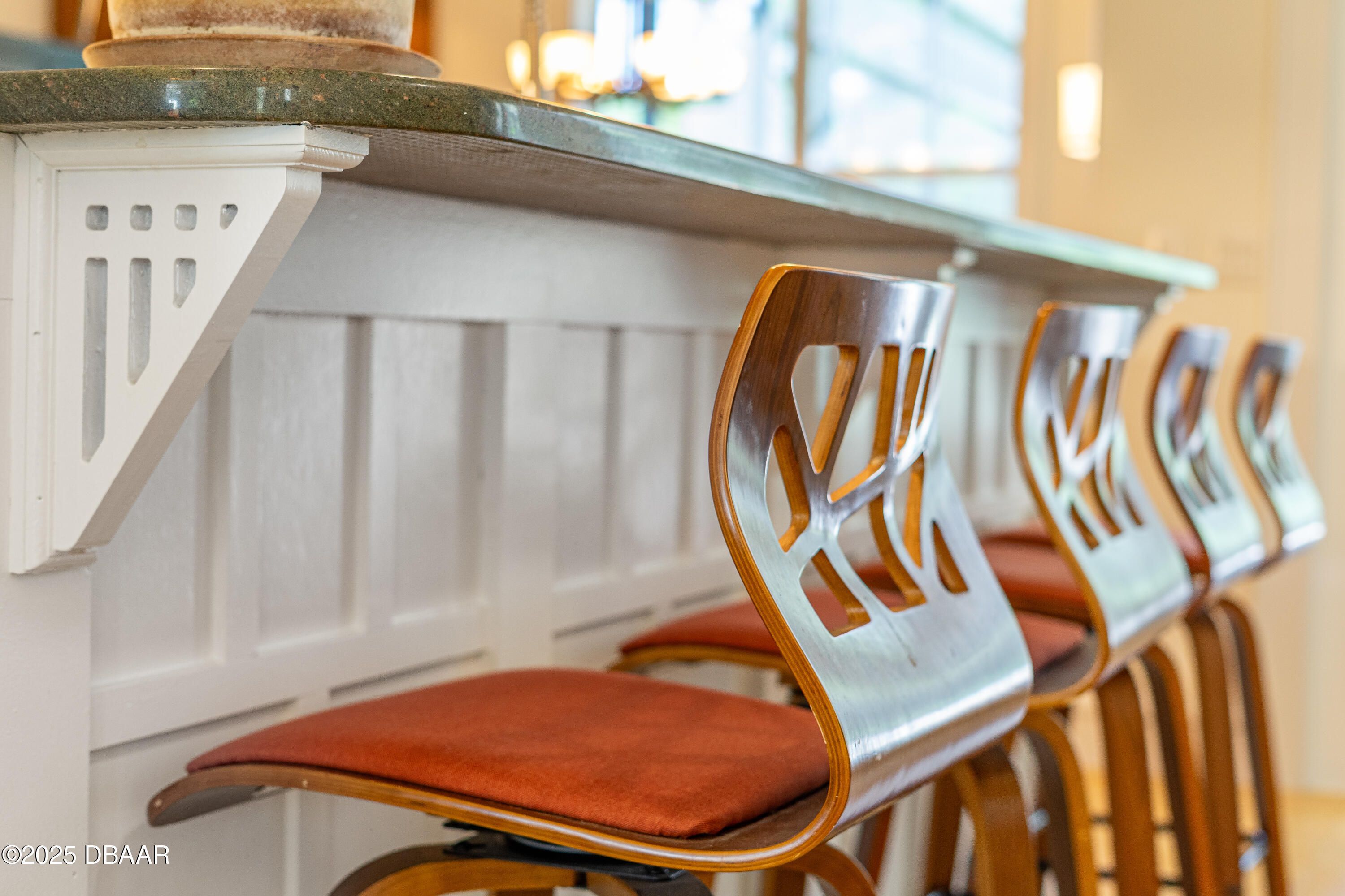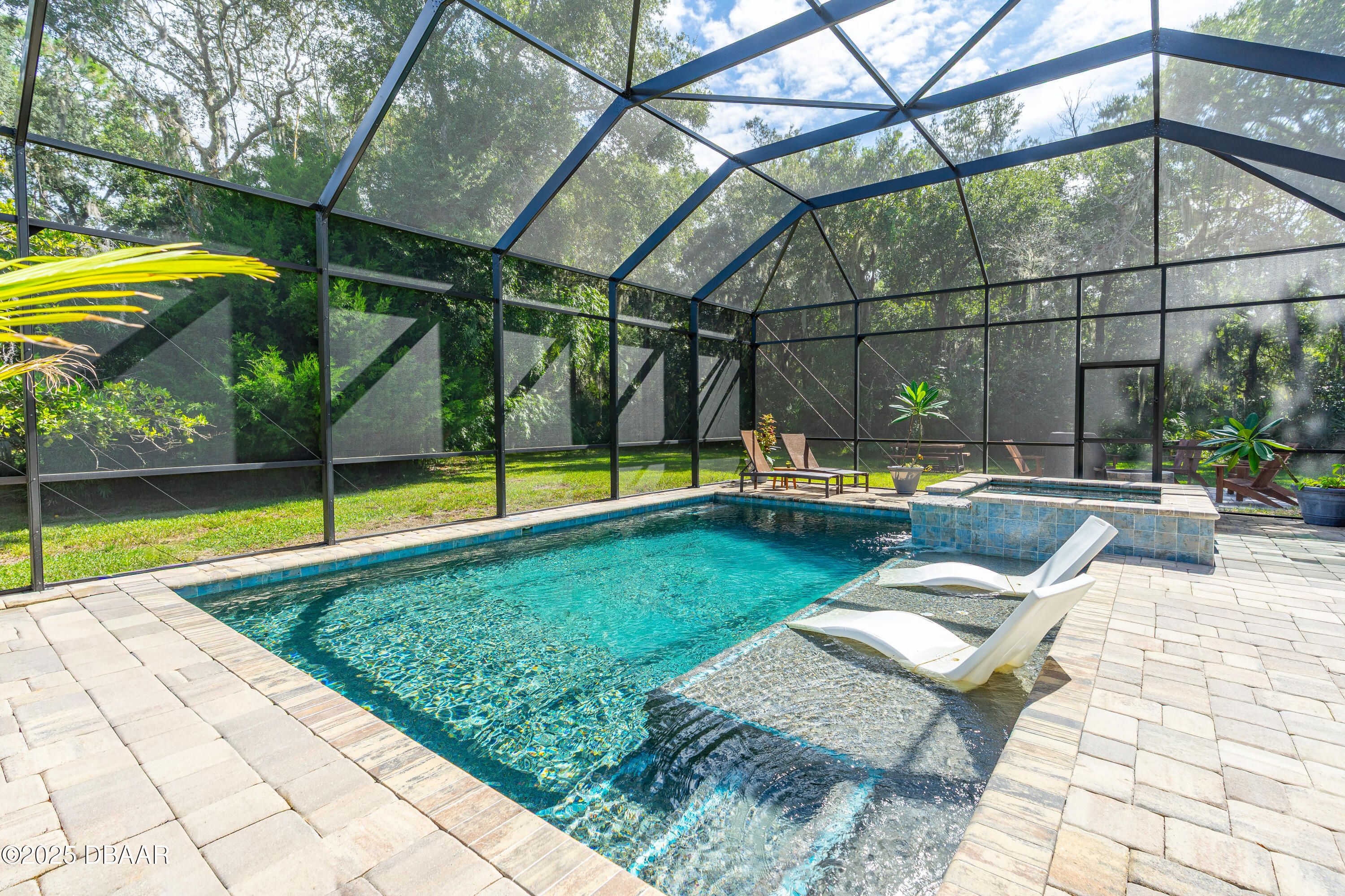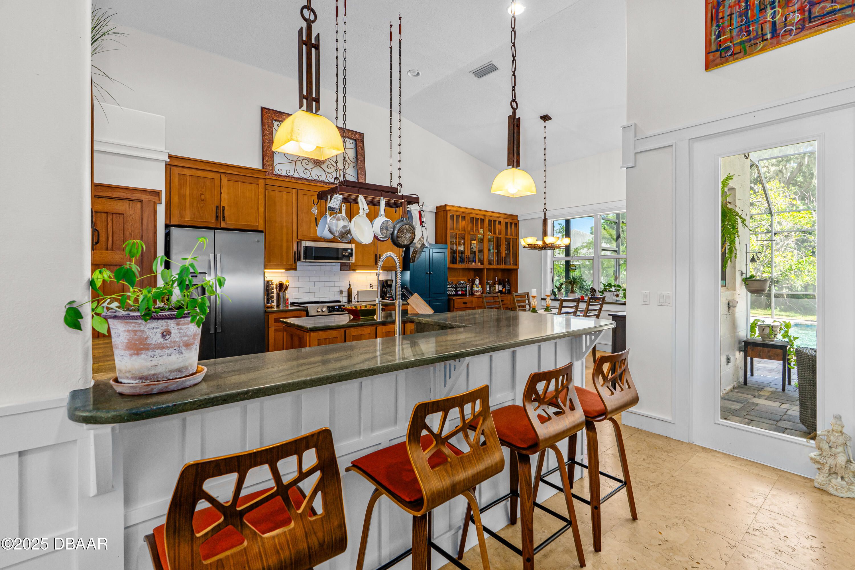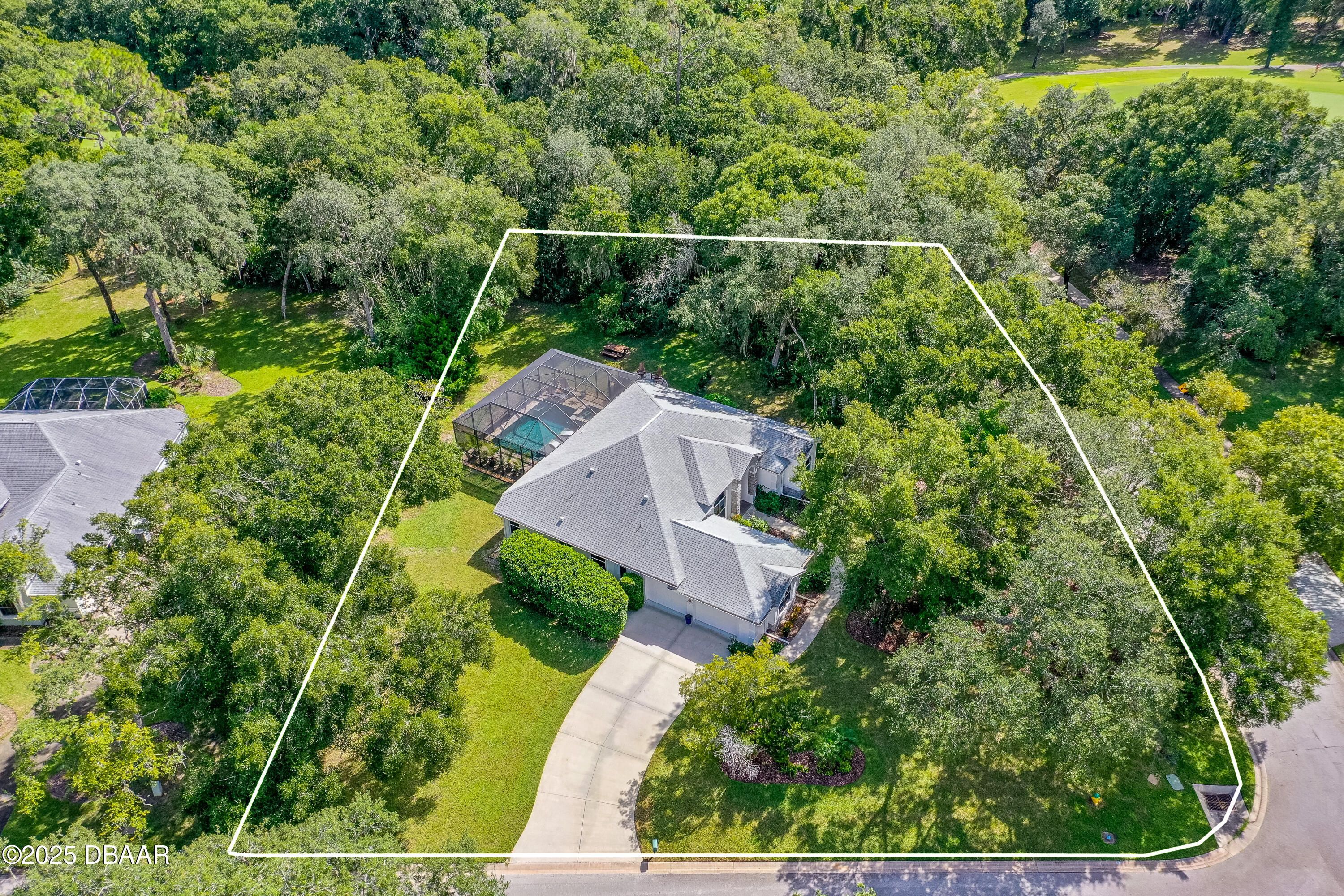Stunning Halifax Plantation golf course custom pool home on a huge and private ¾ acre corner lot the 6th tee. Limestone flooring welcomes you into this expansive, light-filled home with a beautiful wood trim package and turn of the century stained glass windows. Custom hickory cabinetry and doors with Emtek Arts and Crafts bronze hardware throughout. Extensive MIII Pack and Minka Lavery Bronze Lighting w/Murano Glass throughout home. You will love the chef's dream gourmet kitchen with 42'' hickory cabinets with water mark glass, level 8 granite and stainless appliances with large eat-in area with built-ins and formal dining room. Large master bedroom features a sitting area, trey ceilings, his and hers walk-in closets and large ensuite bathroom with dual vanities, large soaker tub plus walk-in shower. The outside oasis feels like you are on vacation with new in 2023 fully automated saltwater heated and enclosed pebbletec resort style pool with large sun shelf and heated spa. Covered sitting area looks out over private back yard with citrus trees and fire pit area. Other upgrades include new roof 2021, fresh paint inside and out, shark coated garage floors in the oversized garage, stone sills on all the windows and new ceiling fans throughout. You will feel protected with a home warranty in place. Hurry before this gem is gone.