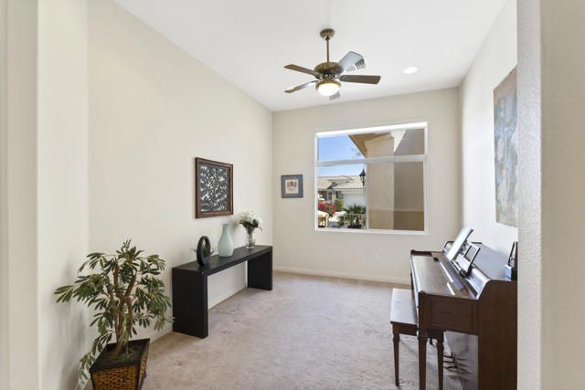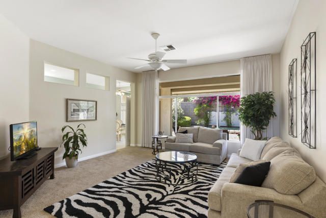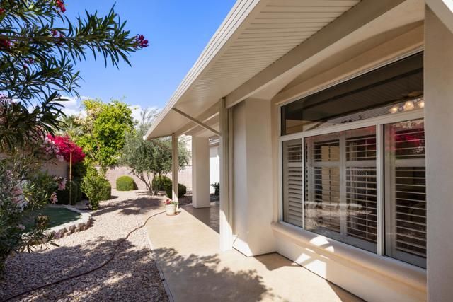 SUN CITY Palm Desert - Most desirable model called a Tangier! 2 bedroom, den and 2 bath in the main PLUS a 1 bedroom 1 bath CASITA! A VERY UNUSUAL FIND! This home is located in a quiet area of Sun City and is a very low maintenance property! BOTH A/C AND WATER HEATER have been REPLACED! When entering the home you will be greeted with an expansive wall of glass viewing a gorgeous back patio with a wall of bouganvillea that has the ultimate privacy! Primary bedroom is on right side of home with a huge bath area with enlarged shower, dual sinks, lovely countertops, linen closet and a custom closet. Primary bedroom has a huge window with views of the mature landscaping and olive and lemon trees in the private patio. Secondary bedroom on the opposite side of the home has a bathroom available to it very nearby, which incudes a stall shower/tub combo , corian counters and new hardware. The AC has been replaced and maintained by Right Away AC. The Casita has a separate unit that has hardly been used.This model is very special with the extra storage designed within the floor plan. There is a ''dry bar'' cabinet area along with additional cabinets near the kitchen along with a linen closet in the primary bedroom. The kitchen is very ''light and bright'' with tons of windows and clearstory windows. Corian counters with ALL APPLIANCES recently updated with Frigidaire Gallery Stainless Steel models. There is a very large eating area with views to the patio. This model has an additional open den/office area, which could be converted to a 3rd bedroom within the main home. There is also the convenience of an inside laundry room and plenty of space in the garage for storage. In addition to the main home, there is a charming separate casita which includes a bedroom area and its own bath. It includes a microwave sink and cabinets A Custom closet is also available. Enjoy as a separate office area, or a tranquil retreat for your guests or grandchildren. Everyone loves having the flexibility of a casita! The garage is available for your two cars, storage cabinet and storage racks. The 2 car garage has a nook for golf cart parking. Also with plenty of storage cabinets and shelving.Make this pristine home your own within one of the top retirement communities in the USA according to Money Magazine! You will have a safe, securely gated community with 2 golf courses, pro shops, driving range, pitching and chipping practice areas and an 18 hole putting course.