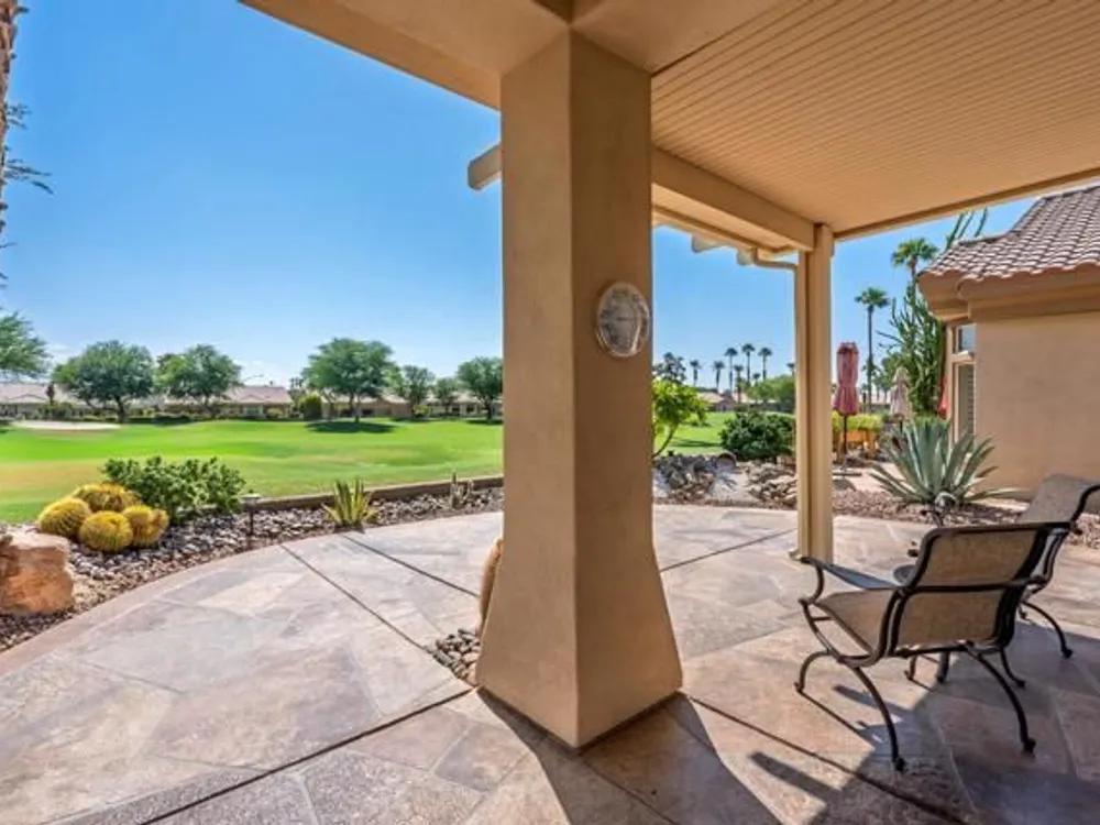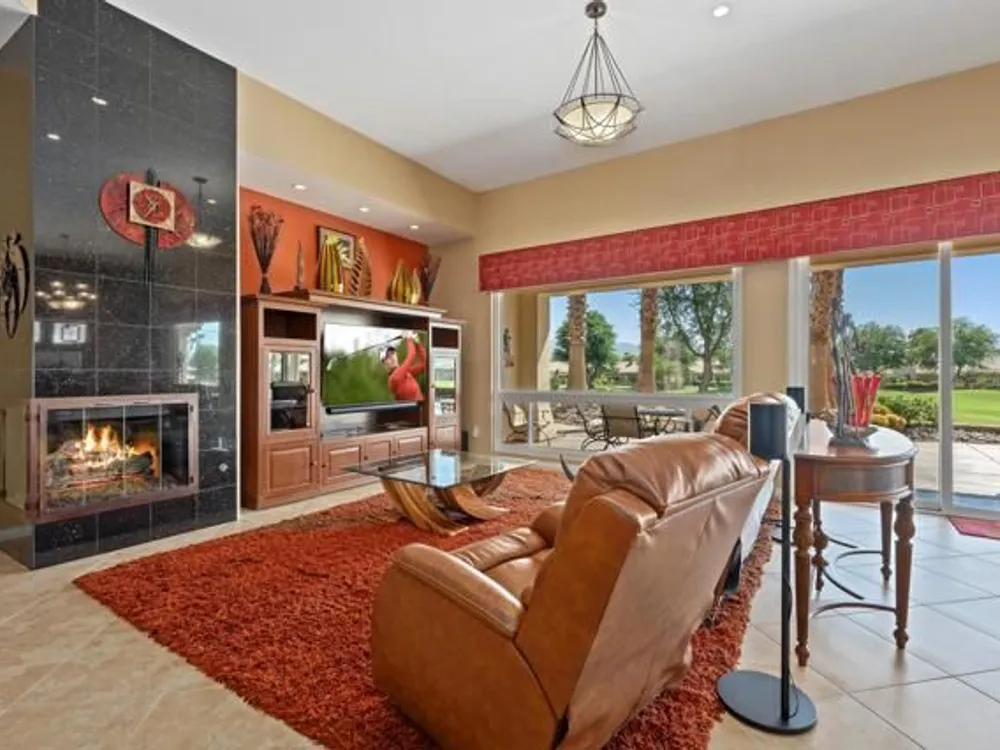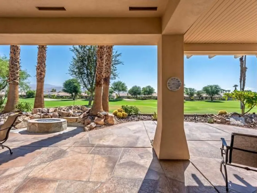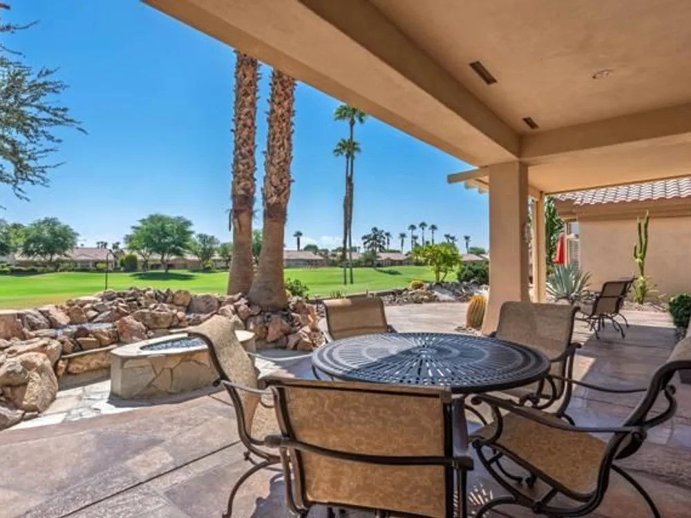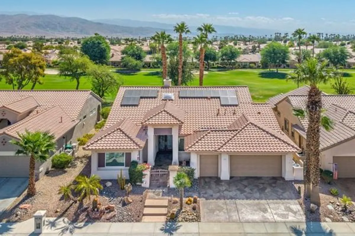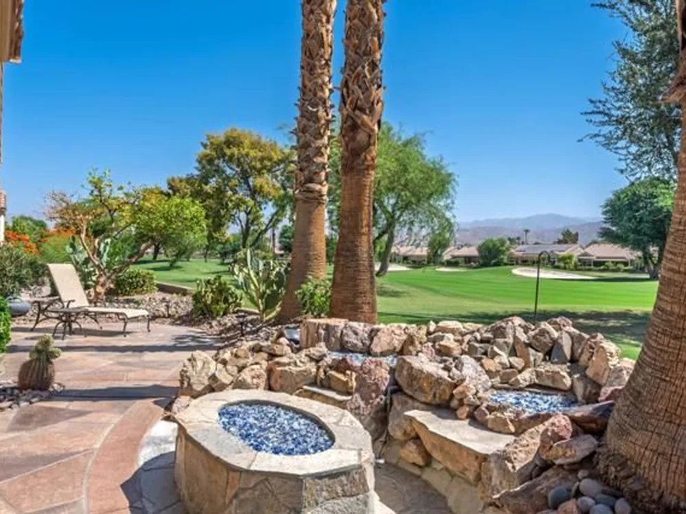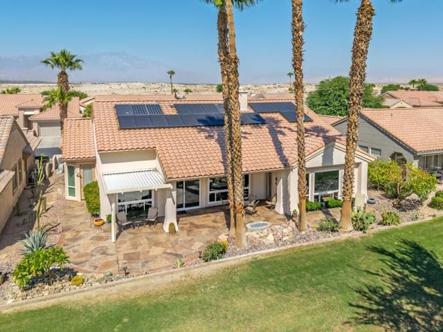 Sun City Palm Desert - St. Tropez. This sought-after St. Tropez model is one of Sun City's most dramatic great room floorplans--elevated on the 14th fairway of the Santa Rosa course with panoramic golf course and mountain views. The east-facing backyard is designed for entertaining, featuring an expanded decorative concrete patio, multiple seating areas, desert landscaping, and three gas firepits. Curb appeal shines with a decorative concrete driveway, gated courtyard, and leaded-glass double doors. Recent upgrades make this home move-in ready for the desert climate: new dual AC units (2024), owned solar eliminating electricity bills, and upgraded windows throughout. Inside, soaring 12-foot ceilings in the great room and foyer, upgraded lighting, and Hunter Douglas window treatments create a dramatic yet comfortable atmosphere. Diagonally laid 19-inch tile flows through the main living areas. The great room showcases a granite-surround fireplace, a granite-topped wet bar with refrigerator, and a wall of windows framing the view. Double doors open to a flexible den/office. The kitchen is a chef's delight with granite counters, a large breakfast bar, center island, wall oven, and pull-out cabinetry. The primary suite offers double-door entry, patio access, a custom walk-in closet, and a spa-style bath with dual sinks, sitting vanity, oversized soaking tub, and glass-block shower. A spacious guest suite includes its own full bath. Additional features: large laundry with storage and sink, 2-car + golf cart garage with epoxy floors and separate AC, and the option to purchase furnished outside of escrow.