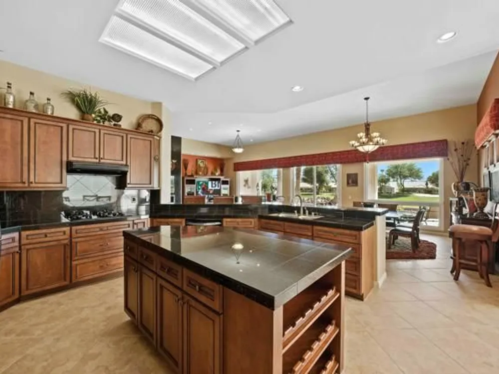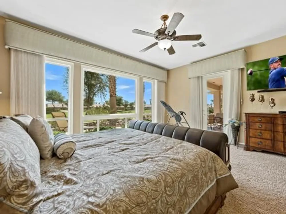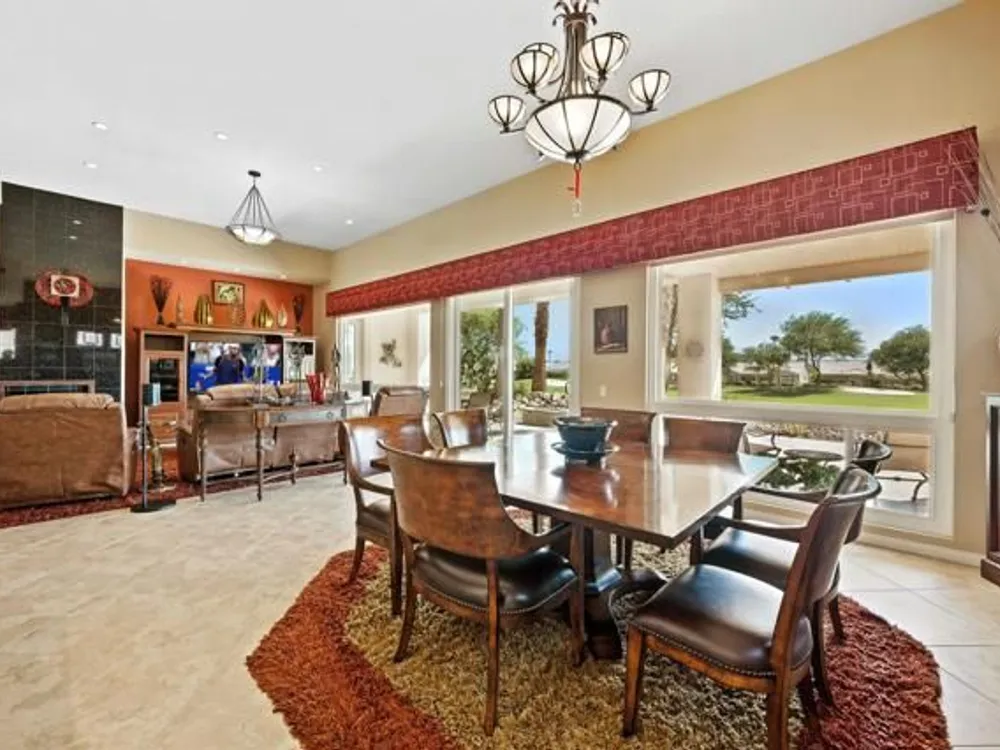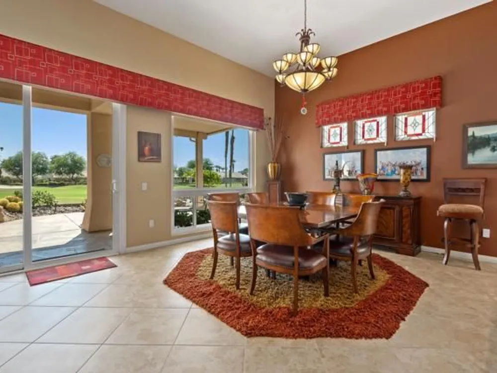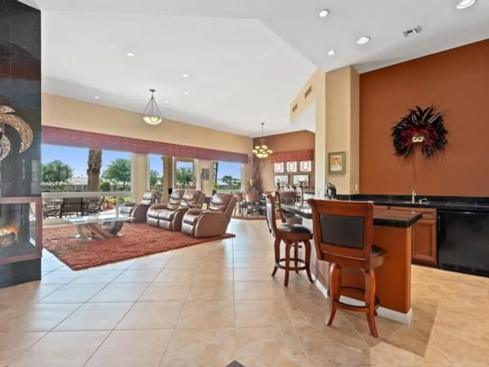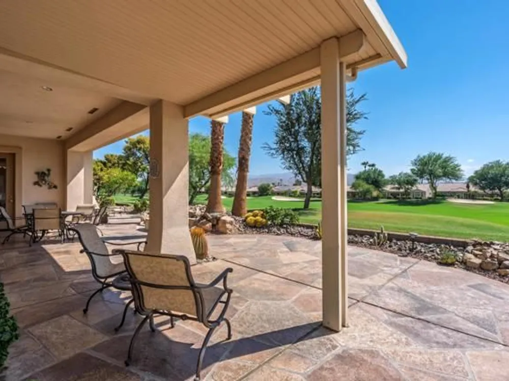 Sun City Palm Desert - St. Tropez. This sought-after St. Tropez model is one of Sun City's most dramatic great room floorplans--elevated on the 14th fairway of the Santa Rosa course with panoramic golf course and mountain views. The east-facing backyard is designed for entertaining, featuring an expanded decorative concrete patio, multiple seating areas, desert landscaping, and three gas firepits. Curb appeal shines with a decorative concrete driveway, gated courtyard, and leaded-glass double doors. Recent upgrades make this home move-in ready for the desert climate: new dual AC units (2024), owned solar eliminating electricity bills, and upgraded windows throughout. Inside, soaring 12-foot ceilings in the great room and foyer, upgraded lighting, and Hunter Douglas window treatments create a dramatic yet comfortable atmosphere. Diagonally laid 19-inch tile flows through the main living areas. The great room showcases a granite-surround fireplace, a granite-topped wet bar with refrigerator, and a wall of windows framing the view. Double doors open to a flexible den/office. The kitchen is a chef's delight with granite counters, a large breakfast bar, center island, wall oven, and pull-out cabinetry. The primary suite offers double-door entry, patio access, a custom walk-in closet, and a spa-style bath with dual sinks, sitting vanity, oversized soaking tub, and glass-block shower. A spacious guest suite includes its own full bath. Additional features: large laundry with storage and sink, 2-car + golf cart garage with epoxy floors and separate AC, and the option to purchase furnished outside of escrow.