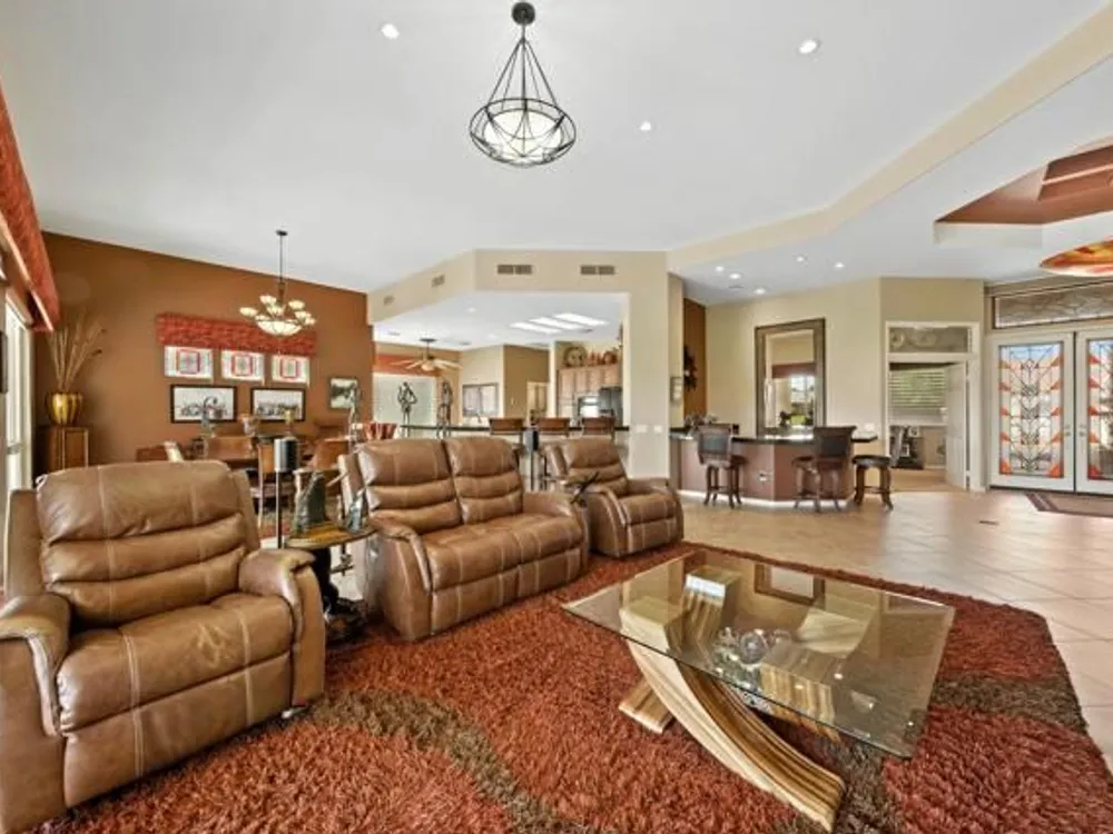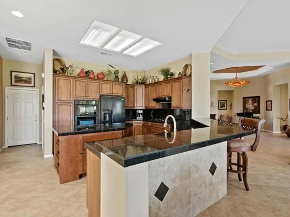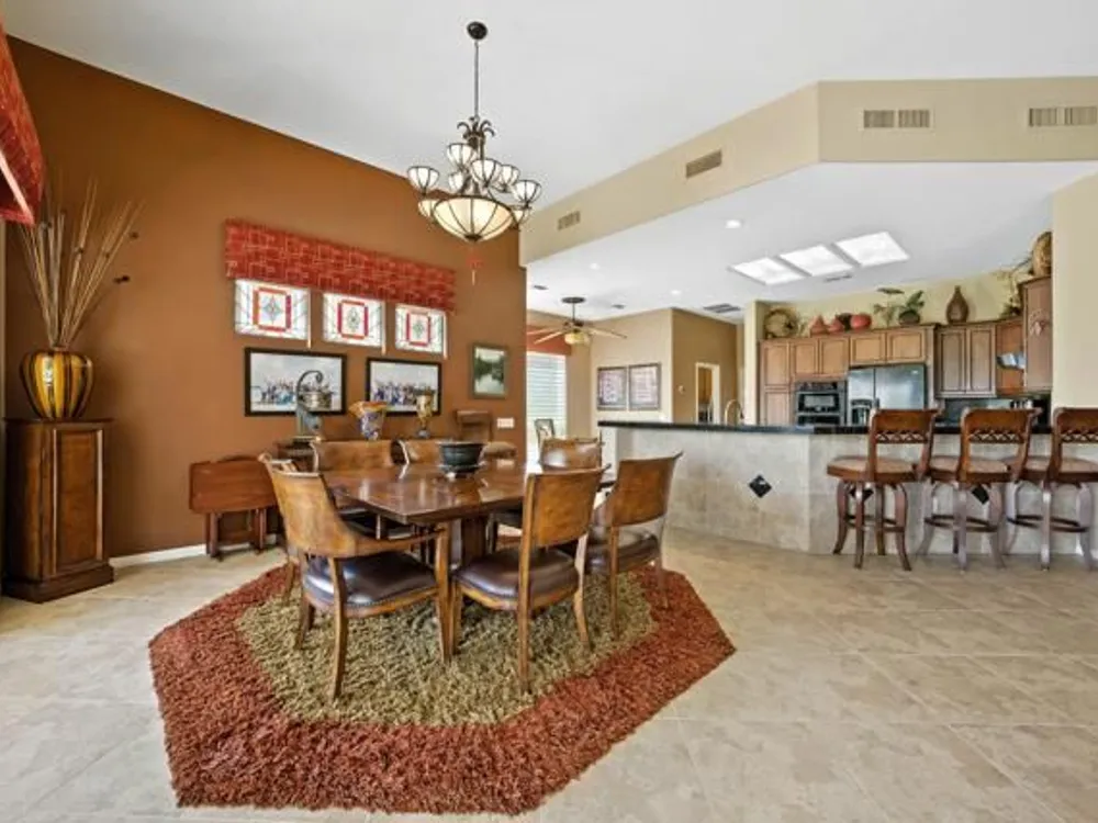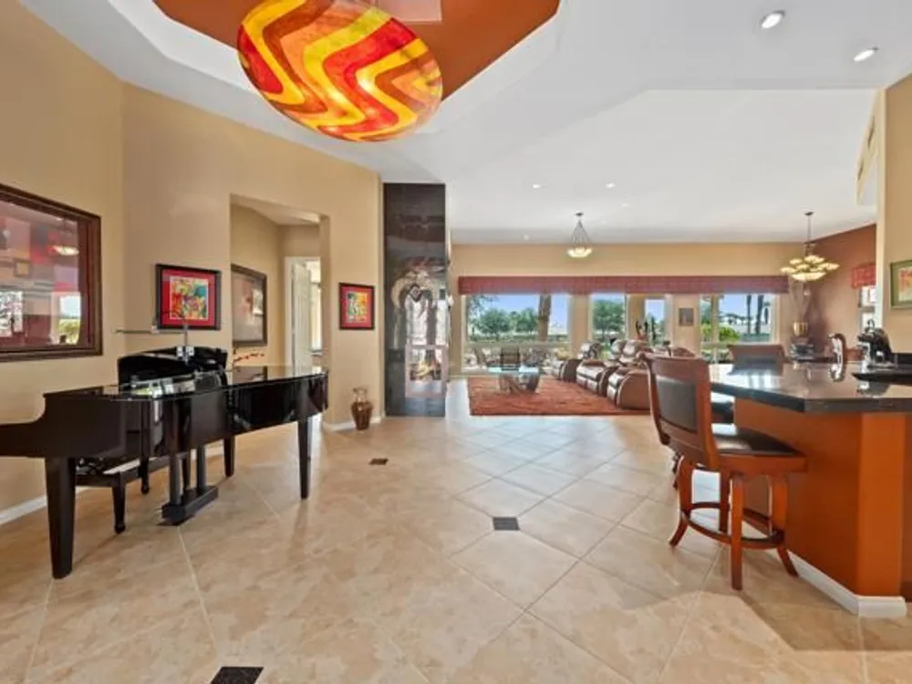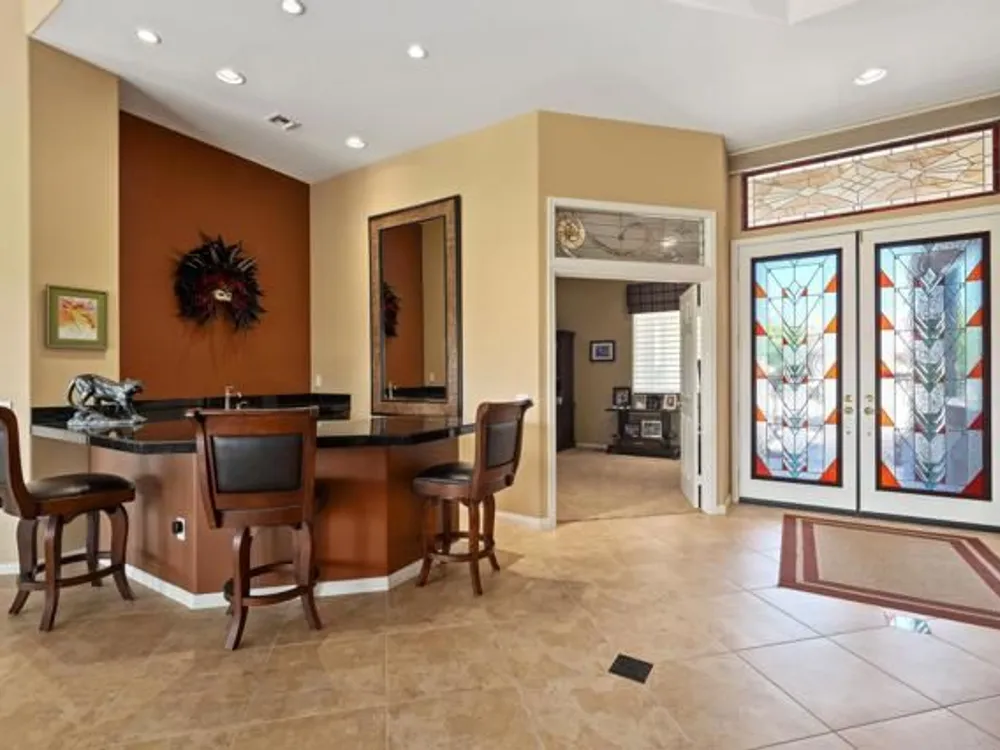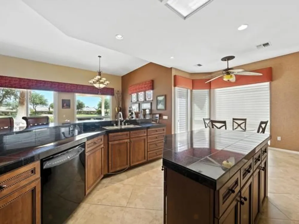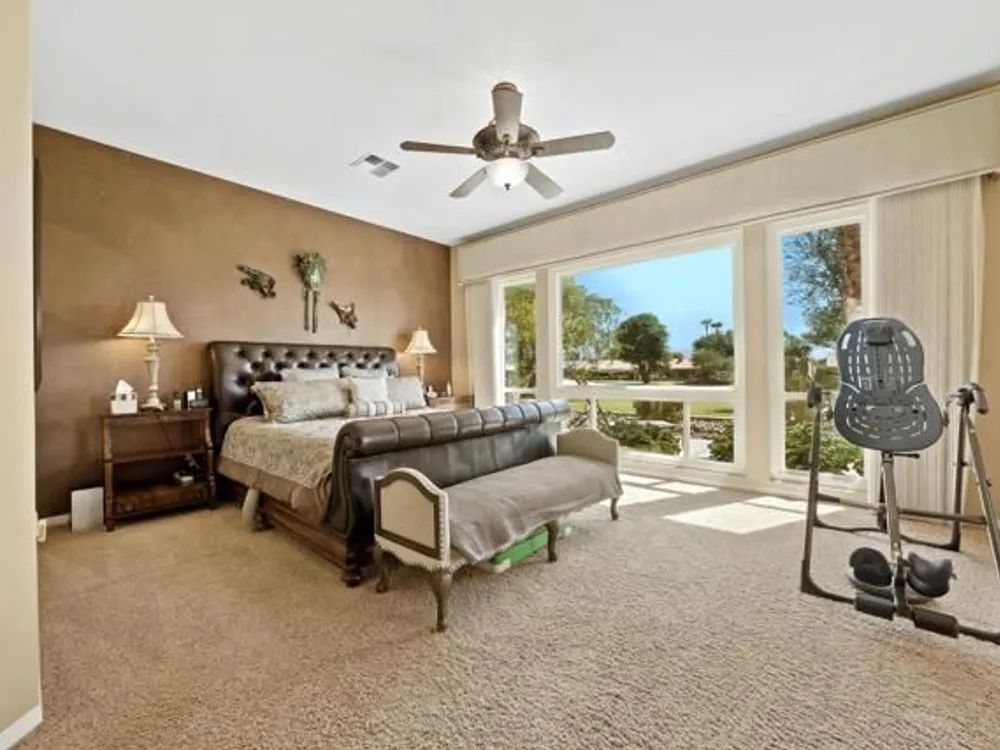 Sun City Palm Desert - St. Tropez. This sought-after St. Tropez model is one of Sun City's most dramatic great room floorplans--elevated on the 14th fairway of the Santa Rosa course with panoramic golf course and mountain views. The east-facing backyard is designed for entertaining, featuring an expanded decorative concrete patio, multiple seating areas, desert landscaping, and three gas firepits. Curb appeal shines with a decorative concrete driveway, gated courtyard, and leaded-glass double doors. Recent upgrades make this home move-in ready for the desert climate: new dual AC units (2024), owned solar eliminating electricity bills, and upgraded windows throughout. Inside, soaring 12-foot ceilings in the great room and foyer, upgraded lighting, and Hunter Douglas window treatments create a dramatic yet comfortable atmosphere. Diagonally laid 19-inch tile flows through the main living areas. The great room showcases a granite-surround fireplace, a granite-topped wet bar with refrigerator, and a wall of windows framing the view. Double doors open to a flexible den/office. The kitchen is a chef's delight with granite counters, a large breakfast bar, center island, wall oven, and pull-out cabinetry. The primary suite offers double-door entry, patio access, a custom walk-in closet, and a spa-style bath with dual sinks, sitting vanity, oversized soaking tub, and glass-block shower. A spacious guest suite includes its own full bath. Additional features: large laundry with storage and sink, 2-car + golf cart garage with epoxy floors and separate AC, and the option to purchase furnished outside of escrow.