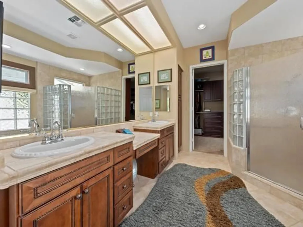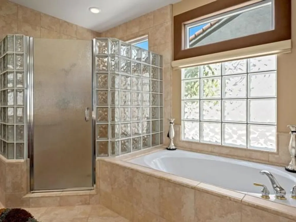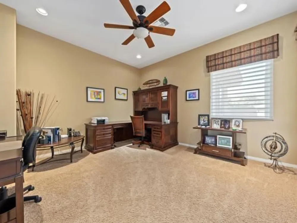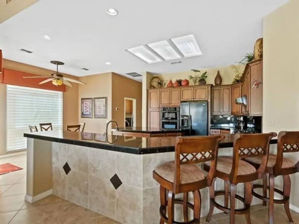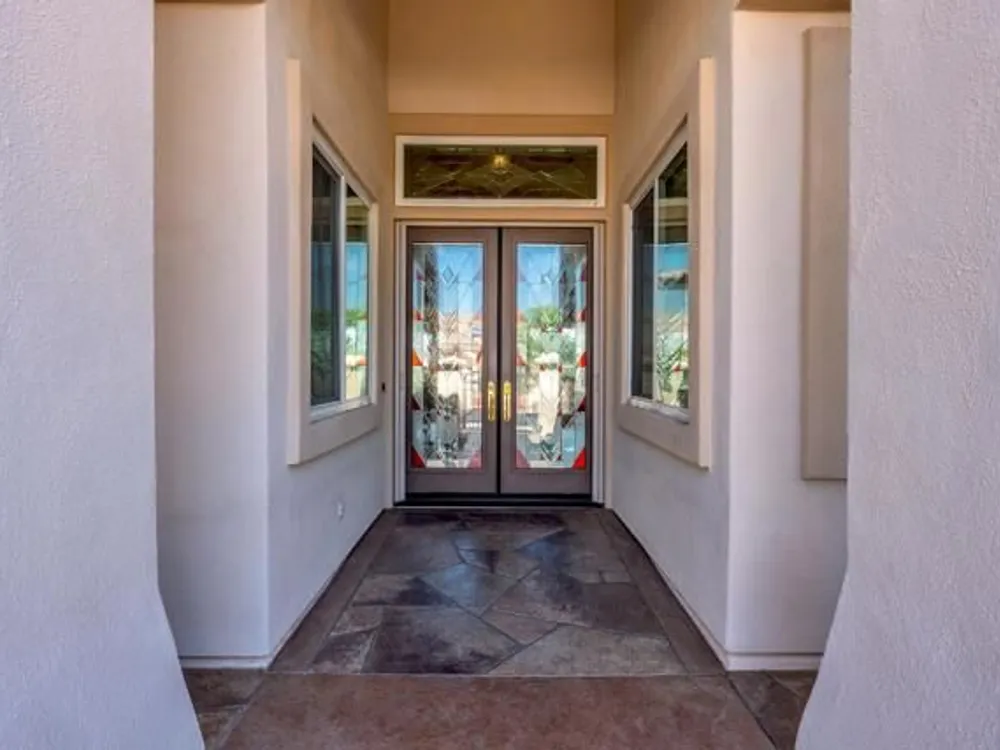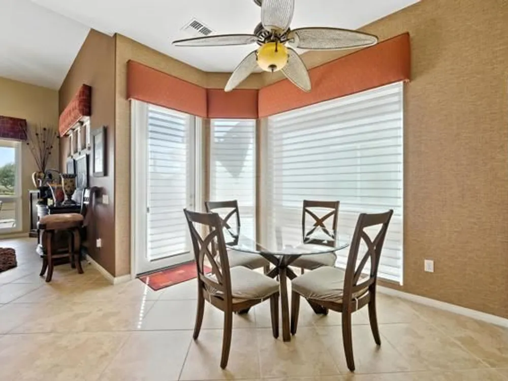 Sun City Palm Desert - St. Tropez. This sought-after St. Tropez model is one of Sun City's most dramatic great room floorplans--elevated on the 14th fairway of the Santa Rosa course with panoramic golf course and mountain views. The east-facing backyard is designed for entertaining, featuring an expanded decorative concrete patio, multiple seating areas, desert landscaping, and three gas firepits. Curb appeal shines with a decorative concrete driveway, gated courtyard, and leaded-glass double doors. Recent upgrades make this home move-in ready for the desert climate: new dual AC units (2024), owned solar eliminating electricity bills, and upgraded windows throughout. Inside, soaring 12-foot ceilings in the great room and foyer, upgraded lighting, and Hunter Douglas window treatments create a dramatic yet comfortable atmosphere. Diagonally laid 19-inch tile flows through the main living areas. The great room showcases a granite-surround fireplace, a granite-topped wet bar with refrigerator, and a wall of windows framing the view. Double doors open to a flexible den/office. The kitchen is a chef's delight with granite counters, a large breakfast bar, center island, wall oven, and pull-out cabinetry. The primary suite offers double-door entry, patio access, a custom walk-in closet, and a spa-style bath with dual sinks, sitting vanity, oversized soaking tub, and glass-block shower. A spacious guest suite includes its own full bath. Additional features: large laundry with storage and sink, 2-car + golf cart garage with epoxy floors and separate AC, and the option to purchase furnished outside of escrow.