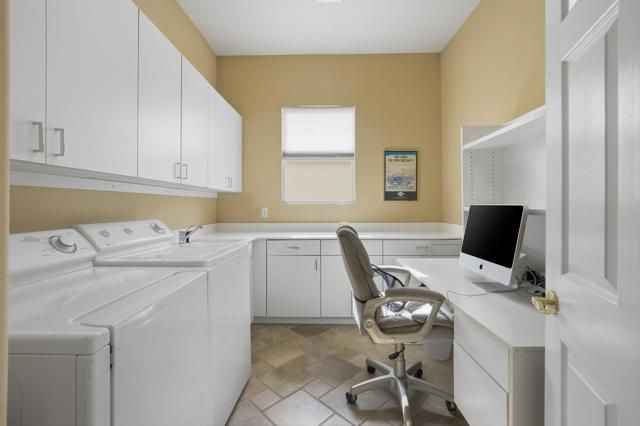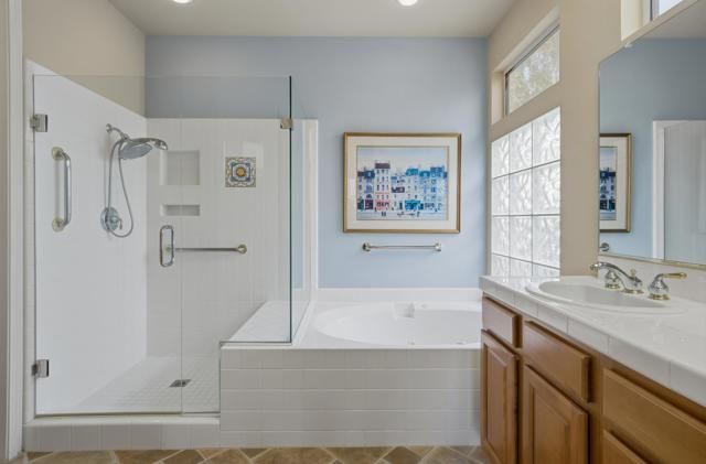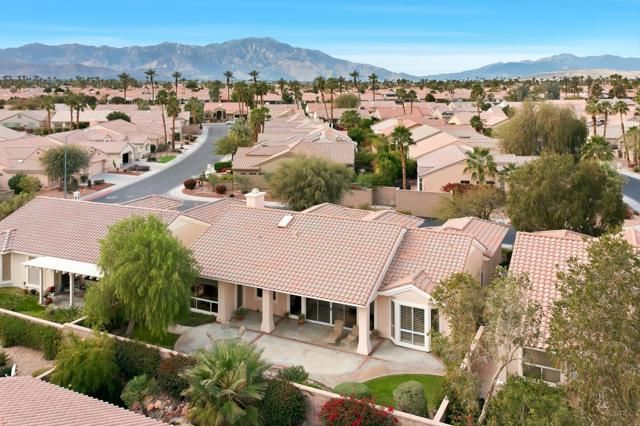 True Pride of Ownership at Sun City Palm Desert! This immaculate Monaco floor plan is 2,323 square feet, with 3 bedrooms and 3 bathrooms. The kitchen has slab granite countertops, oversized island, and is open to the family room. The family room is perfect for entertaining, watching a movie, or just relaxing by the fireplace. The primary suite is spacious and private, with a large walk-in closet, dual sinks, custom seamless shower, and separate jetted bathtub. The attached casita is an enormous guest suite with access out to the entry courtyard. The third bedroom can be used as a guest room or a den/office, with direct access to the guest bathroom. Other features of the home include high ceilings, custom tile work, shutters, central vacuum system, 2 car garage plus golf cart garage. The oversized private backyard faces southeast and offers sun during the early part of the day, and shade in the late afternoon. This home is in move-in ready condition! Sun City Palm Desert is an active 55+ community.