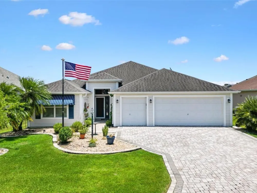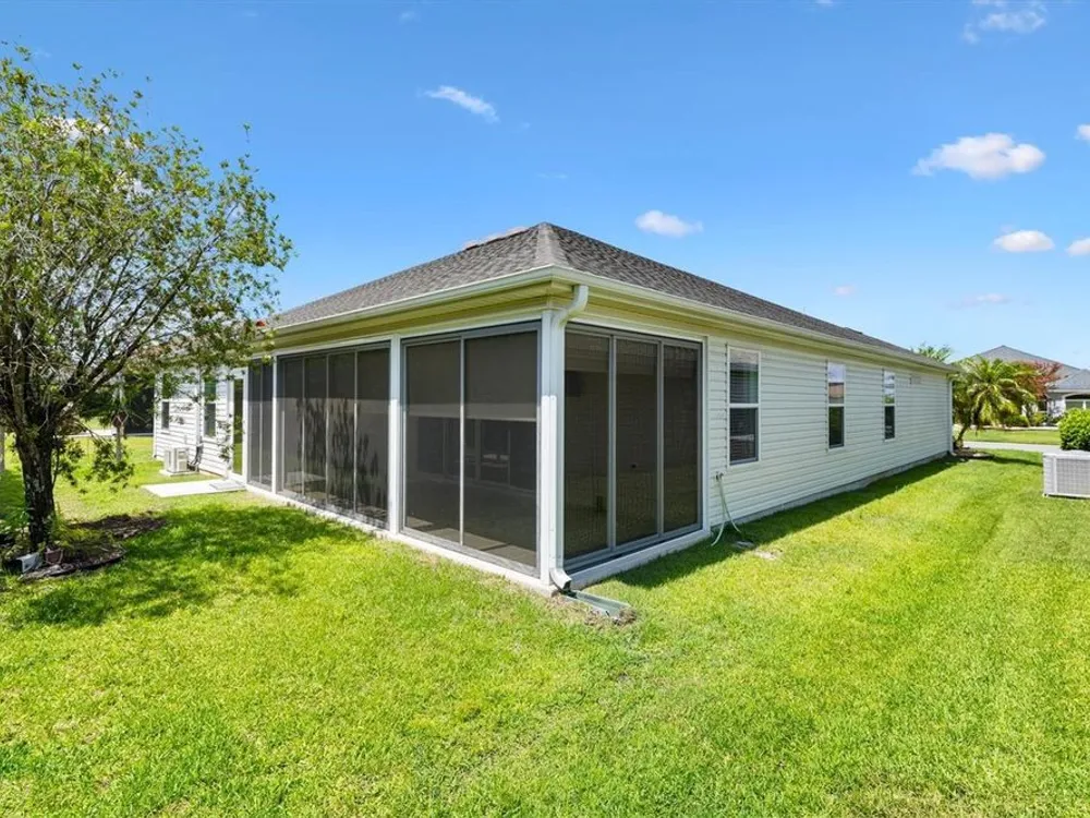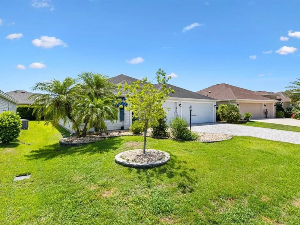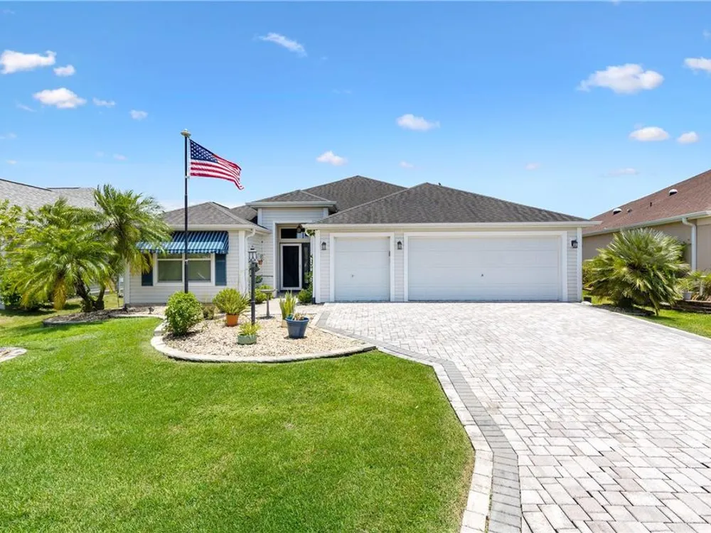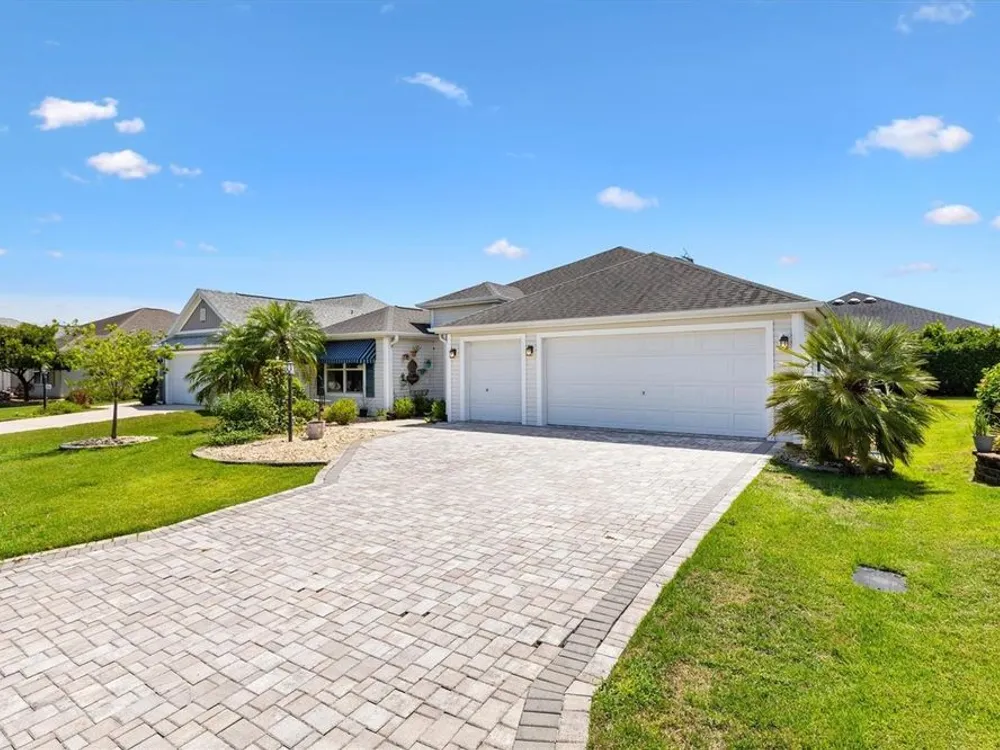 Beautifully maintained 3/2 Sunflower Designer Home with 2 Car plus Golf Cart Garage in the Village of Dunedin. Nestled perfectly between Lake Sumter Landing and Brownwood Paddock Square, with shopping, dining, and entertainment just minutes away. A covered front entry welcomes you in through a front door accented by stained glass side panel and transom window. The home also features a handsome paver driveway and mature landscaping, enhancing curb appeal. You'll appreciate no carpet having Luxury Vinyl Flooring throughout the home. The open floor plan seamlessly connects the main living areas, with sliding doors leading to an enclosed, temperature-controlled lanai—ideal for year-round enjoyment. The kitchen offers a cozy dining nook, stainless steel appliances, pull-out shelves, and a breakfast bar, making meal prep and entertaining a breeze. Retreat to the spacious master bedroom featuring a tray ceiling and his and hers custom walk-in closets. The ensuite bath includes a split dual vanity, a private water closet, and a luxurious Roman-style walk-in shower. The guest bedrooms (3rd bedroom no closet) are conveniently located off the entry and features a pocket door for added privacy. The adjacent guest bath includes a shower/tub combo and a window for brightness. The Lanai has pull down shades, mini split and ceiling fans and leads to an outdoor grilling patio. A 2-car plus golf cart garage provides space for vehicles and storage and includes an electric screen and a durable epoxy-coated floor. This home blends comfort, style, and an unbeatable location—don’t miss your opportunity to start living The Villages Dream. Watch our video and make your appointment to see this home today.