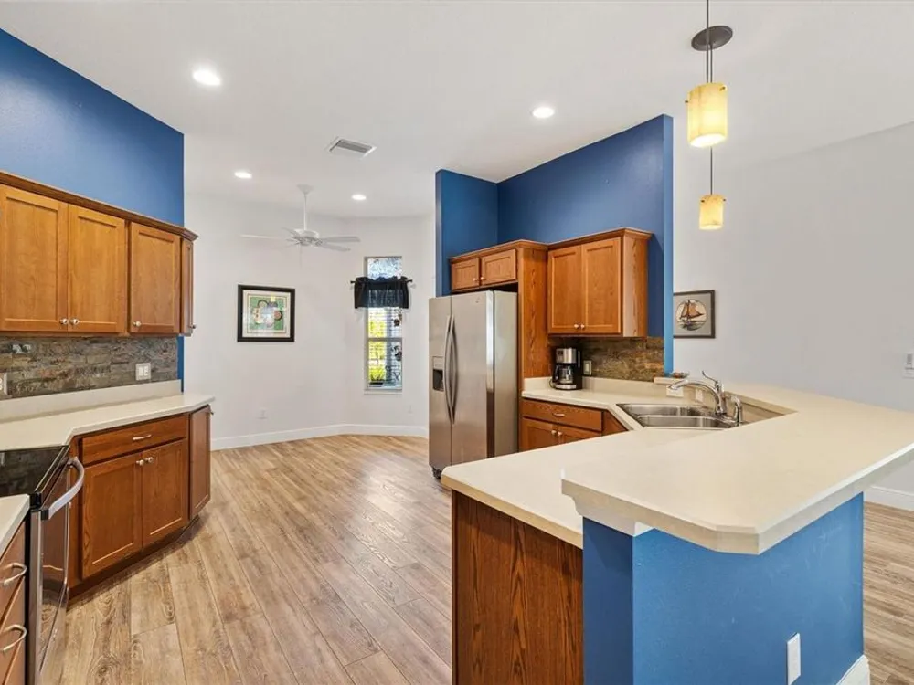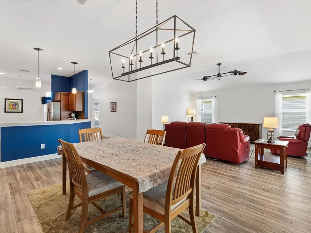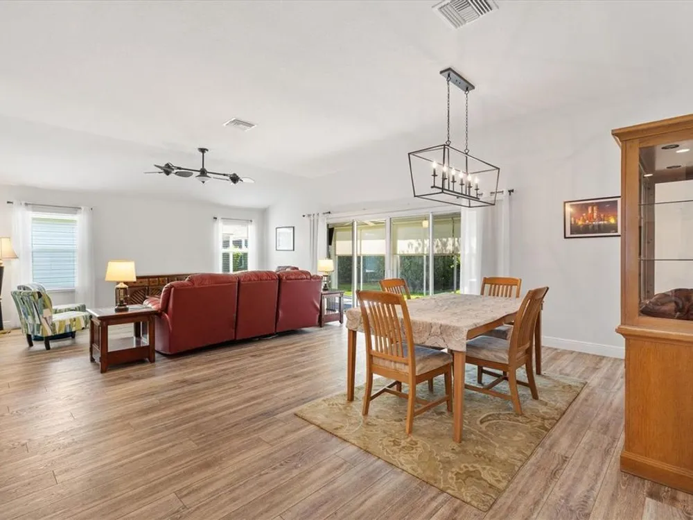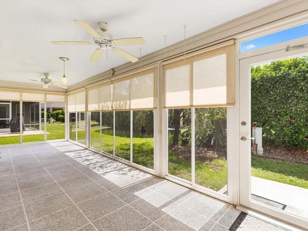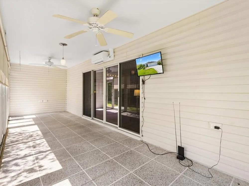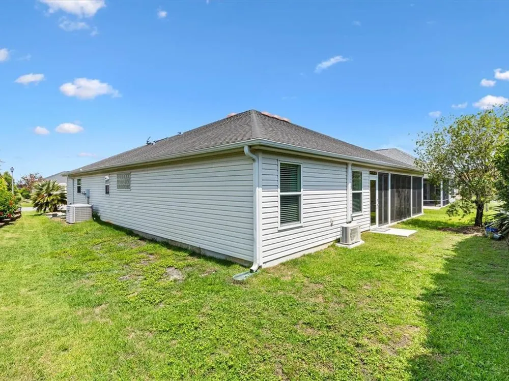Beautifully maintained 3/2 Sunflower Designer Home with 2 Car plus Golf Cart Garage in the Village of Dunedin. Nestled perfectly between Lake Sumter Landing and Brownwood Paddock Square, with shopping, dining, and entertainment just minutes away. A covered front entry welcomes you in through a front door accented by stained glass side panel and transom window. The home also features a handsome paver driveway and mature landscaping, enhancing curb appeal. You'll appreciate no carpet having Luxury Vinyl Flooring throughout the home. The open floor plan seamlessly connects the main living areas, with sliding doors leading to an enclosed, temperature-controlled lanai—ideal for year-round enjoyment. The kitchen offers a cozy dining nook, stainless steel appliances, pull-out shelves, and a breakfast bar, making meal prep and entertaining a breeze. Retreat to the spacious master bedroom featuring a tray ceiling and his and hers custom walk-in closets. The ensuite bath includes a split dual vanity, a private water closet, and a luxurious Roman-style walk-in shower. The guest bedrooms (3rd bedroom no closet) are conveniently located off the entry and features a pocket door for added privacy. The adjacent guest bath includes a shower/tub combo and a window for brightness. The Lanai has pull down shades, mini split and ceiling fans and leads to an outdoor grilling patio. A 2-car plus golf cart garage provides space for vehicles and storage and includes an electric screen and a durable epoxy-coated floor. This home blends comfort, style, and an unbeatable location—don’t miss your opportunity to start living The Villages Dream. Watch our video and make your appointment to see this home today.