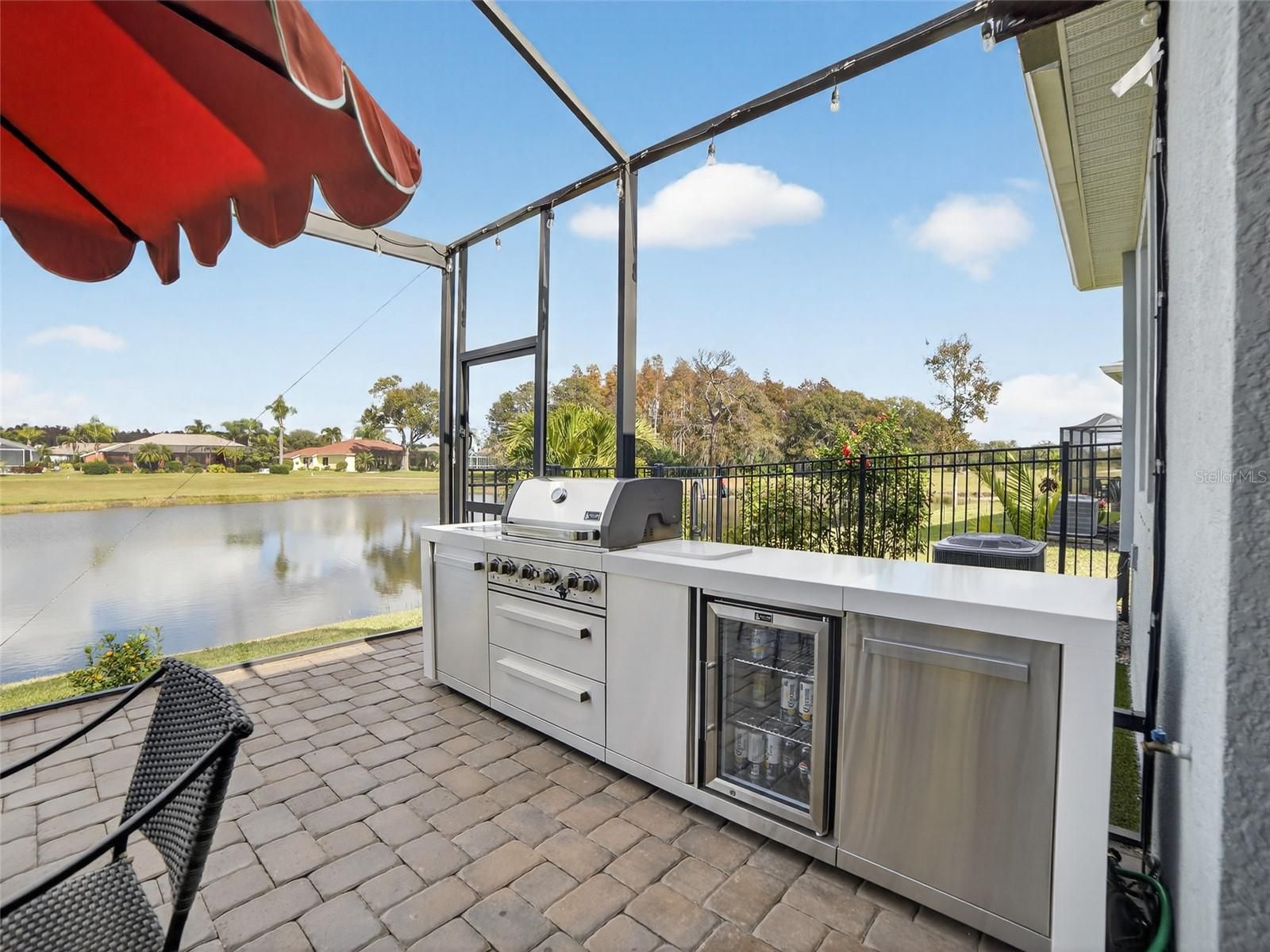 **Luxury Water & Golf Course Views** Perfectly positioned on one of the most coveted homesites in Sun City Center’s gated and exclusive 55+ enclave, **The Preserve at La Paloma**, this exceptional single-family residence offers unobstructed views of **Cypress Creek Golf Club** and a tranquil lake. Expansive vistas of shimmering water, lush greenery, and abundant wildlife can be enjoyed from the great room and the stunning **extended atrium-style screened lanai**. Showcasing the **Pelican floor plan**, this 1,787 sq ft, better-than-new home features **two generously sized bedrooms, two-and-a-half baths, and a den with double doors**, all within a thoughtfully designed single-story layout. **Tray and elevated ceilings**, paired with **exquisite beachwood-style luxury wood-look flooring** throughout, create a bright, airy interior that epitomizes sophisticated Florida living. Sunlight streams through oversized windows, highlighting the **open-concept kitchen, dining, and great room**, while the seamless flow between spaces enhances both everyday comfort and effortless entertaining. The combination of **architectural details, high-end finishes, and carefully curated design elements** gives the home a sense of grandeur, light, and timeless elegance. At the heart of the home, the **chef’s kitchen** impresses with a spacious island and breakfast bar, **Tahoe Harbor Gray cabinetry**, **designer quartz/granite countertops**, **custom tile backsplash**, **stainless steel appliances**, a walk-in pantry, cabinet pull-outs, and an additional storage pantry—combining style, storage, and exceptional functionality.The **owner’s suite** serves as a private retreat, offering a spacious walk-in closet and a spa-inspired en-suite bath featuring **dual vanities**, a linen closet, refined tile finishes, and a luxurious walk-in shower. Two additional bedrooms provide comfort and flexibility for guests, while a dedicated **study/home office** and an elegant **powder room** near the foyer enhance everyday convenience. The home’s **indoor-outdoor living** experience is elevated by a **seamless screened patio lanai**, providing unobstructed views while enhancing comfort and outdoor enjoyment. Perfect for entertaining, the lanai is complemented by a **Mont Alpi 805 Deluxe Island outdoor kitchen**, featuring a **6-burner stainless steel grill**, **two infrared burners**, **built-in beverage center**, **refrigerator**, and **sink**, all crafted from premium stainless steel imported from Italy. Additional luxury appointments include a **coastal exterior**, **impact glass front door**, **extended brick-paver patio**, **wrought iron fenced backyard**, upgraded lighting and ceiling fans, **custom window treatments**, and a sunny indoor laundry room with tile flooring. **Extended driveway** Sun City Center is a **golf cart friendly town**. Residents of **The Preserve at La Paloma** enjoy a **resort-inspired lifestyle** with sidewalk-lined streets, a **grand heated pool**, **hot tub**, **clubhouse**, **meeting rooms**, **pickleball courts**, **cabana areas**, **community fire pit** inviting social gathering spaces. Ideally located near **Tampa, St. Petersburg, Bradenton, and Sarasota**, Sun City Center is one of Florida’s premier active adult destinations—offering convenient access to shopping, dining, healthcare, arts, entertainment, professional sports, and **Gulf Coast beaches**. This remarkable residence delivers the perfect balance of luxury, location and lifestyle.