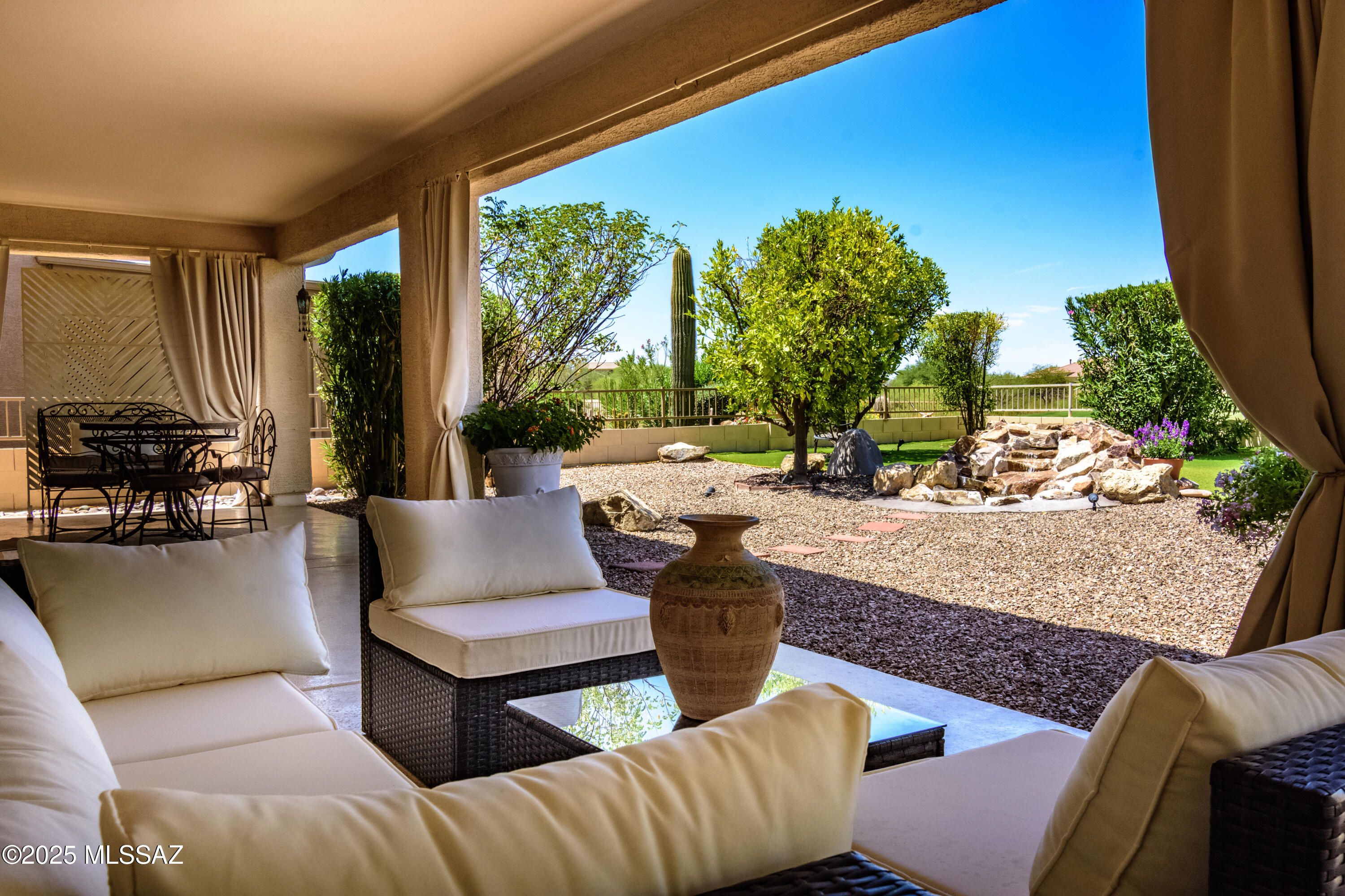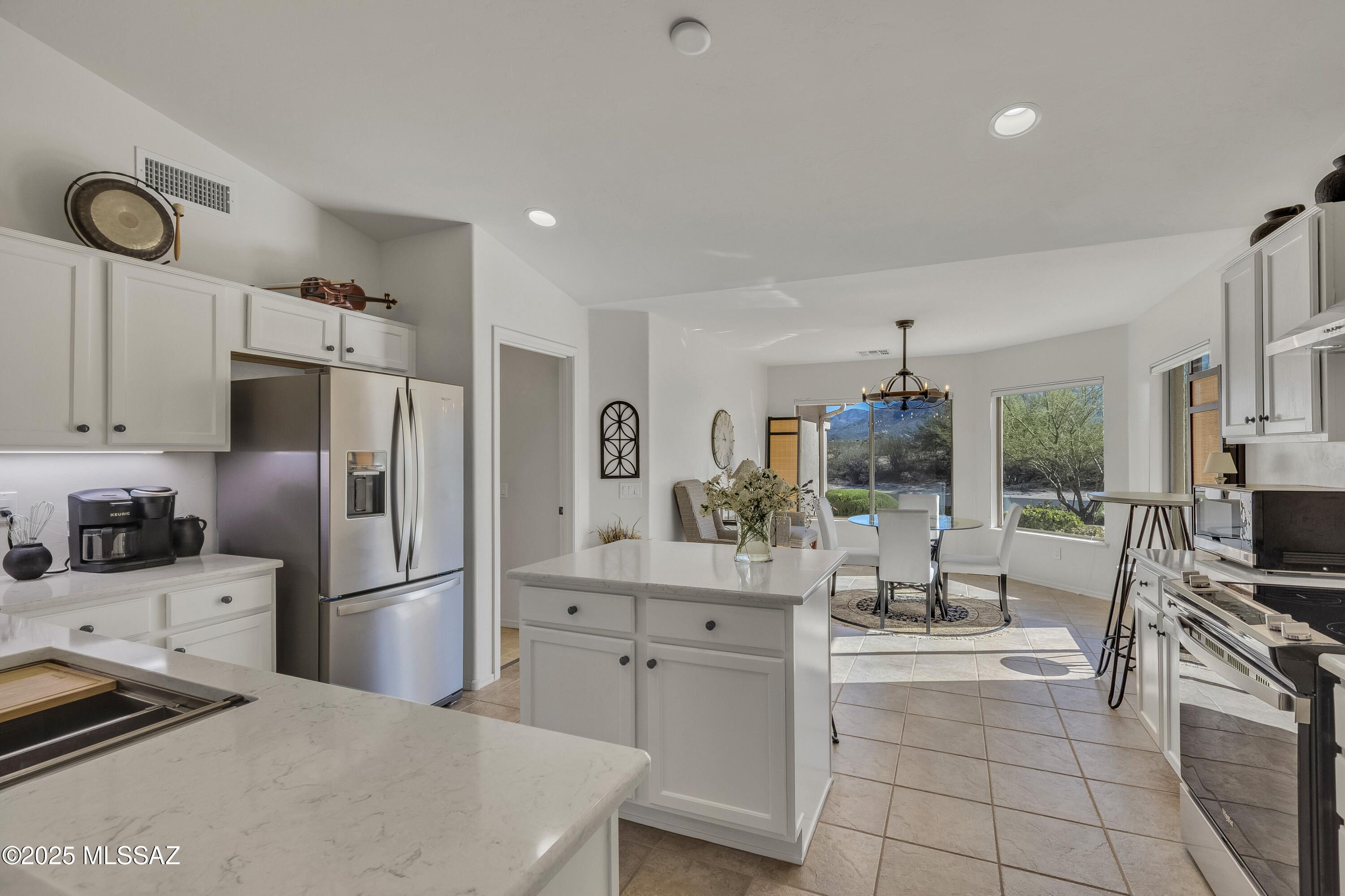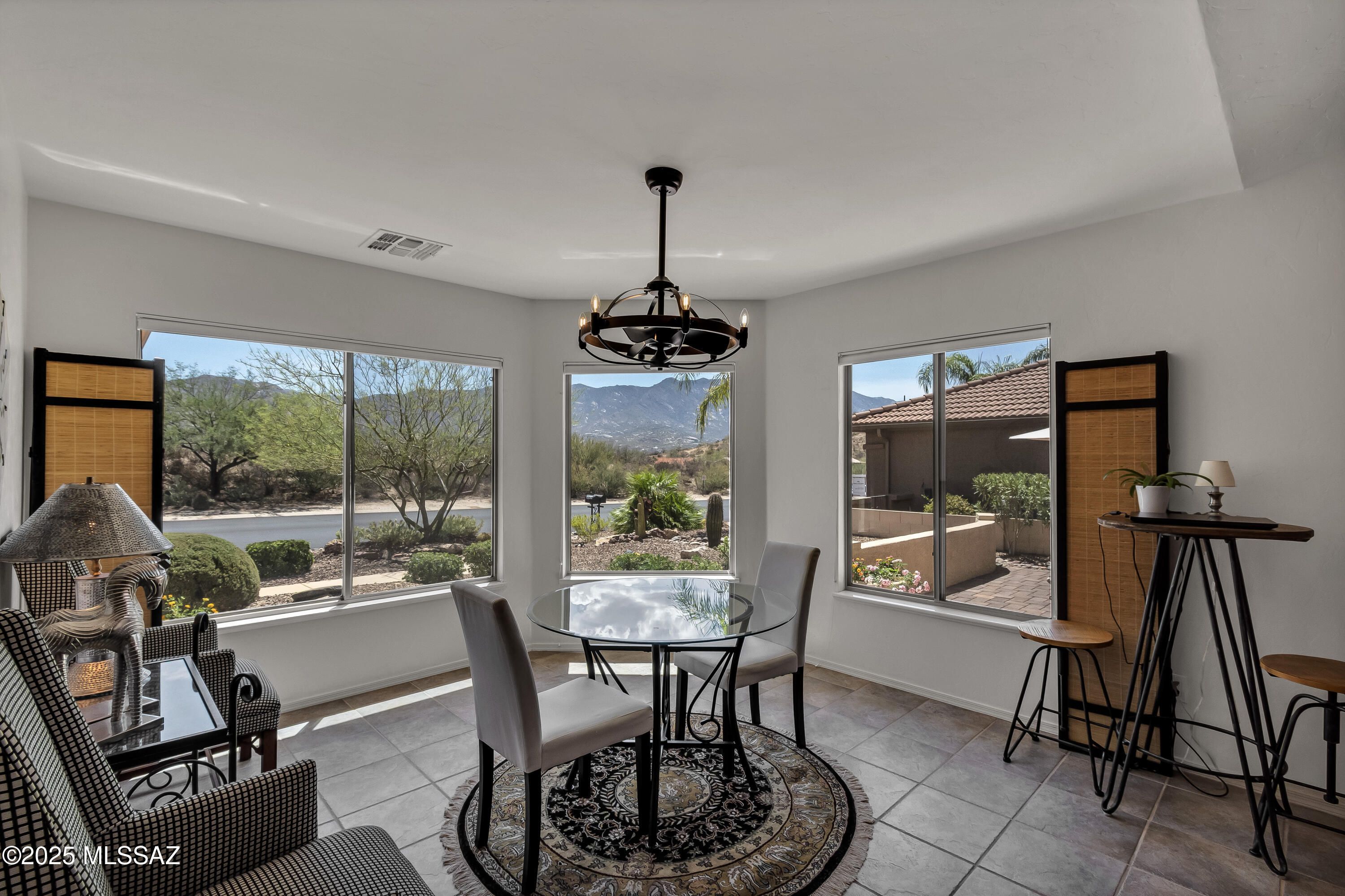 Rare premium lot: Golf Course Vistas or Mountain views from every room. Add to this, the comfort you've been waiting for and the lifestyle to match. Savor the ease & convenience of this unique SaddleBrooke home. This elegantly updated, extended Laredo model offers a spacious, comfortable layout w/split 3BD/2BA or Den --perfect for hobbies, guests, or a quiet reading room. An open living area w/fireplace inspires easy nights in & welcoming occasions. Love to cook or entertain? (read on!)