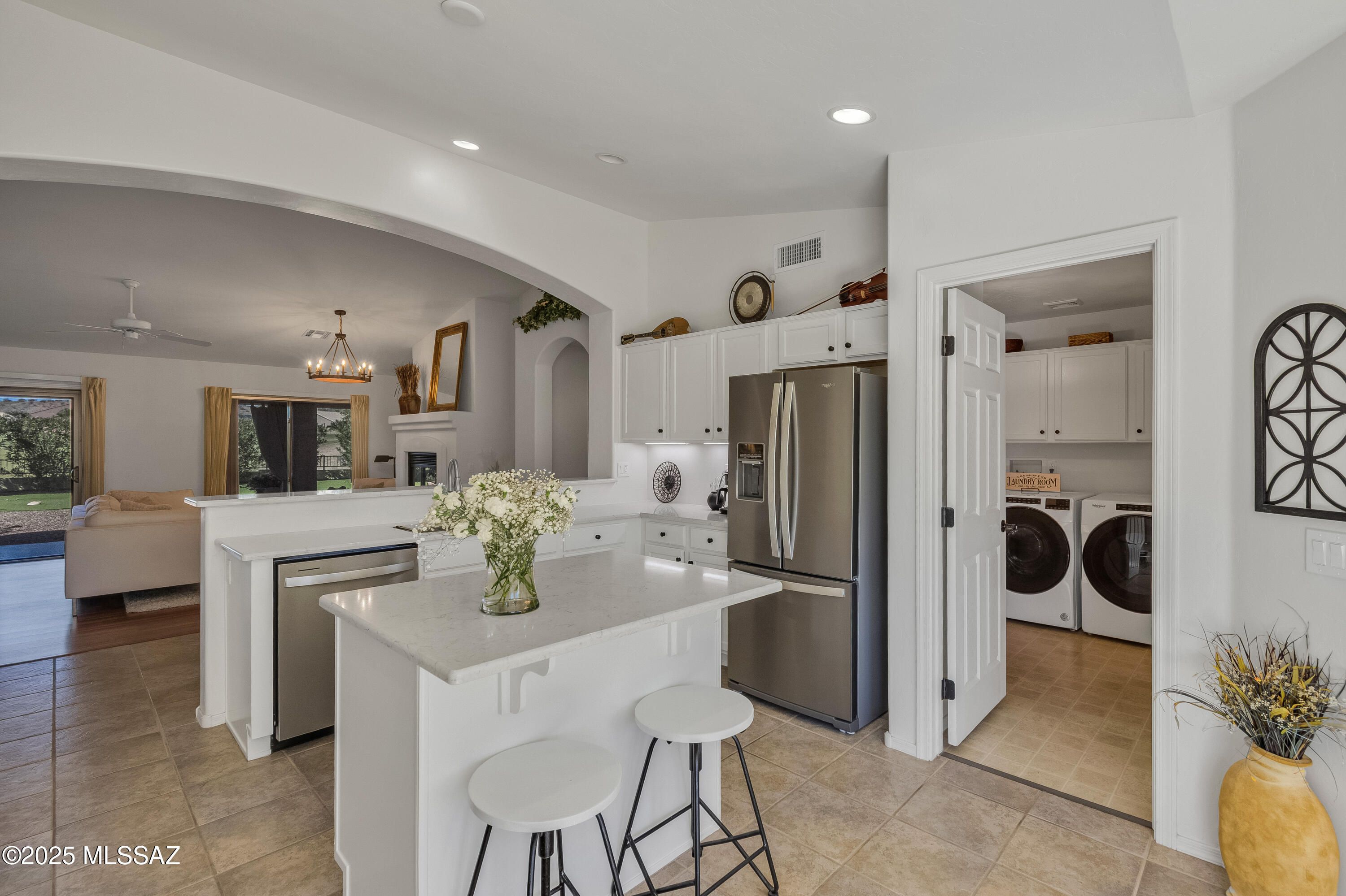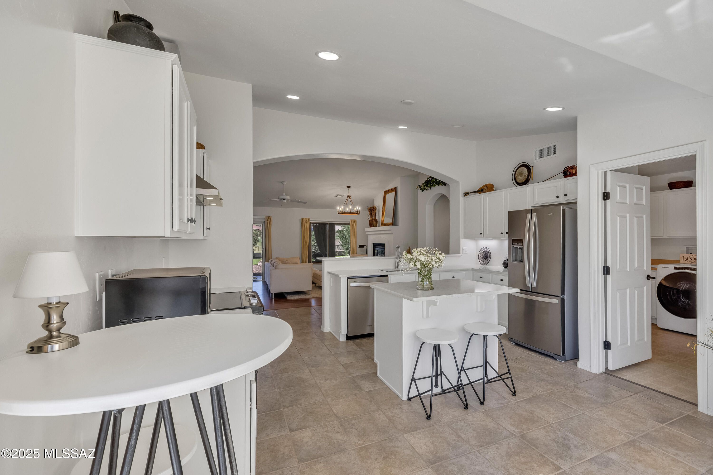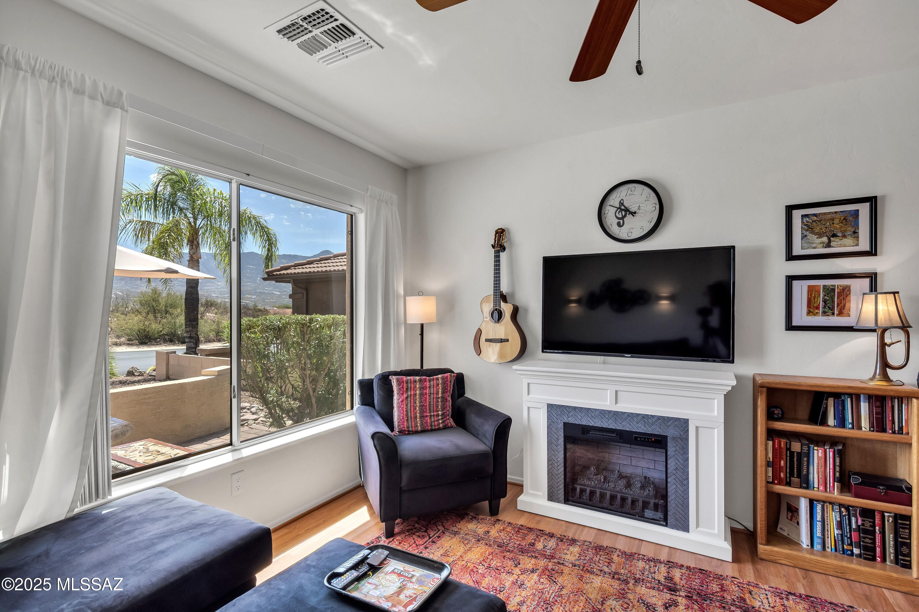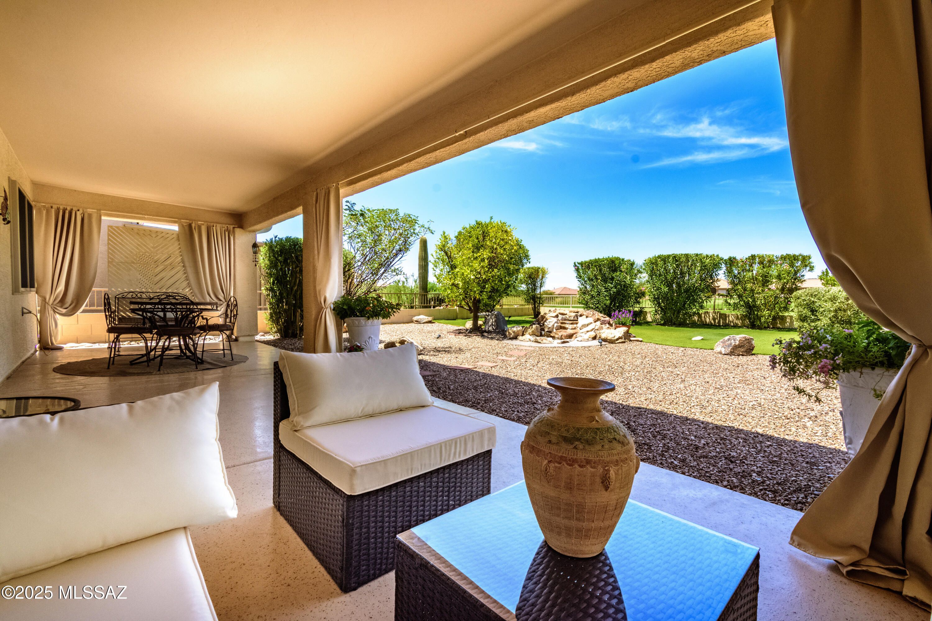 Rare premium lot: Golf Course Vistas or Mountain views from every room. Add to this, the comfort you've been waiting for and the lifestyle to match. Savor the ease & convenience of this unique SaddleBrooke home. This elegantly updated, extended Laredo model offers a spacious, comfortable layout w/split 3BD/2BA or Den --perfect for hobbies, guests, or a quiet reading room. An open living area w/fireplace inspires easy nights in & welcoming occasions. Love to cook or entertain? (read on!)