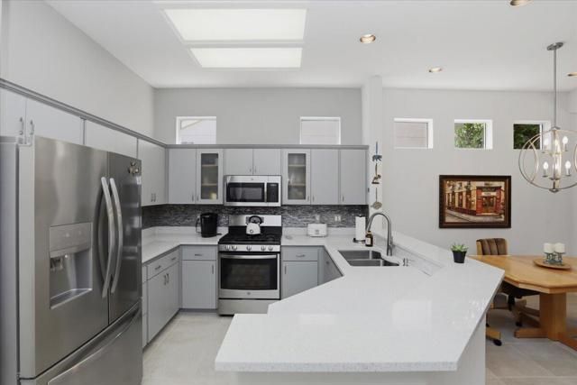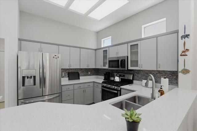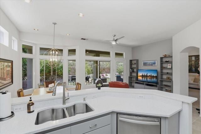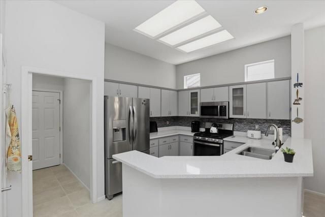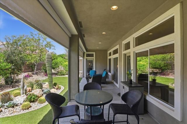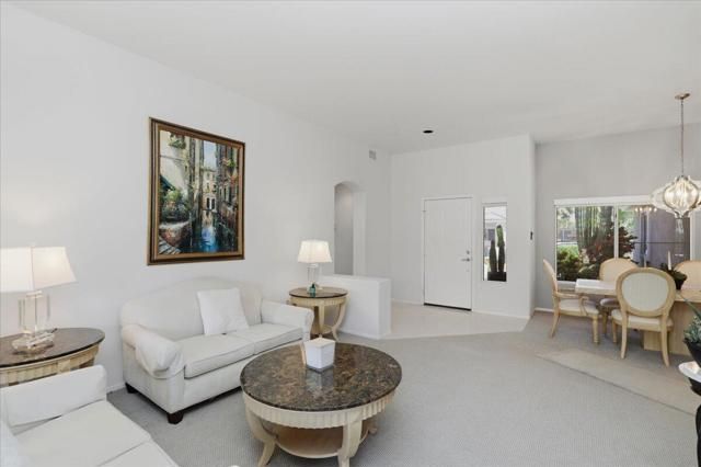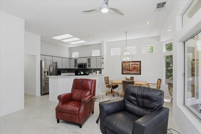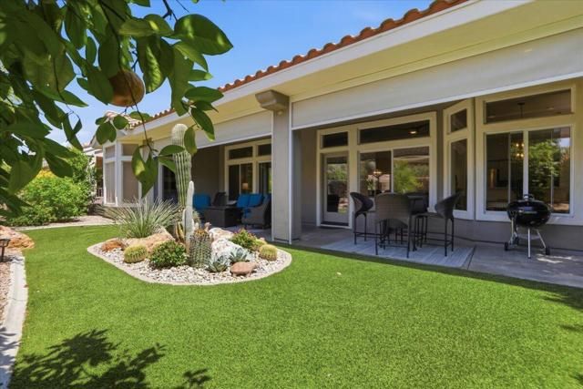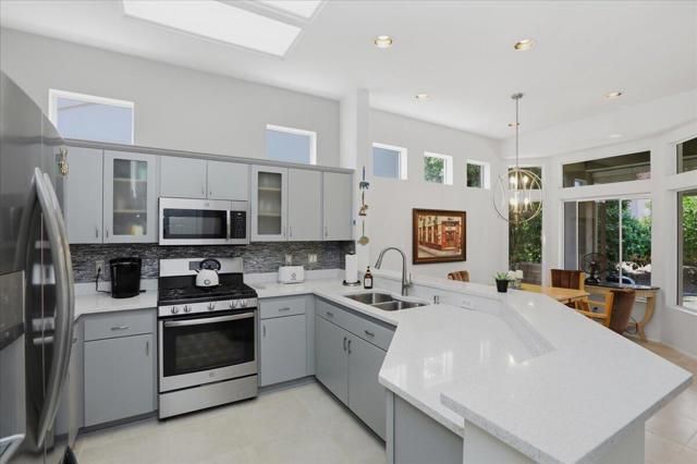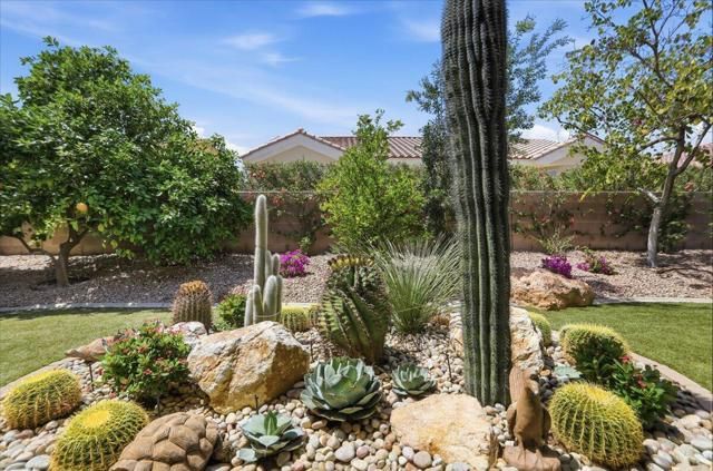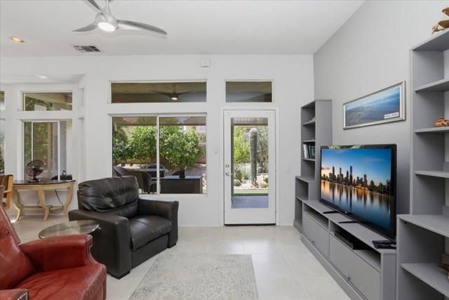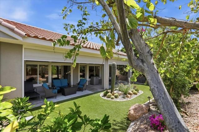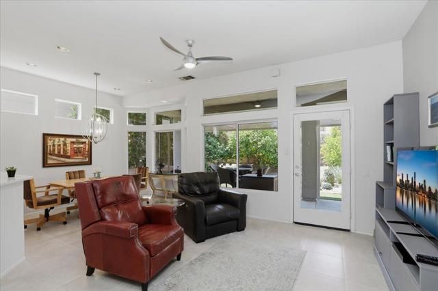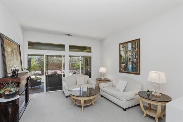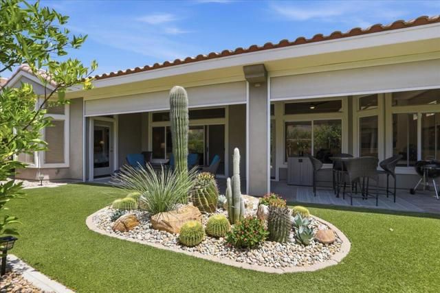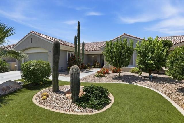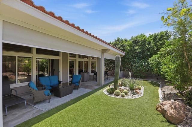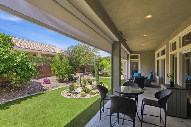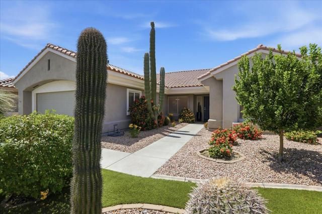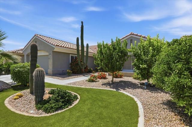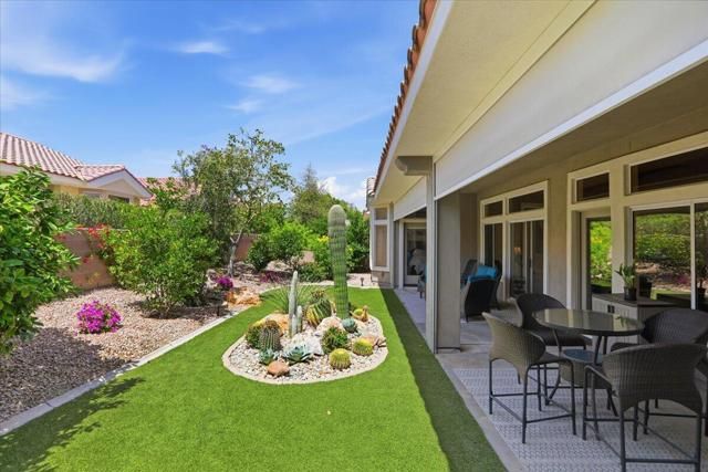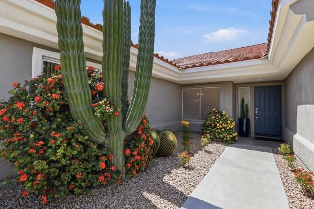A beautifully updated Two-Bedroom with Exceptional Upgrades. This Desert Gem is in the heart of Sun City, Palm Desert. This impeccably maintained two-bedroom property boasts stunning curb appeal thanks to its beautifully landscaped lot. Step inside to find a completely remodeled kitchen, featuring quartz countertops and like new stainless appliances. Perfect for both casual dining and entertaining guests. The bedrooms are thoughtfully separated for privacy. The open living spaces are filled with natural light, creating a welcoming atmosphere throughout the home. Custom window treatments enhance the beauty of the interior.Enjoy relaxing on the inviting rear patio, surrounded by lush greenery and serene desert landscape. The full length, power drop shade is there for additional comfort during the heat of the day.This Move-In ready residence combines modern upgrades with timeless style making it a perfect choice for those seeking a tranquil retreat in a vibrant community.As a Bonus, the seller is including an electric powered golf cart that is less than 6 years old along with Peloton exercise bike. Let's not forget, the home is sold furnished. Wow!