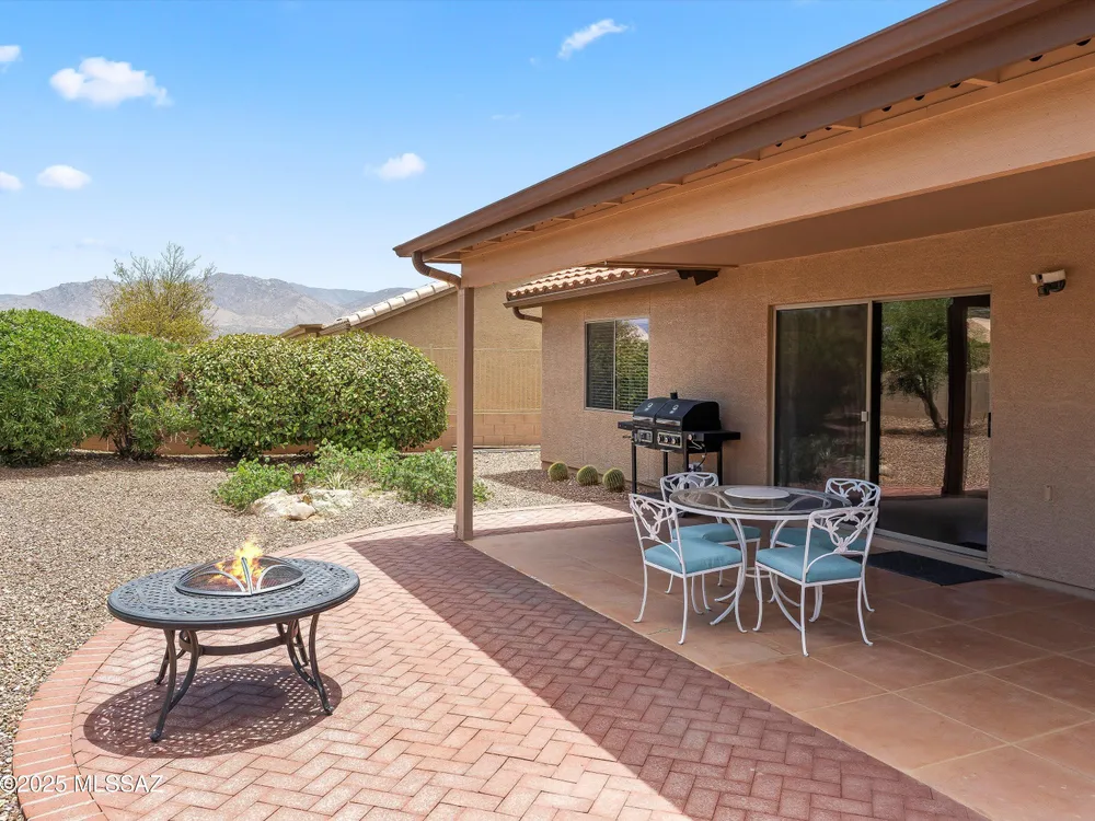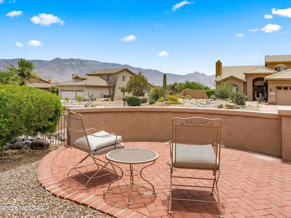 Discover an unparalleled resort-style experience in this immaculate Laredo model home, a sophisticated residence offering 2 bedrooms, 2 bathrooms, and a versatile den across 1,940 square feet within the esteemed SaddleBrooke community. This exquisite, move-in ready showcase home presents a highly sought-after split-bedroom floor plan and commands breathtaking mountain views from nearly every vantage point.Imagine starting your day with awe-inspiring mountain vistas from your gourmet kitchen featuring granite countertops and stainless steel appliances, your dedicated office, or the tranquil, elevated private front patio - an ideal setting for morning coffee or unwinding as the sun sets. The home's meticulous design thoughtfully maximizes these spectacular views, while a cozy gas