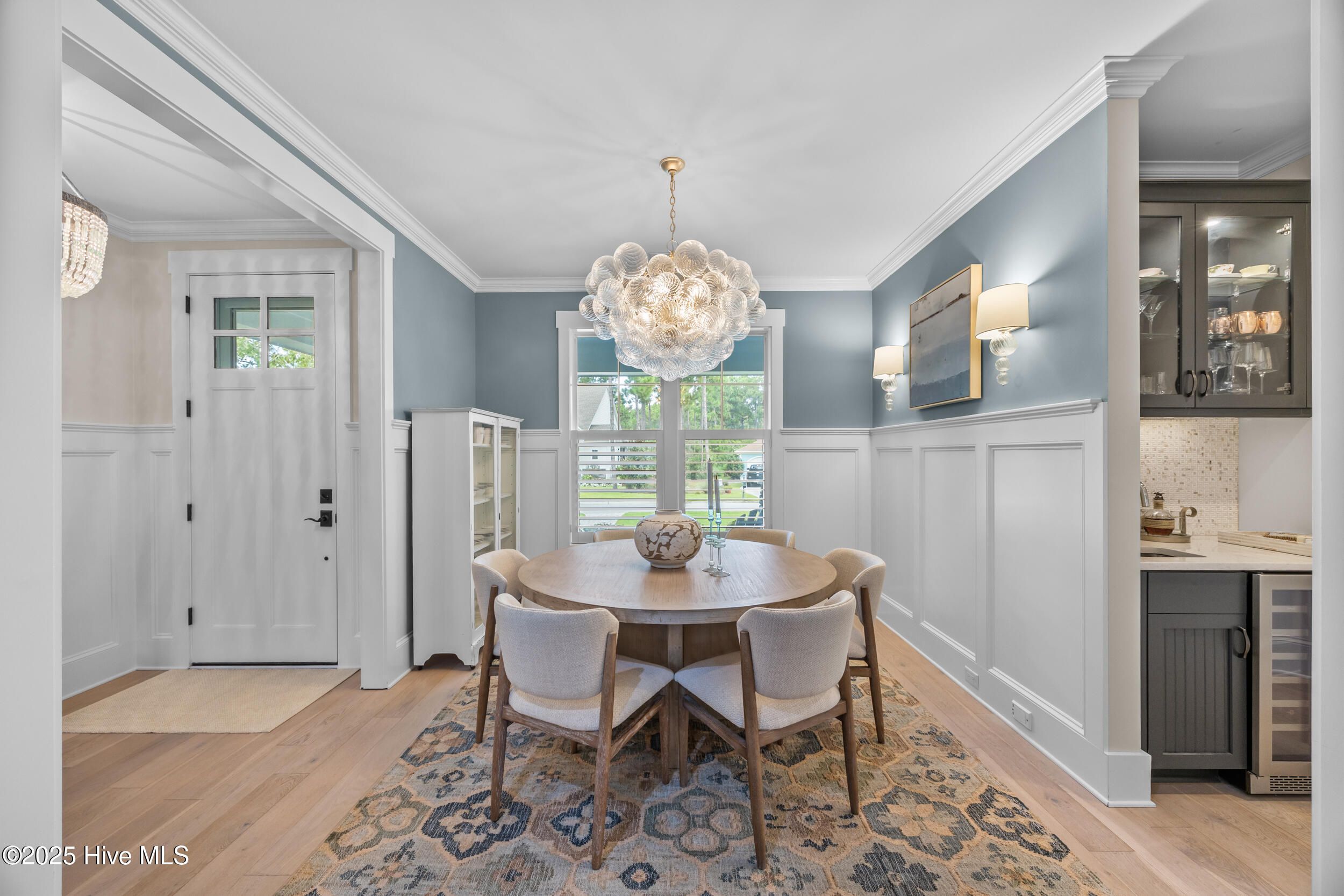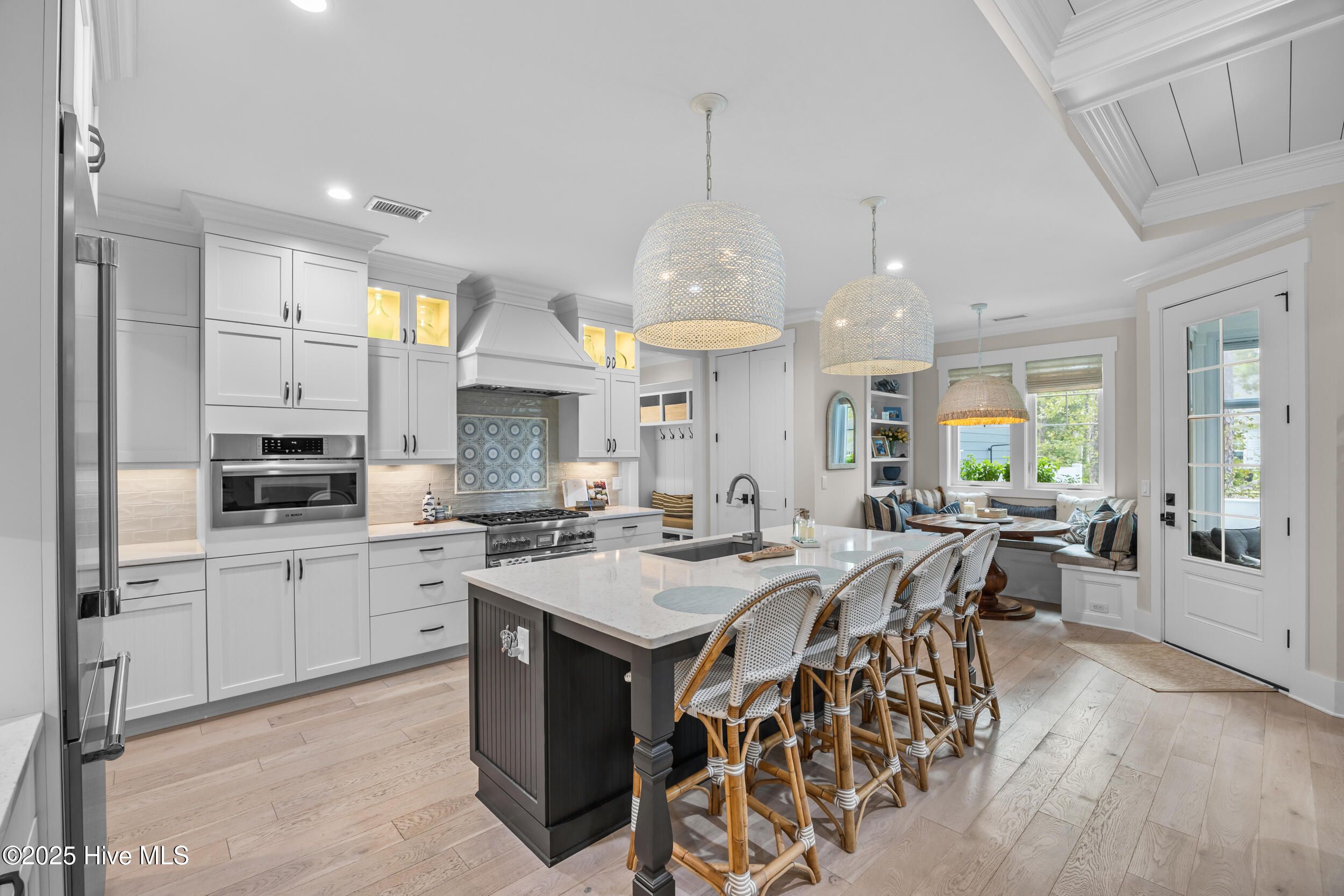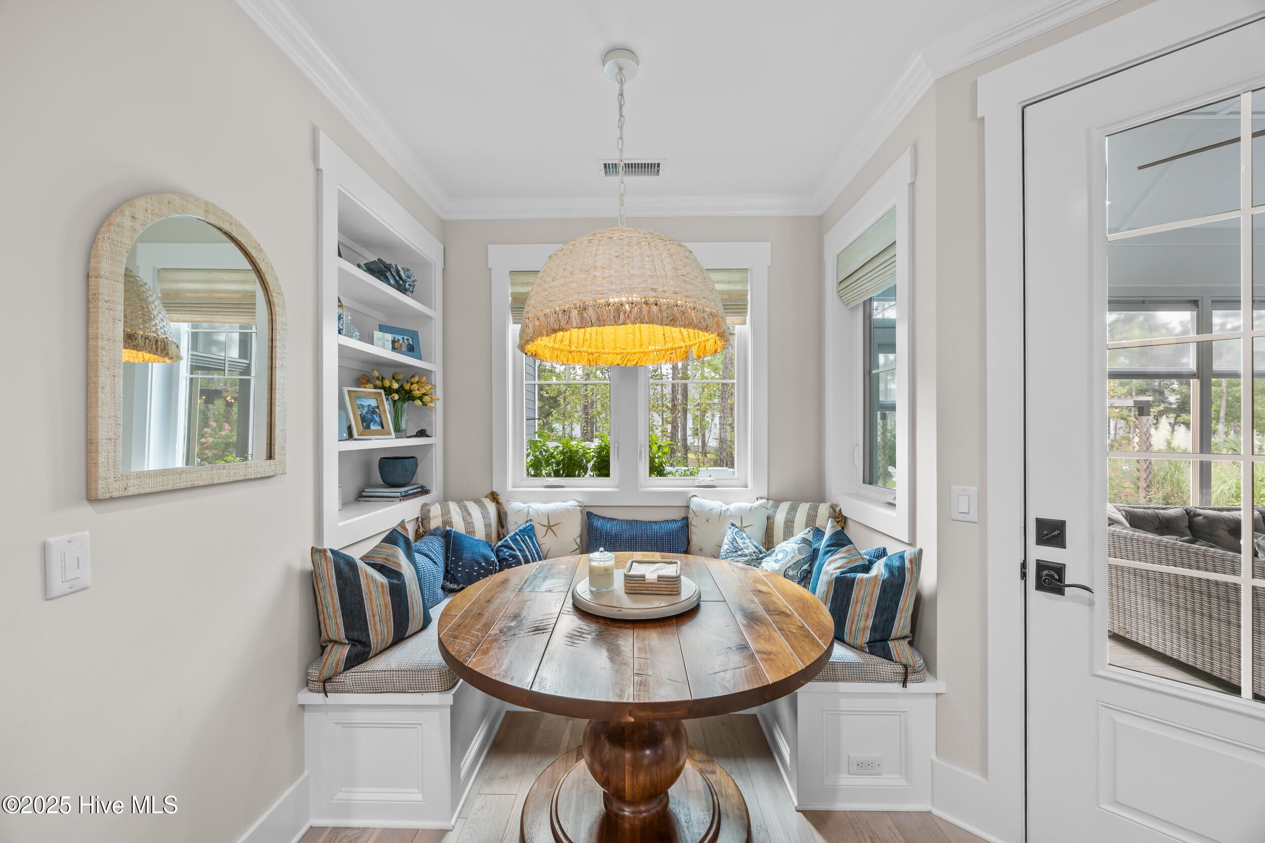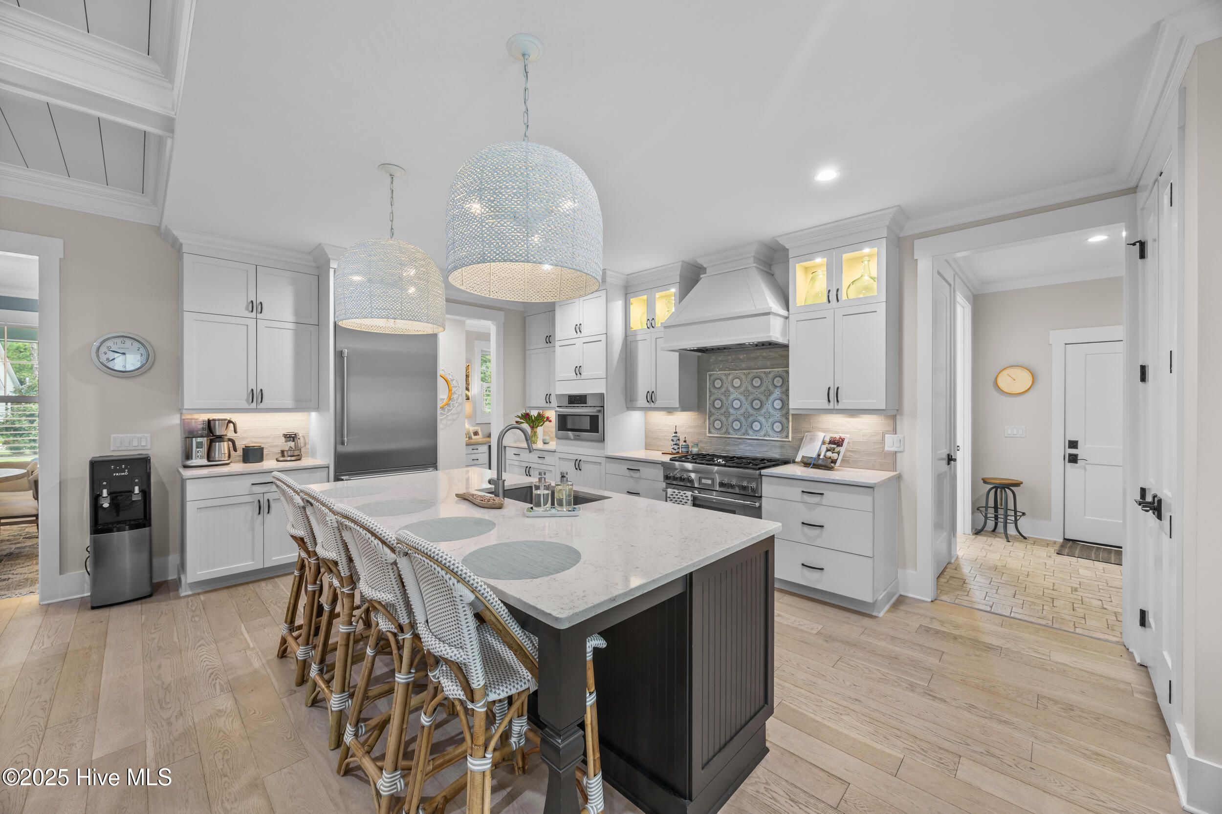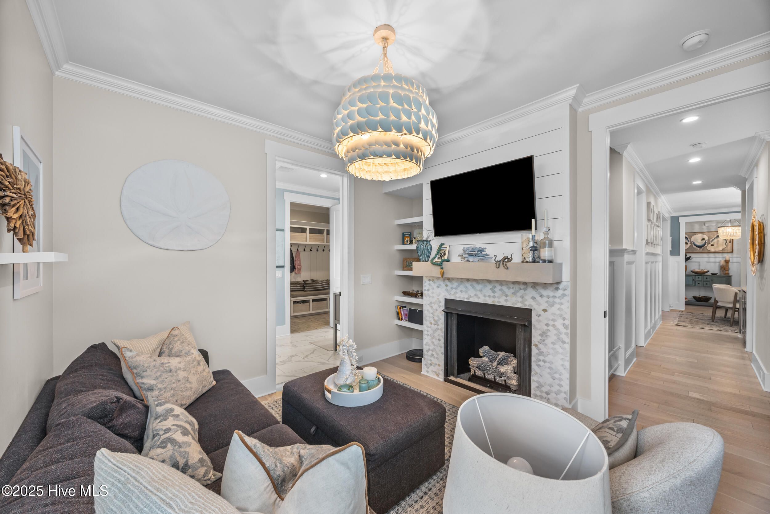 What do you get when you start with a 2019 custom built home by Ultra Luxury Builder, Schiano Development, and then trick it out? Something special! Nestled in the prestigious Reserve neighborhood of Saint James plantation, this custom coastal Craftsman home is perfectly positioned on a corner lot boasting well over $100K in hardscape and lush landscaping improvements which have made this home a serene and private oasis. Step onto the bluestone front porch and immerse yourself in the beauty of the surrounding wooded landscape. The coastal elegance of the interior is evident from the moment that you enter through the 8 foot door where you are greeted with hallmark 7 inch French oak hardwood floors, a 10 foot coffered ceiling with shiplap inlay, as well as extensive wainscoting and crown molding. The custom tile fireplace with a vintage heart pine mantle and custom cabinetry beckons you to relax and unwind. The chef's kitchen is a dream come true featuring custom Hollingsworth soft close cabinets with pullouts for easy organization, white quartz countertops, and Thermador appliances. Multiple dining and entertainment options are available, including a formal dining room, island bar seating, and a delightful breakfast nook with custom banquette. A Butler's pantry with a wine fridge and a wet bar, as well as a laundry room with the extra cabinetry add to this home's appeal. Stunning features can be found in the first floor, large primary bedroom including a vaulted shiplap ceiling with exposed beam detail and lots of natural light. The ensuite boasts a zero entry custom tile shower, double vanity with quartz countertop and a walk in closet with fully updated custom wood closet system. The additional bedroom downstairs has a charming second fireplace with tile surround that can be used as a flex space, office, or guest quarters with its own attached luxury bathroom with a second zero entry shower. A workspace conveniently located off the kitchen
