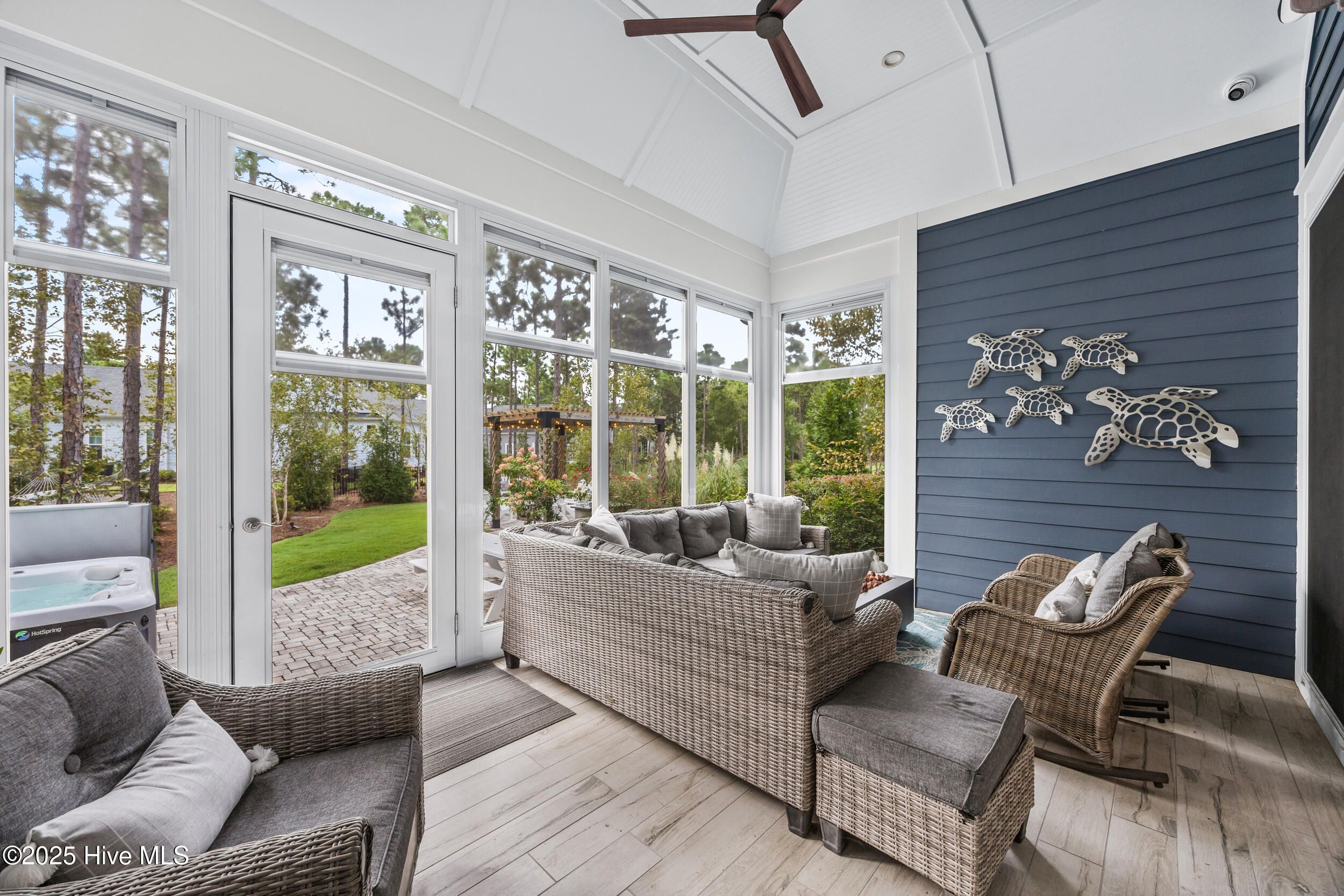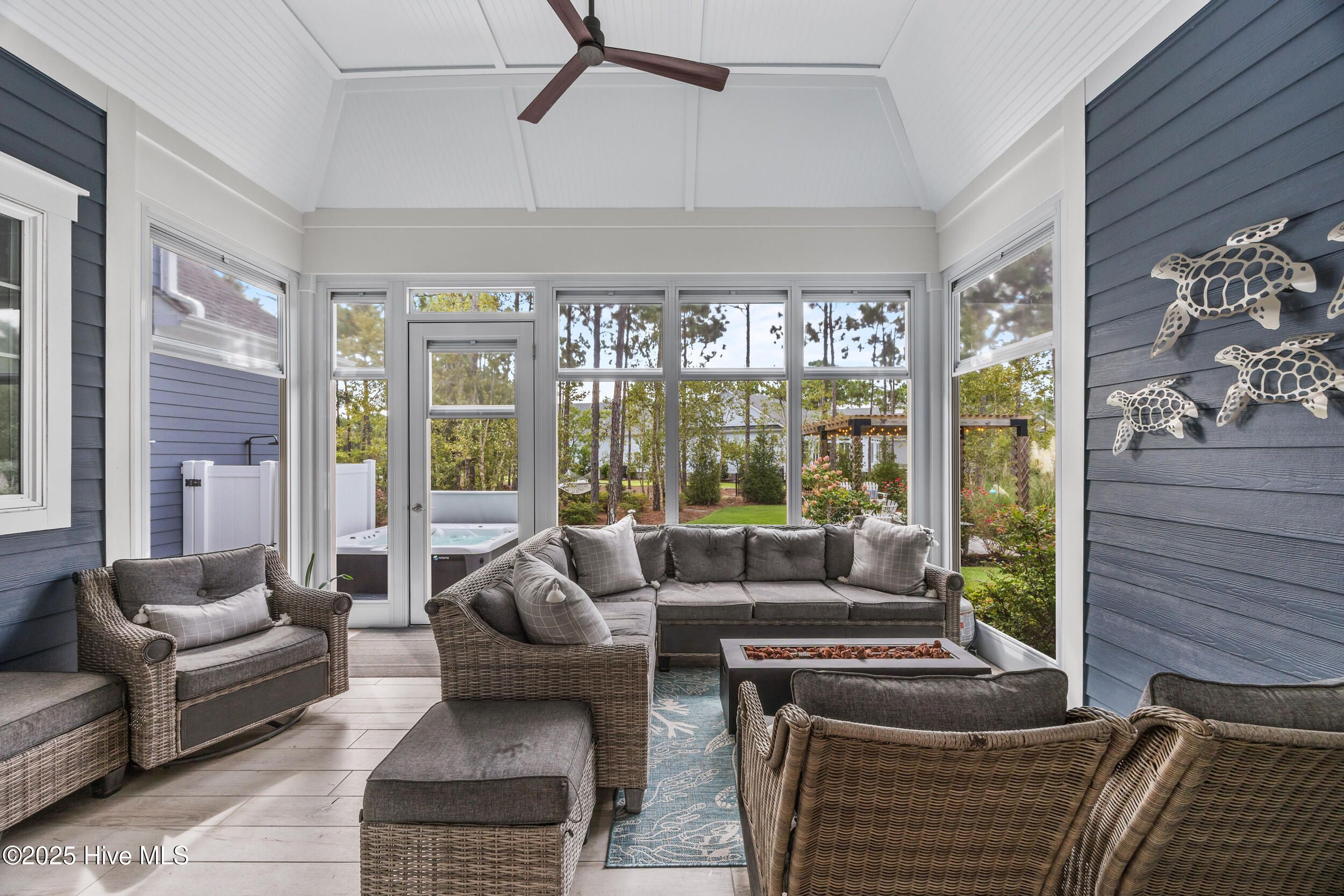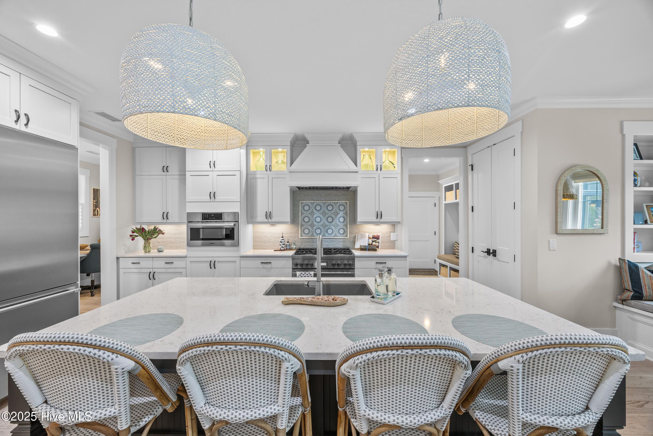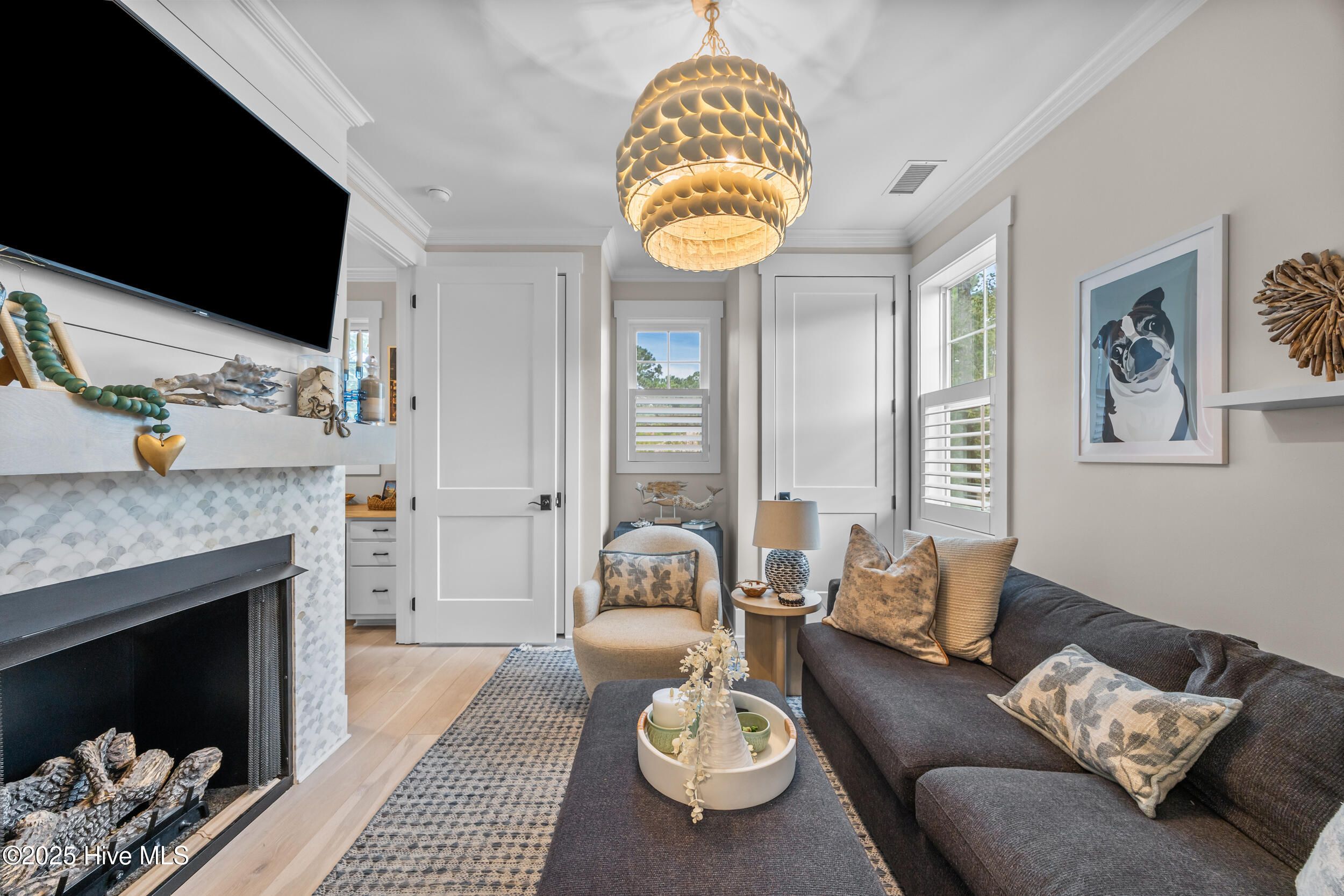 What do you get when you start with a 2019 custom built home by Ultra Luxury Builder, Schiano Development, and then trick it out? Something special! Nestled in the prestigious Reserve neighborhood of Saint James plantation, this custom coastal Craftsman home is perfectly positioned on a corner lot boasting well over $100K in hardscape and lush landscaping improvements which have made this home a serene and private oasis. Step onto the bluestone front porch and immerse yourself in the beauty of the surrounding wooded landscape. The coastal elegance of the interior is evident from the moment that you enter through the 8 foot door where you are greeted with hallmark 7 inch French oak hardwood floors, a 10 foot coffered ceiling with shiplap inlay, as well as extensive wainscoting and crown molding. The custom tile fireplace with a vintage heart pine mantle and custom cabinetry beckons you to relax and unwind. The chef's kitchen is a dream come true featuring custom Hollingsworth soft close cabinets with pullouts for easy organization, white quartz countertops, and Thermador appliances. Multiple dining and entertainment options are available, including a formal dining room, island bar seating, and a delightful breakfast nook with custom banquette. A Butler's pantry with a wine fridge and a wet bar, as well as a laundry room with the extra cabinetry add to this home's appeal. Stunning features can be found in the first floor, large primary bedroom including a vaulted shiplap ceiling with exposed beam detail and lots of natural light. The ensuite boasts a zero entry custom tile shower, double vanity with quartz countertop and a walk in closet with fully updated custom wood closet system. The additional bedroom downstairs has a charming second fireplace with tile surround that can be used as a flex space, office, or guest quarters with its own attached luxury bathroom with a second zero entry shower. A workspace conveniently located off the kitchen