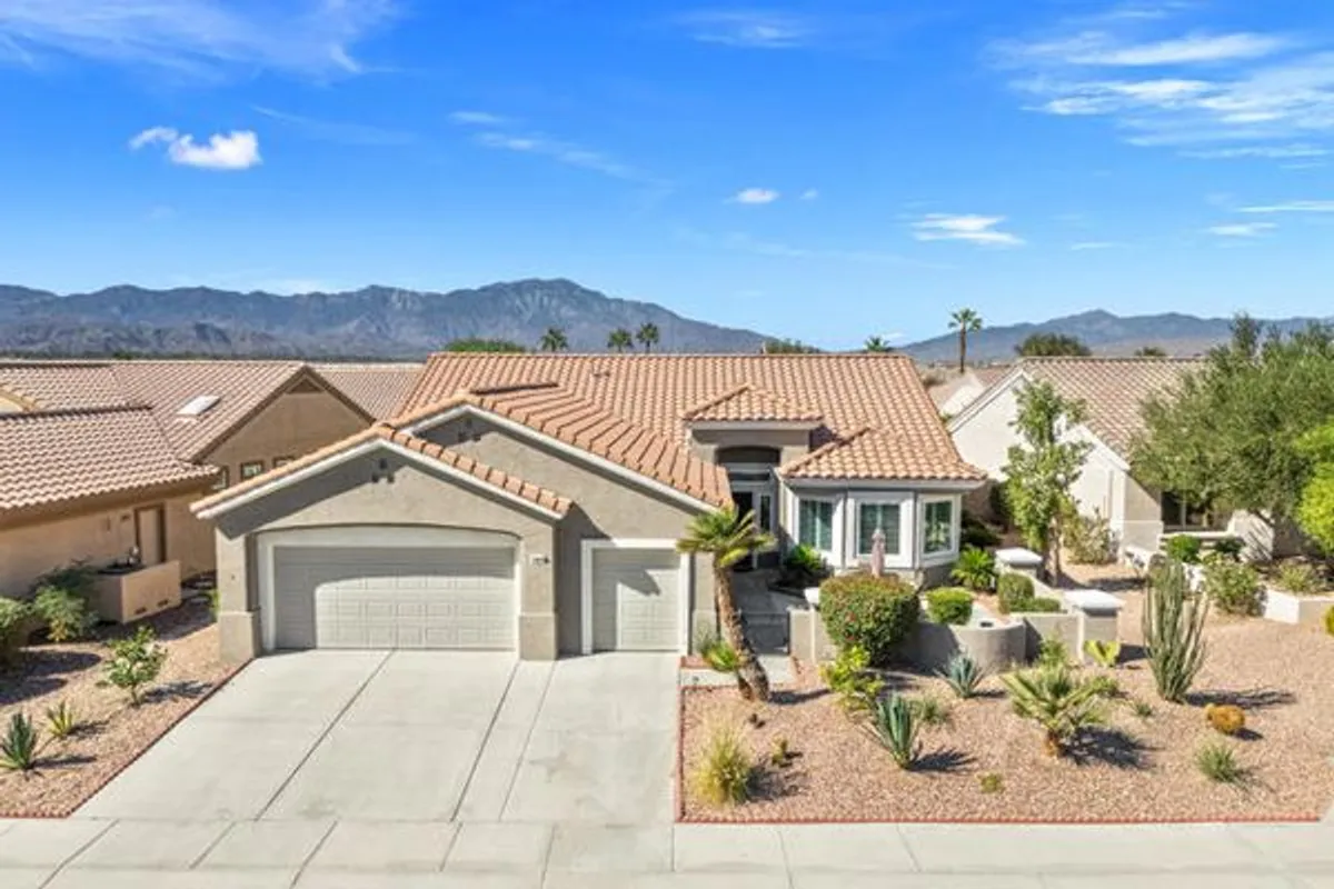 Sun City Palm Desert - Del Webb's Premier 55+ Community. Del Webb's ''Best Bang for Your Buck'' in active adult living! This desirable St. Croix model offers two bedrooms, two baths, a spacious den/office, and an additional hobby or flex room, along with a two-car garage and separate golf cart bay. Recent upgrades include a brand-new mini-split in the garage, updated HVAC, and all-new windows (2025). The home boasts wonderful curb appeal with fresh exterior paint, lush desert landscaping, and a gated courtyard perfect for enjoying your morning coffee. Inside, plantation shutters, ceiling fans, and 20-inch tile flooring enhance the light, open layout. The great room offers recessed lighting, a built-in media center, and sliding doors that lead to the extended covered patio, ideal for relaxing or entertaining outdoors. The kitchen features beautiful white quartz countertops, a flat breakfast bar, and taupe cabinetry accented with brass pulls. A chef's island, coffee bar, stainless steel appliances, gas cooktop, pantry, recessed lighting, and a bay-window dining area complete the space.The primary suite includes a bay window with courtyard views, quartz bathroom counters, dual vanities, painted cabinetry with custom hardware, a stall shower, and a spacious walk-in closet with an organizing system. The guest bedroom is privately located on the opposite side of the home, with a bathroom offering a marble counter, painted cabinet, and tub/shower combo. Additional highlights include a den and hobby room with folding privacy doors, recessed lighting, new fan/lights, a pocket door, and direct garage access. The laundry room includes upper cabinets, a linen closet, and a washer and dryer. The garage features ample storage cabinets, a workbench, mini-split AC, and access to the home's AC equipment. The extended covered patio is perfect for outdoor dining, entertaining, or simply enjoying the tranquil desert ambiance. ''Buy where you love to play--Sun City Palm Desert!''''