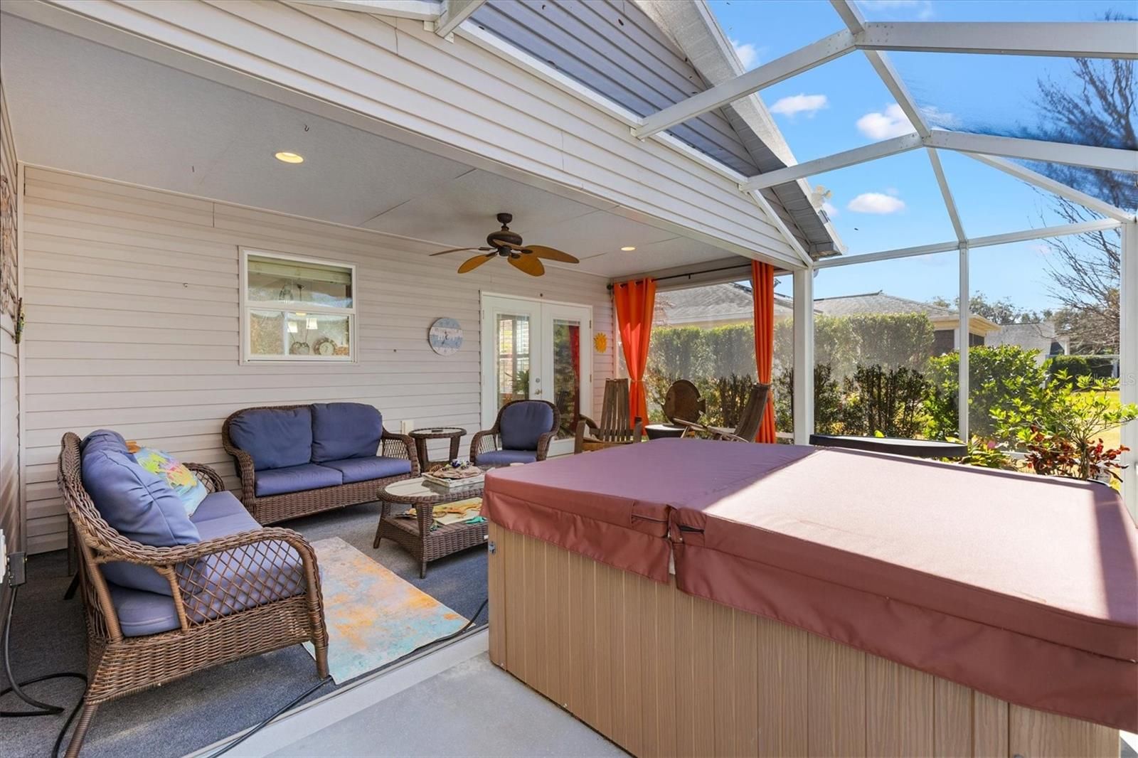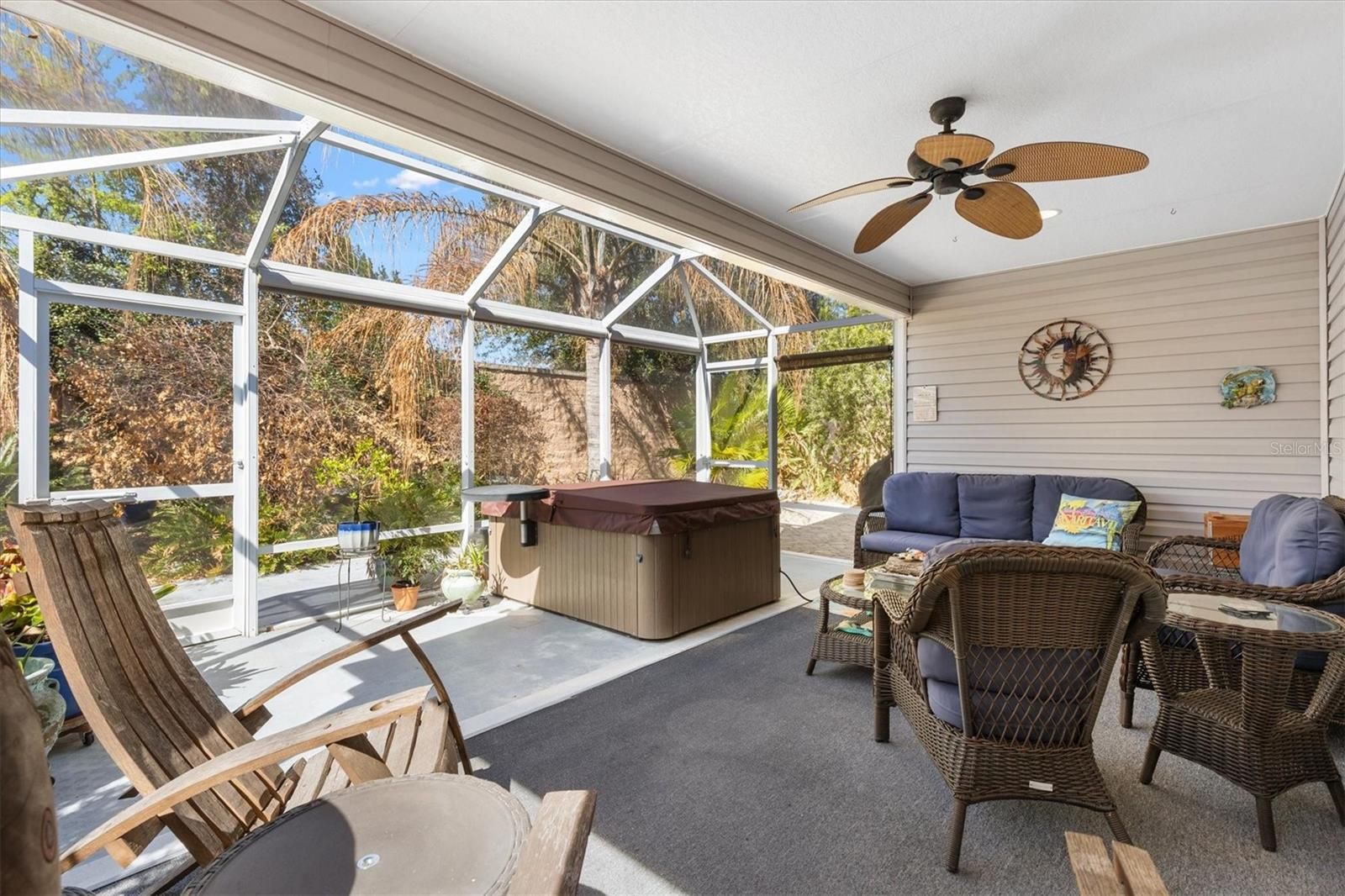 Discover this meticulously designed Seabreeze cottage home offering 3 bedrooms, 2 baths, and a spacious 2-car garage within the charming Village of Hillsborough. Enjoy an open-concept living area perfect for entertaining, with a prime location close to everything you love in The Villages. Take note of this homes curb appeal featuring a decorative painted drive, manicured lawn, and Florida landscape with decorative raised stone wall. The extended paver patio is great place to relax and visit with friends. As you approach the home you are greeted with a full glass front door with sidelight and a retractable screen. Upon entering there is a small foyer that opens up to this awesome open floor plan. The spacious living/dining area features luxury vinyl flooring with volume ceilings, lighted ceiling fan, and plantation shutters. The kitchen area has been upgraded with custom backsplash, single granite sink with touch less faucet and upgraded appliances. The primary bedroom features ensuite bath with shower and dual sinks. There are two bedrooms perfect for guests or a home office. The laundry room features additional cabinets with laundry tub. The best is yet to come! Check out this private back yard with privacy wall and extended lanai. This is a great place to enjoy your morning coffee or afternoon refreshment. With over $50K in upgrades this home is waiting for you! This home is located in close proximity to Brownwood Paddock Square, Evans prairie Country Club and the infamous Eisenhower Recreation Center.