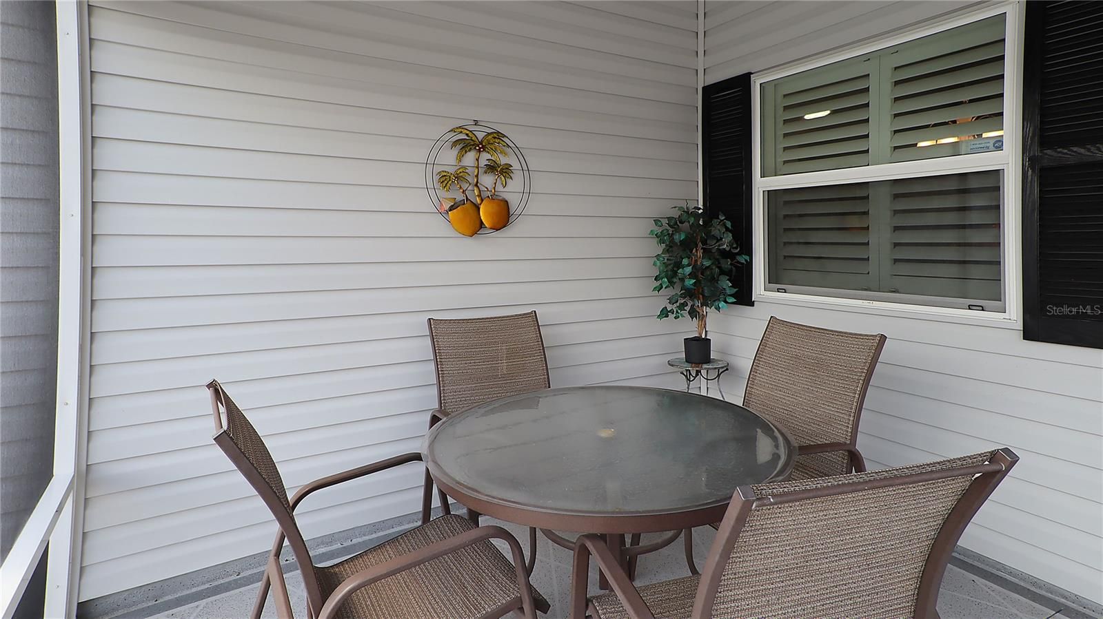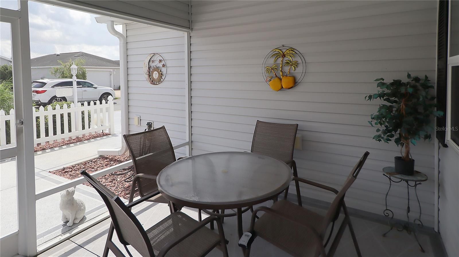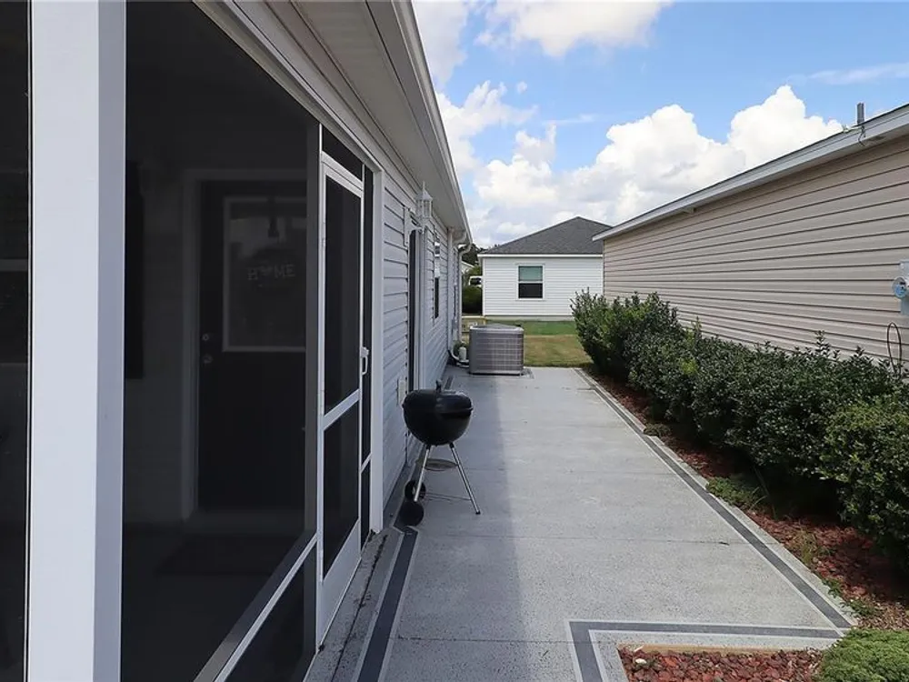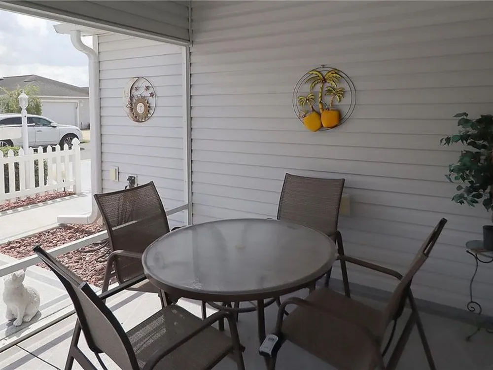 This beautiful Colony patio villa located in Hillsboro New Haven Villas, is perfect for an investor or a snow bird and is being sold TURNKEY with a few exceptions. ( piano and bench, kitchen table and chairs, curio cabinet and contents). This lovely 2/2 has vaulted ceilings and luxury vinyl planking throughout, no carpet. This home is all electric and has a nice kitchen with room for a table and chairs and a bar that you can enjoy sitting and watching the cook in the kitchen. The refrigerator is 2019, all other appliances are 2013. The laminate counters have a nice backsplash and there is a solar tube for extra illumination. There are plantation shutters in the dining room and living room. This open concept home has a nice dining room table and chairs and a sofa and matching reclining chair. Enjoy the fireplace in the living room. The tvs in this home stay, one in the living room and one in each bedroom. The inside of this home is freshly painted. There is a new garage door. This home has an ADT alarm system. The landscaping is rocked for easy care. The driveway and sidewalk have been painted and the lanai is screen enclosed. This home was built in 2013, roof, HVAC, and hot water heater are all original. It is situated between Brownwood and Sumter Landing and close to pools, golf courses and shopping. Taxes $2310.85, Fire $320,71, Maint. $338.02, Bond $700.78 a year. Bond balance is $8,706.84