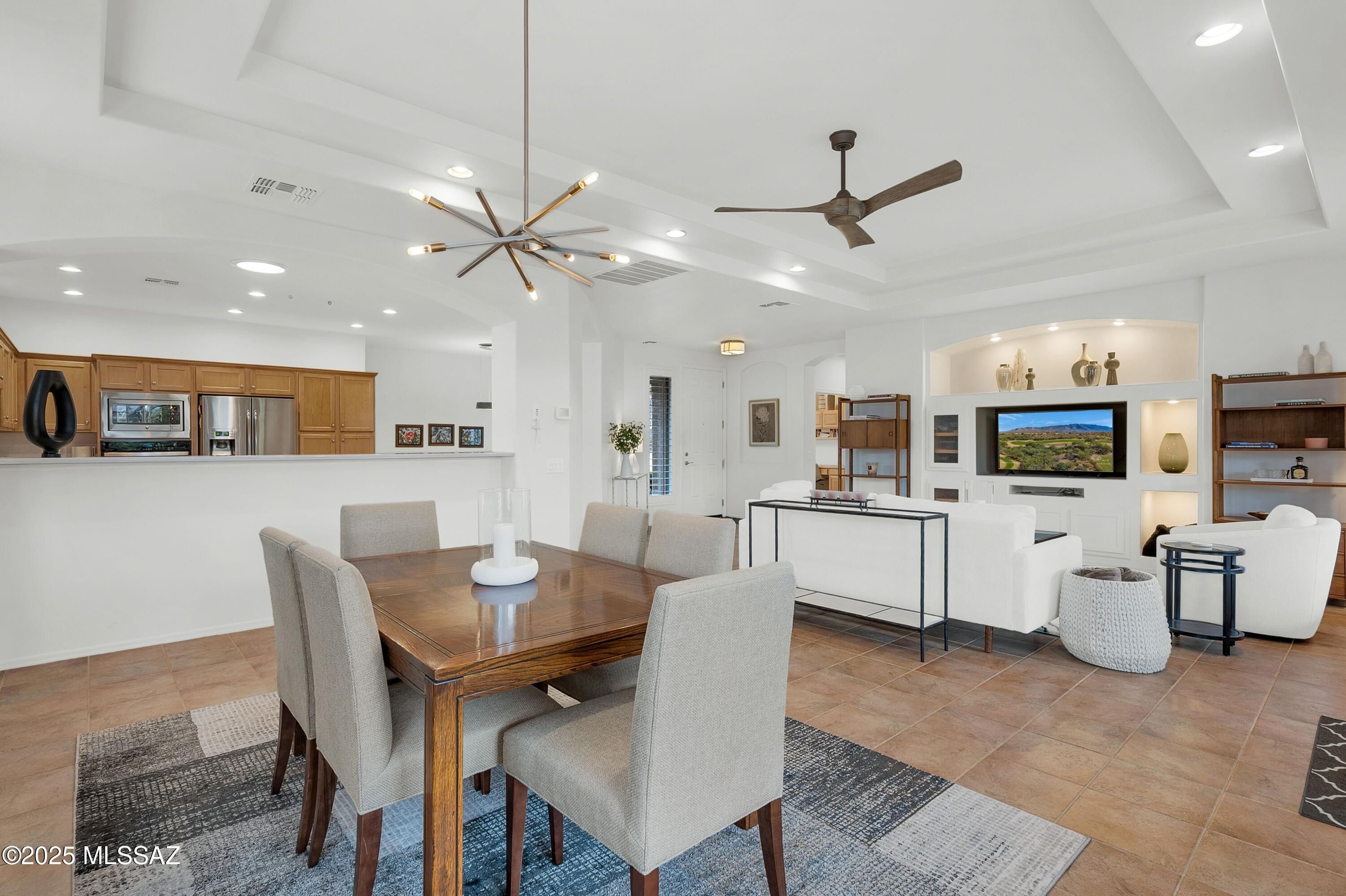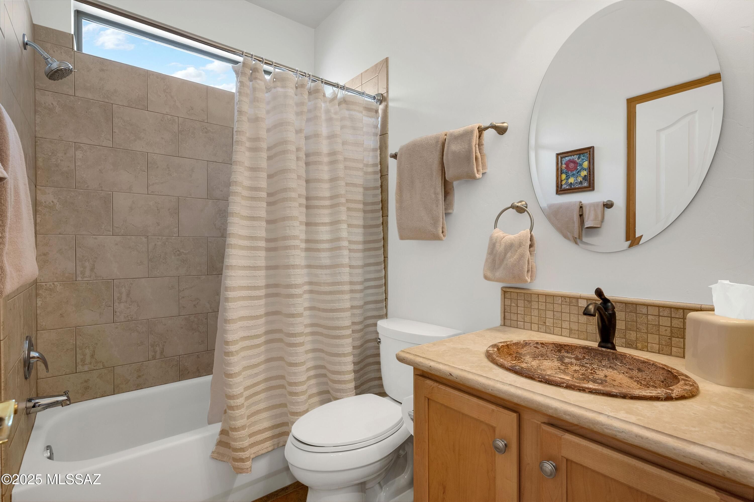 Gorgeous, upgraded Cimarron floorplan w/Casita, mountain views + golf cart garage! Beautiful landscaping & gated courtyard welcome guests. Inside, you'll find updated fixtures & finishes, elegant tray ceilings & custom plantation shutters. Enjoy abundant natural light in great room & spacious, remodeled kitchen w/maple cabs (w/pull-outs!), island, SS appliances + pass-thru to dining -- a culinary dream! Tranquil owner's suite w/slider to patio, dual vanities, custom closet & lg shower. Outside, find a covered patio that encloses with automated shades, built-in BBQ, fruit trees + mtn views! Den features built-ins for perfect home office. Private entrance to Casita w/counter, desk & beautiful bath. Epoxied 2.5-car garage w/cabinets. Enjoy the active adult lifestyle in 55+ SaddleBrooke!