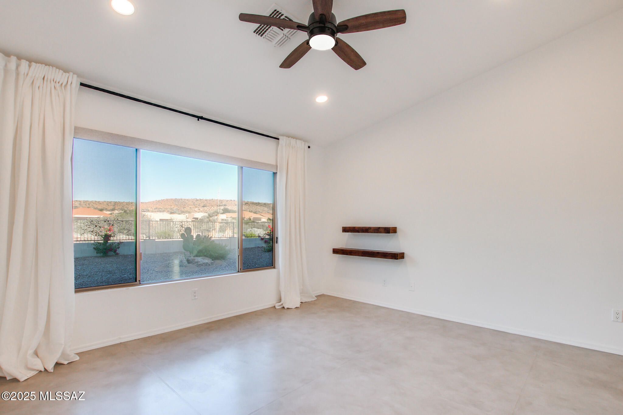 Experience the best of Saddlebrooke living in this beautifully updated 3-bedroom home perfectly positioned on a golf course lot with breathtaking sunset views. The open-concept floor plan features soaring vaulted ceilings and stylish concrete floors throughout.The custom kitchen is a chef's dream, showcasing leathered granite countertops, dovetail cabinetry, a pot filler, and high-end appliances including Beko and ZLine. The spacious living area centers around a cozy gas fireplace--ideal for relaxing or entertaining.The primary suite offers a spa-like bath with a curbless walk-in shower, quartz countertops, and a large walk-in closet. Updated lighting and ceiling fans enhance the home's modern appeal.Step outside to the covered patio complete with a built-in BBQ and fire pit.