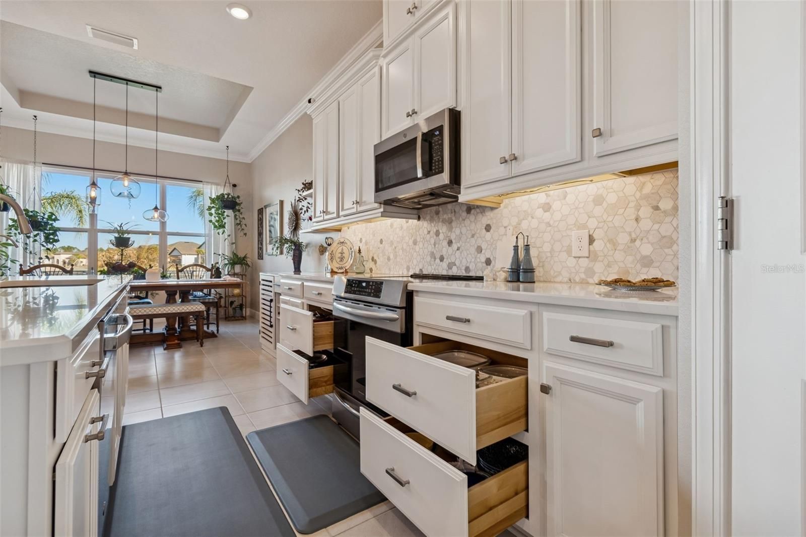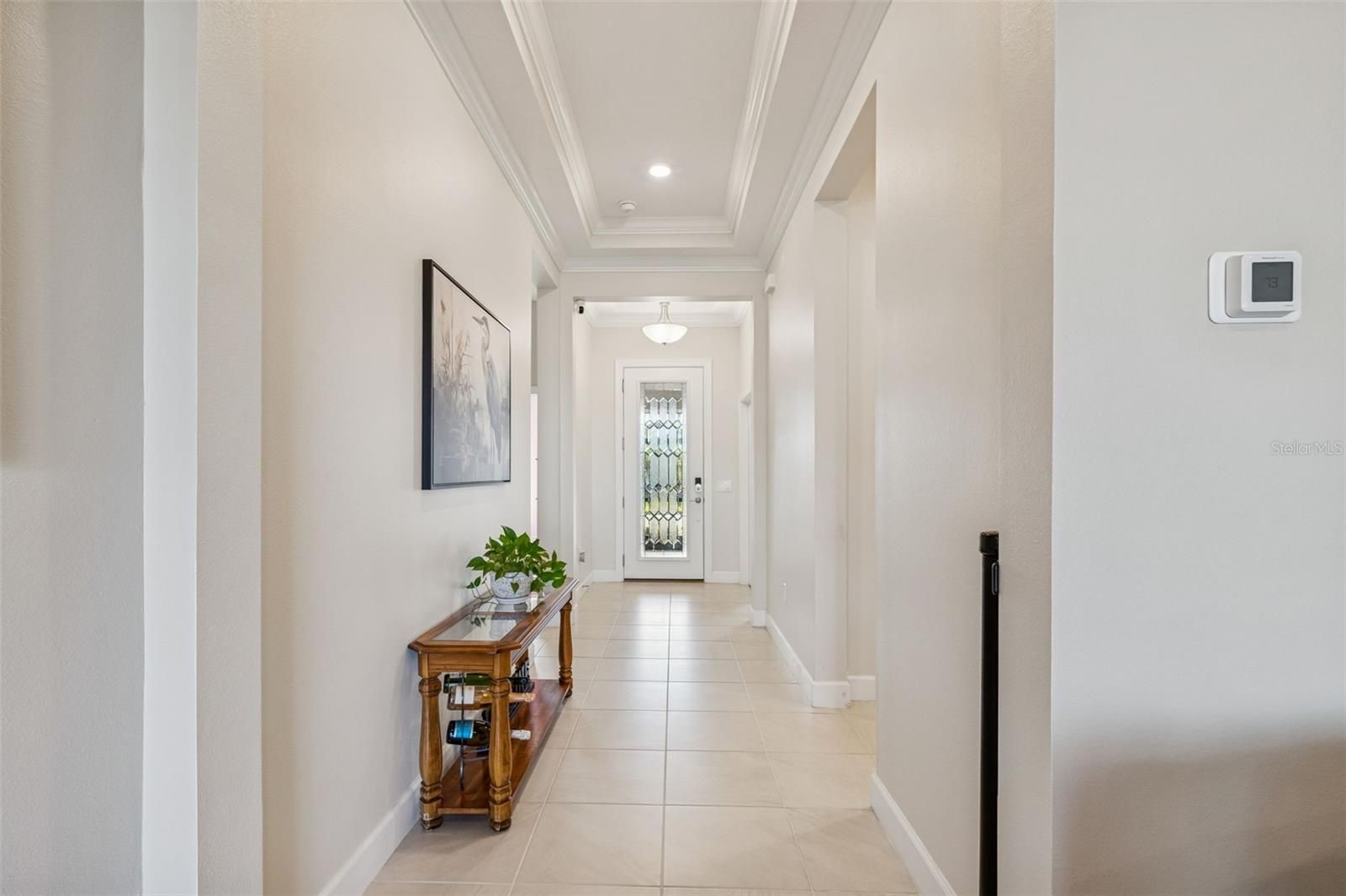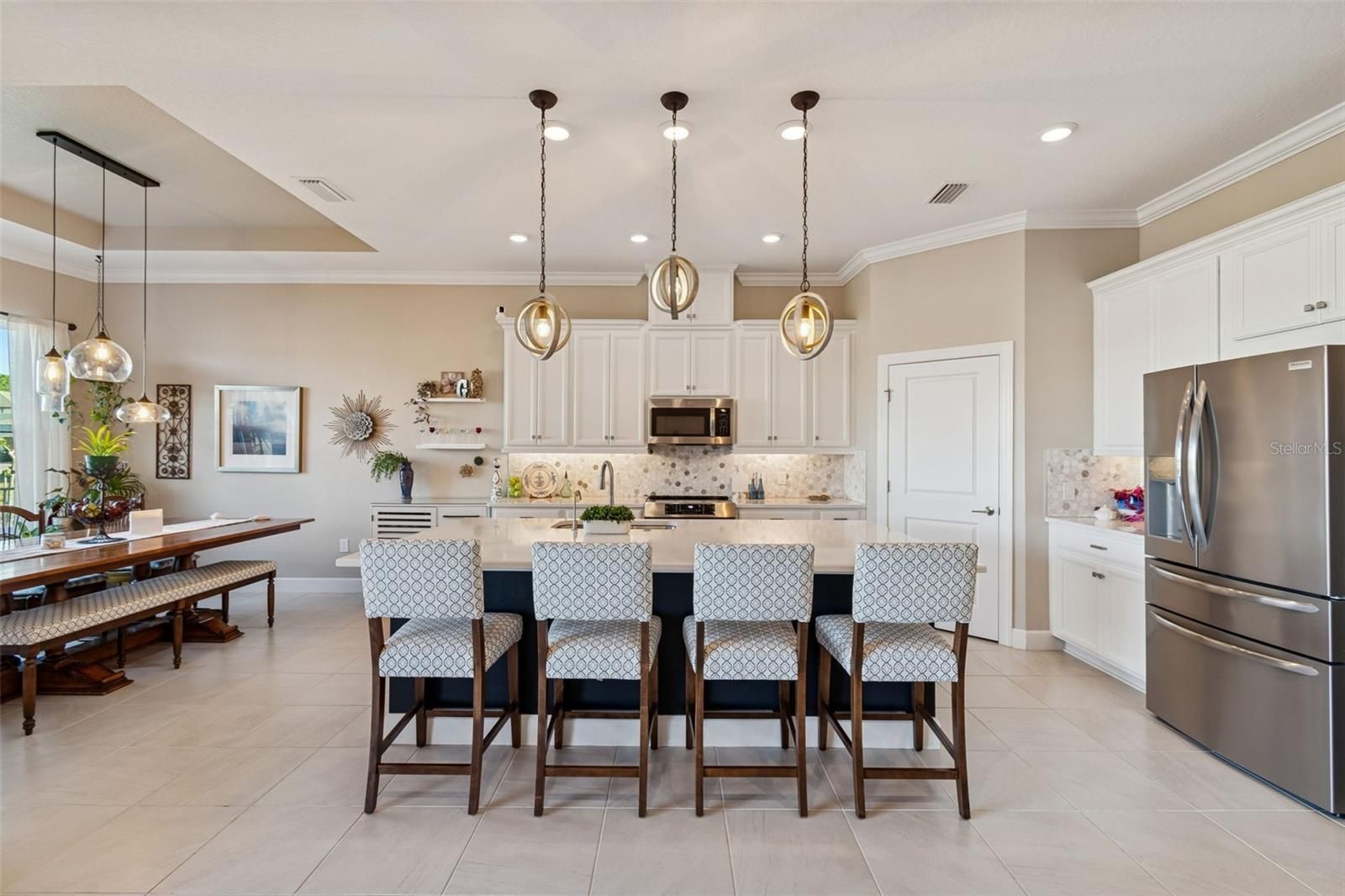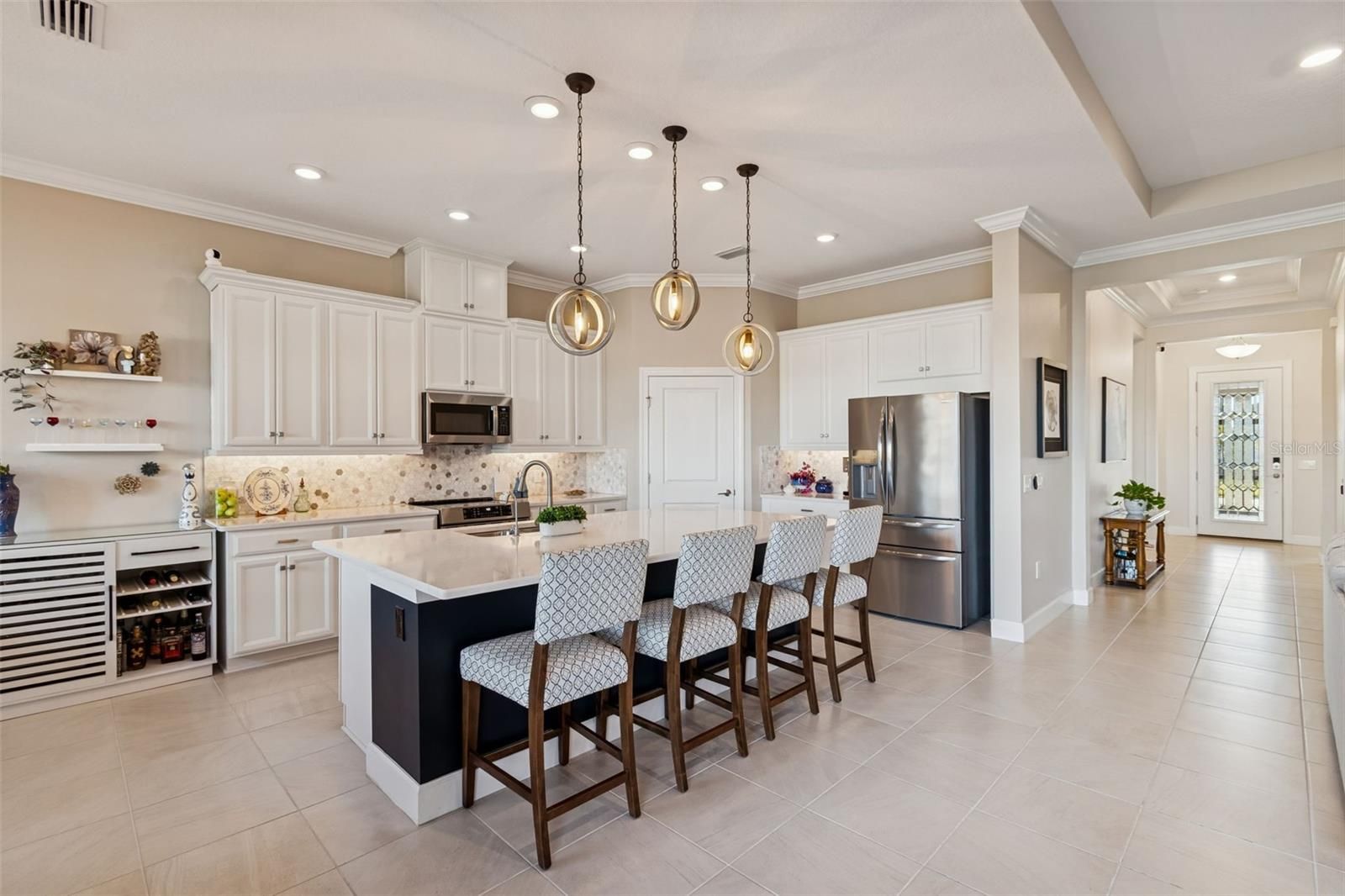 Sought after subdivision of VERSILIA, walking distance to the VILLAGE CENTER with it's 3 Restaurants, Pharmacy, Clubhouse, Indoor & Outdoor POOLS & Fitness Center. ENTER this Lovely home from a Covered Screened porch & you'll be greeted by an elegant LEADED GLASS Front Door which opens onto a large FOYER with TRAY CEILINGS. There is porcelain TILE flooring, throughout most of the home, plush carpeted bedrooms & vinyl plank in the Study/Den. This uniquely designed LETIZIA model, offers 3 separate sleeping areas, each wing with its own bathroom for privacy & convenience. The front wing offers 2 BEDROOMS,1 BATHROOM with a Shower, the STUDY/DEN with double doors located opposite the foyer has VINYL PLANK flooring. Down the hall off the garage you'll find BEDROOM 3 with easy access to a hall BATHROOM with a Tub & large vanity with a single sink. The LAUNDRY room has a FRONT LOAD Washer & Dryer which sits on a storage cabinet for easy access & you have a utility sink for quick cleanups. Located off the Great room is the PRIMARY MASTER SUITE, with its oversized windows which offer a lovely view of the POND, the ENSUITE BATHROOM affords DUAL SINKS, WALK-IN Shower and a large Walk-in CLOSET for two with CUSTOM CAIBENITRY with BUILT-IN Drawers. This NEWER home BUILT in 2022 affords many upgrades, from it's professional FRONT landscaping to the rear EXTENDED SCREENED LANAI overlooking the POND, and there's an OPEN Brick paved BBQ area for grilling & the rear yard is fenced for privacy. Enjoy the breeze from the POND while watching TV from your Lanai & appreciate having NO rear neighbors. This OPEN-CONCEPT Kitchen with its large island, QUARTZ COUNTERS, MOSAIC TILED BACKSPLASH, STAINLESS STEELAPPLIANCES & a large Walk-in PANTRY. The GREAT room area affords 3 Sliding glass doors which open onto the LANAI & is great for entertaining family & friends. Throughout the home you will find, TRAY CEILINGS, custom window treatments, CROWN MOLDING, CEILING FANS, decorative accent wall in the Primary suite & the entire home affords a neutral palette. The Two Car Garage has EPOXY floor covering & OVERHEAD Metal Storage Racks. Don't miss this exceptional home, call to come view it today. The HOA maintains LANDSCAPING & IRRIGATION throughout the community & for individual homesites, it also maintains the roads in the community (being repaved). This is a GATED community with manned guard gates & mobile patrol including POLK County Sheriff patrol. The GATES are AUTOMATED for residents which allows easy access via license plate readers. Your maintenance Fees also include fiber optic internet & Cable. SOLIVITA offers TWO Championship GOLF COURSES, 3 restaurants, SOFTBALL field, PICKLEBALL, TENNIS Courts, SHUFFLEBOARD, 14 HEATED POOLS, TOT Lots, 2 DOG parks & much much more.... Directly across Cypress Parkway at Solivita's main gate, you'll find a HOSPITAL & the newly built Poinciana Lakes Plaza shopping center complete with a grocery store, restaurants (casual & fast food), Banks, Walgreens & more to come.