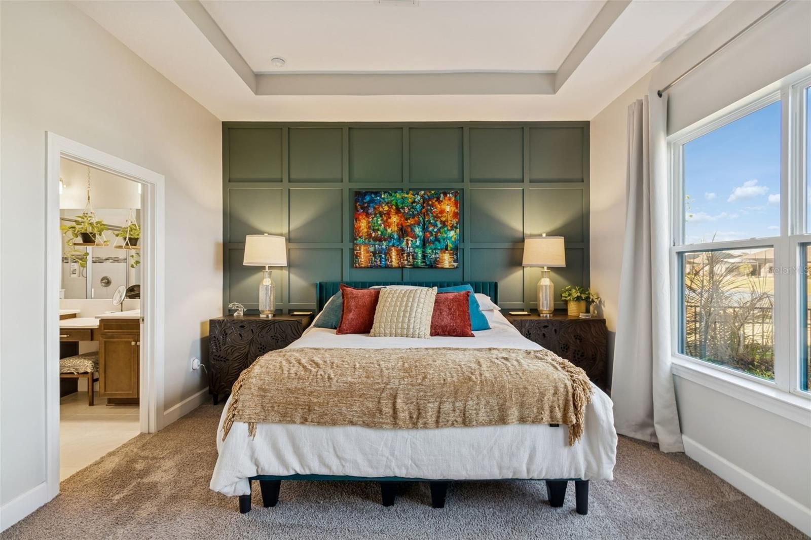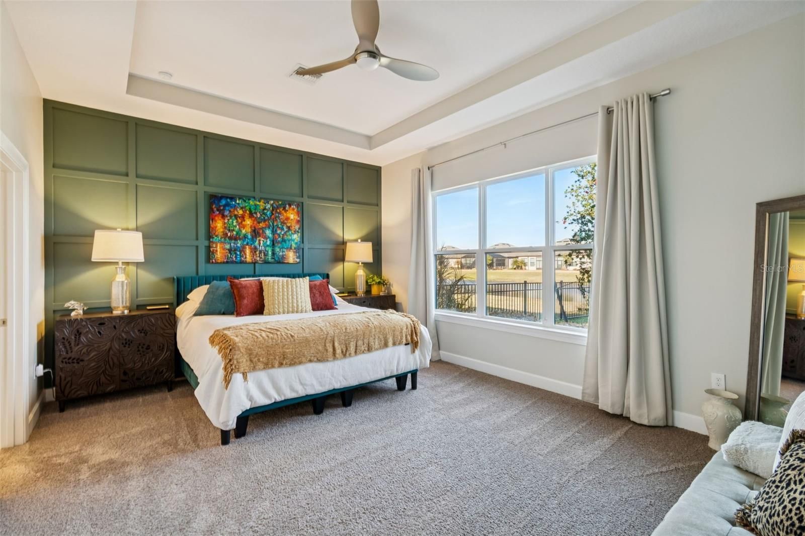 - Ceiling Fan(s), Eat-in Kitchen, High Ceilings, Kitchen/Family Room Combo, Living/Dining Room, Open Floorplan, Main Level Primary, Solid-Wood Cabinets, Split Bedrooms, Stone Counters, Tray Ceiling(s), Walk-In Closet(s), Window Treatments