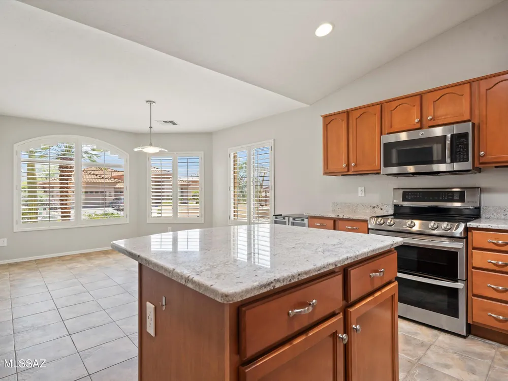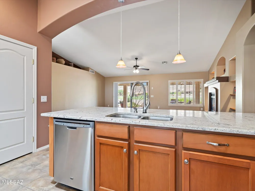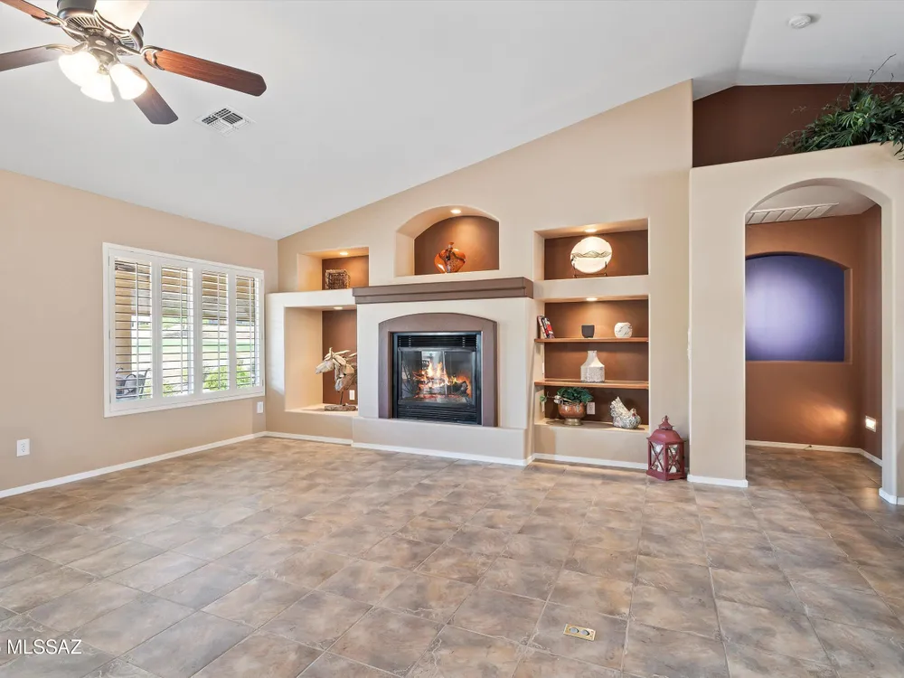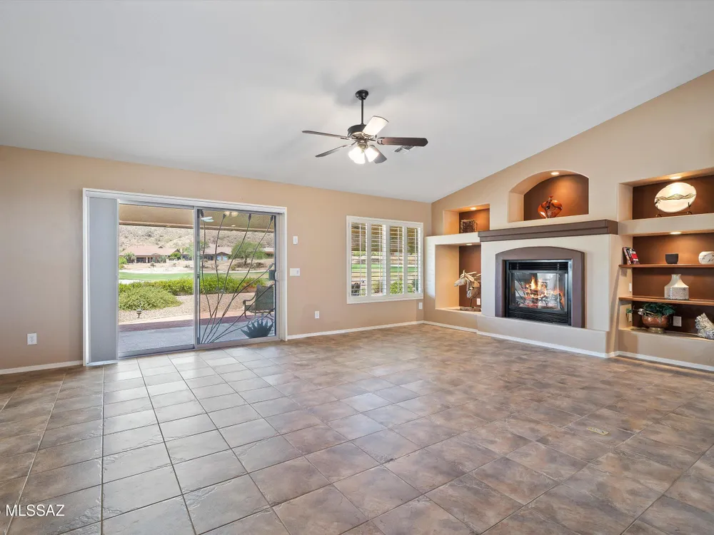 Discover refined desert living in this beautifully appointed 3BD/2BA (1951sq ft) Laredo floor plan. Situated on a premium golf course lot in the highly sought after SaddleBrooke's 55+ active adult community. Spacious owner's suite features a luxurious bath with dual vanities, walk-in shower and closet. Split floor plan offers privacy for guests. Plantation shutters throughout add a touch of elegance and energy efficiency. Chef's kitchen is a culinary dream, featuring granite countertops, center island , SS appliances. It opens to a spacious great room with cozy fireplace, large windows that frame the stunning golf course view. Enjoy serene mornings from your extended backyard patio, complete with built-in grill, bar and relaxing hot tub perfect for entertaining or quiet evenings.