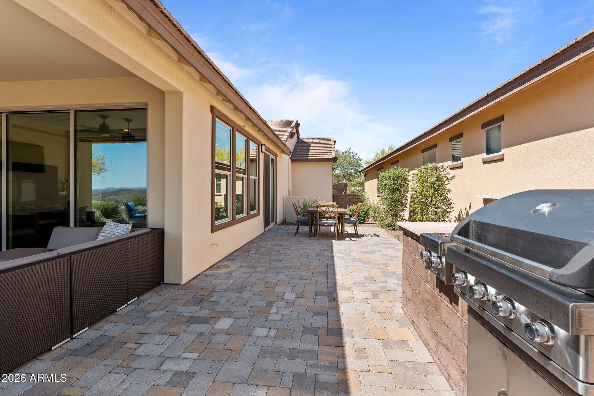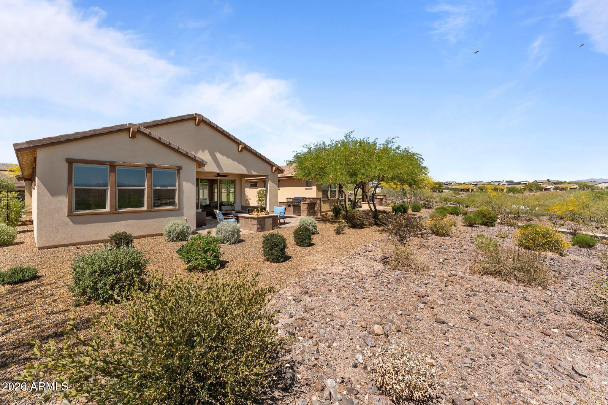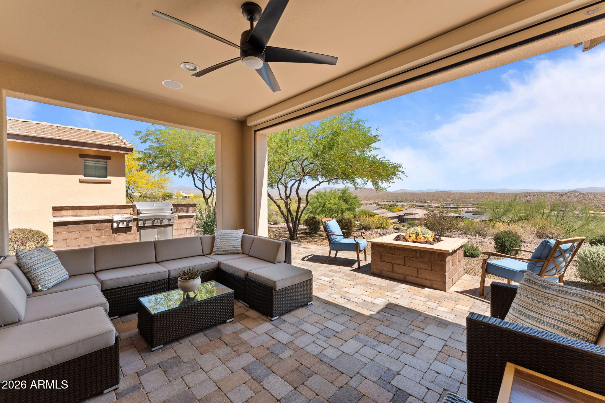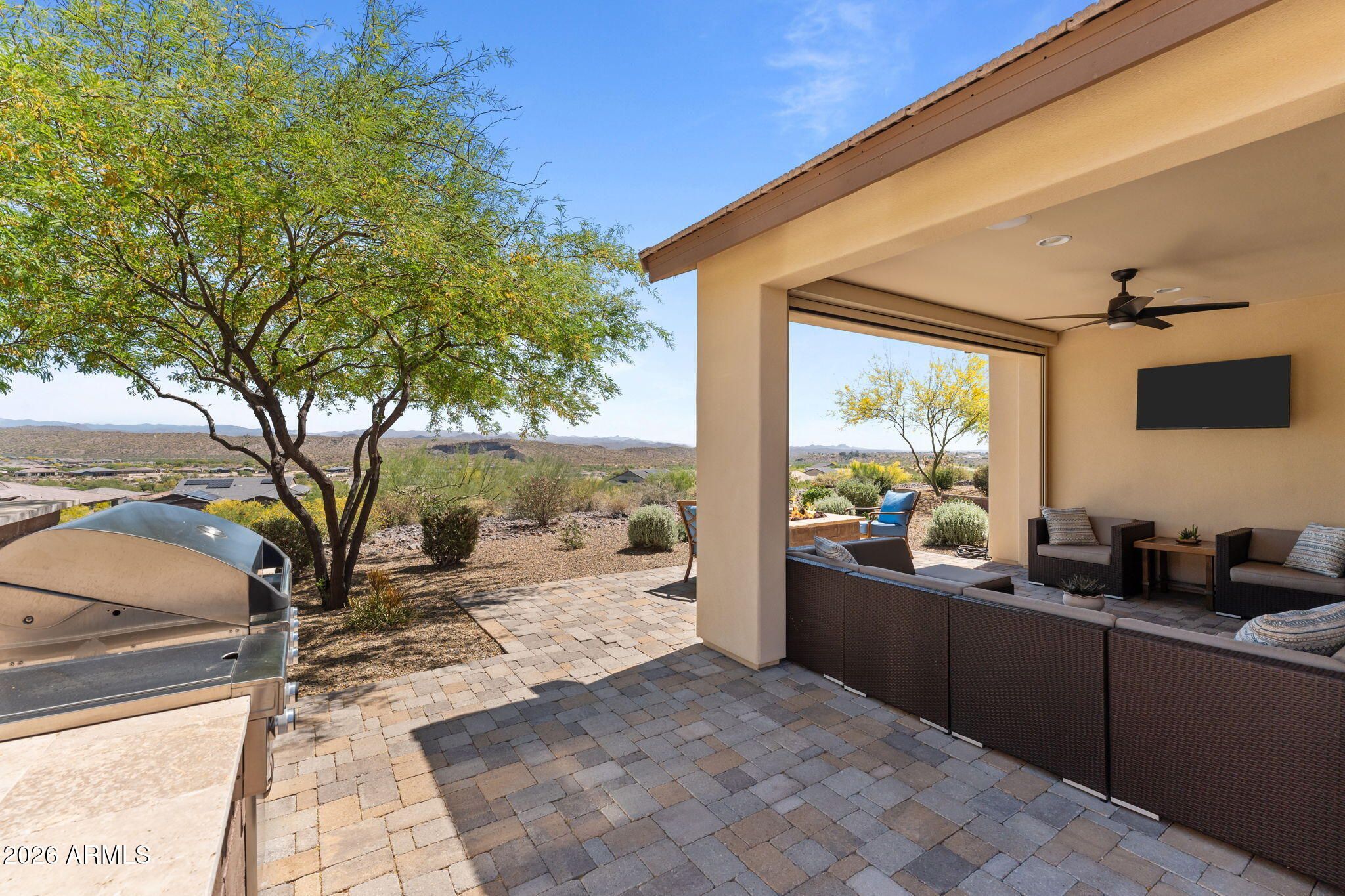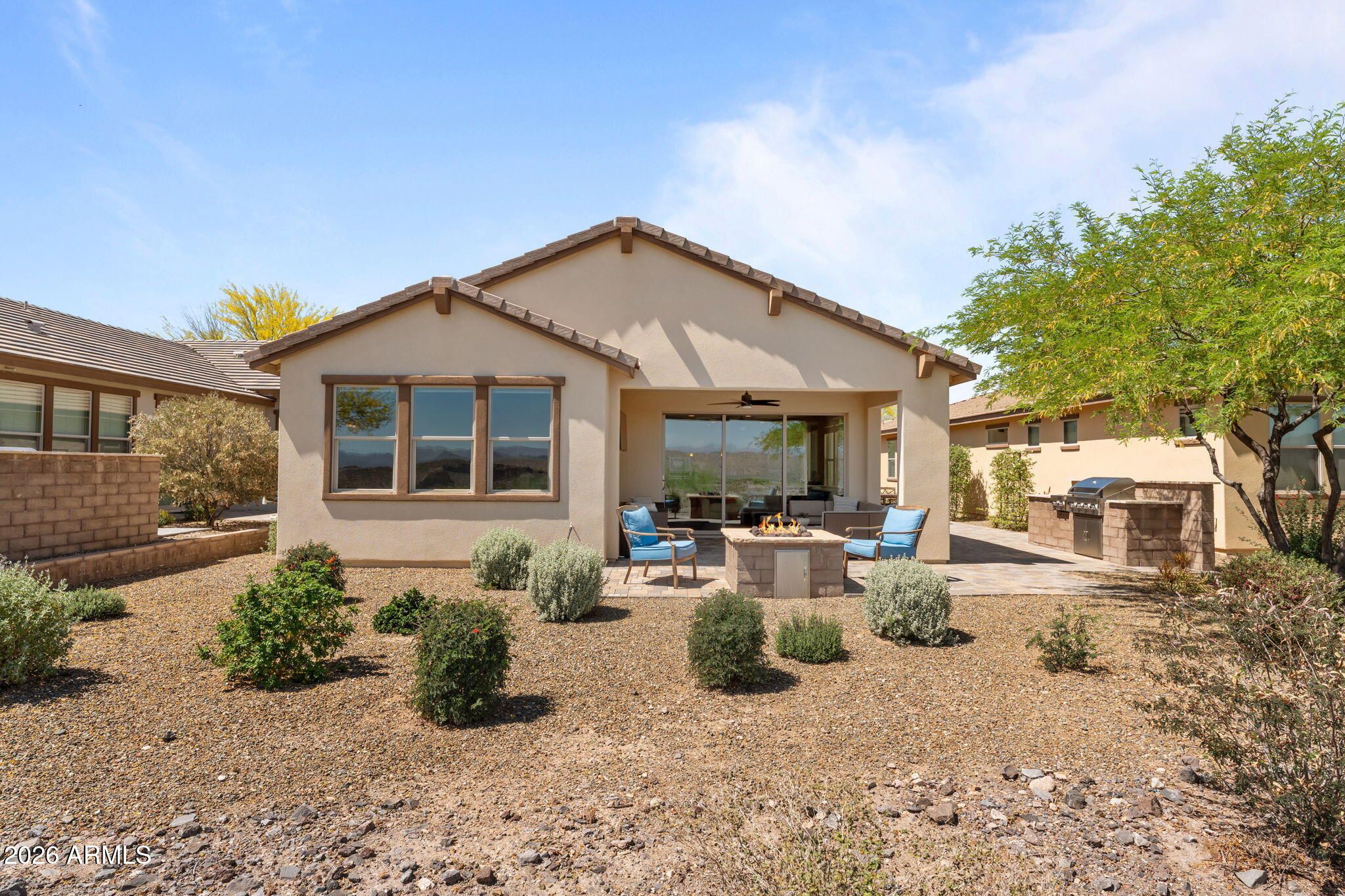COMES FULLY FURNISHED WITH ALL DECOR. Experience spectacular mountain views from this highly upgraded 2 bed, 2 bath home and a den with murphy bed that can serve as a 3rd bedroom. Thoughtful enhancements shine throughout; from the extended 2-car garage to the expansive paver patio, outdoor kitchen, remote screen, and custom fire pit designed for effortless indoor-outdoor living. The gourmet kitchen features upgraded quartz countertops, an electric cooktop, wall oven, and a generous center island perfect for entertaining. The great room offers a dramatic 15' sliding glass door that fills the space with natural light. The dining room boasts a second sliding glass door which opens to a private side patio that seamlessly connects to the built-in BBQ and beautifully finished backyard. The primary suite is a true retreat with dual sinks, a fully tiled shower, a walk-in closet, and gorgeous mountain views. The guest bath offers a spacious, upgraded shower enclosure. Professionally decorated and impeccably maintained, this former model home is offered fully furnished, ready for you to move in and enjoy.
