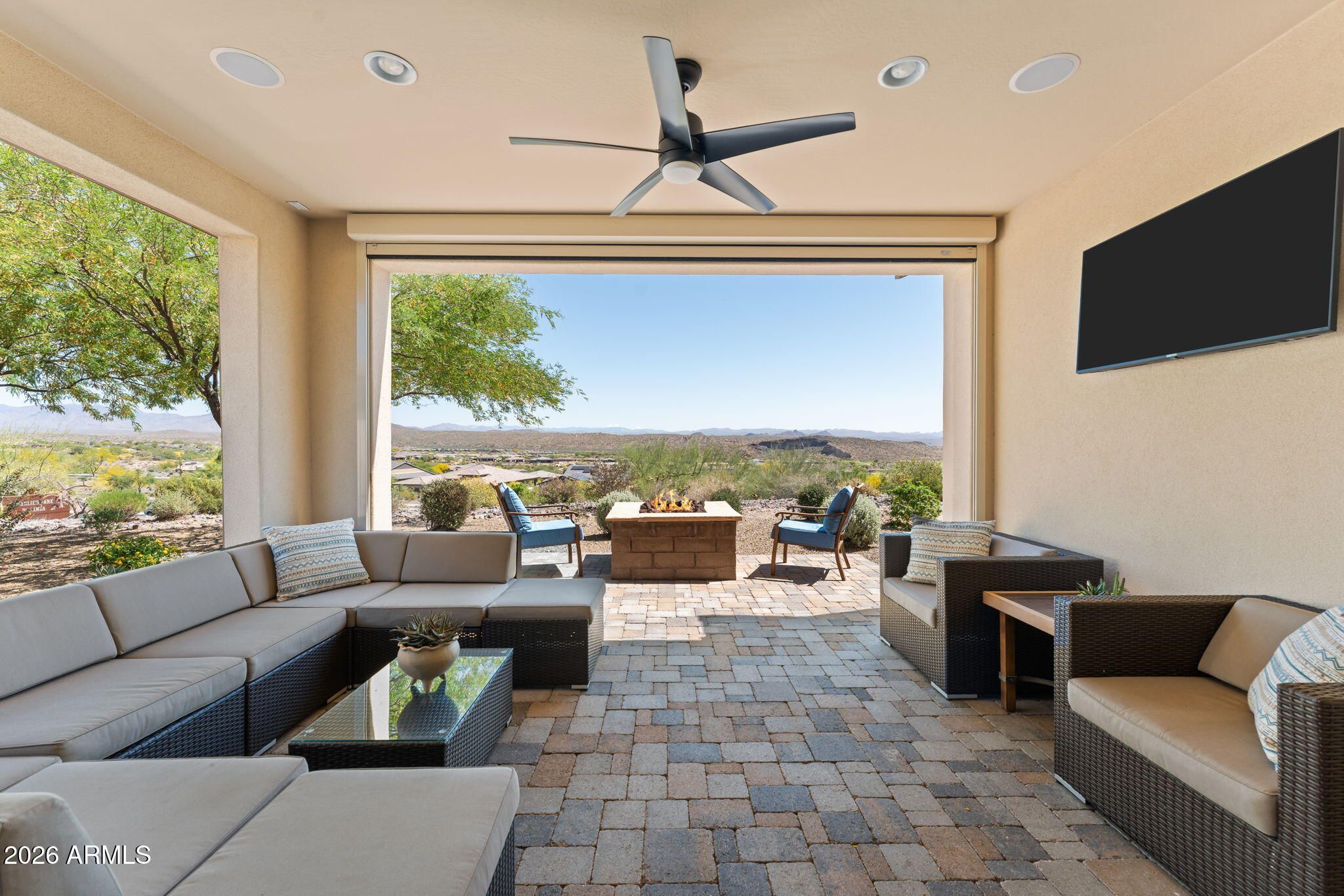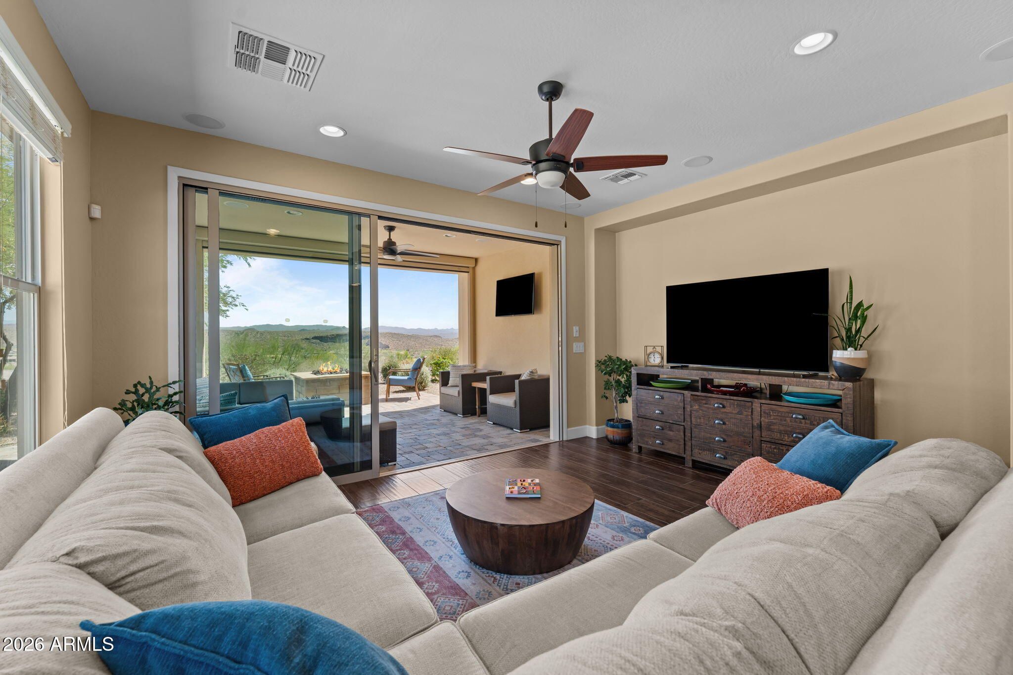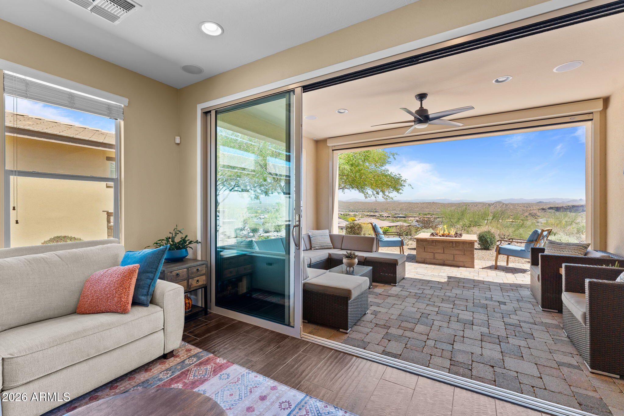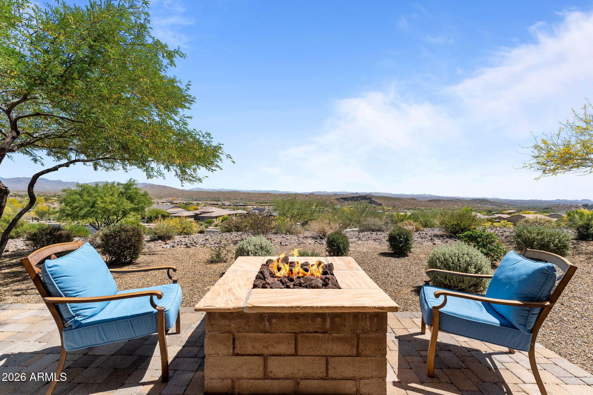 COMES FULLY FURNISHED WITH ALL DECOR. Experience spectacular mountain views from this highly upgraded 2 bed, 2 bath home and a den with murphy bed that can serve as a 3rd bedroom. Thoughtful enhancements shine throughout; from the extended 2-car garage to the expansive paver patio, outdoor kitchen, remote screen, and custom fire pit designed for effortless indoor-outdoor living. The gourmet kitchen features upgraded quartz countertops, an electric cooktop, wall oven, and a generous center island perfect for entertaining. The great room offers a dramatic 15' sliding glass door that fills the space with natural light. The dining room boasts a second sliding glass door which opens to a private side patio that seamlessly connects to the built-in BBQ and beautifully finished backyard. The primary suite is a true retreat with dual sinks, a fully tiled shower, a walk-in closet, and gorgeous mountain views. The guest bath offers a spacious, upgraded shower enclosure. Professionally decorated and impeccably maintained, this former model home is offered fully furnished, ready for you to move in and enjoy.
