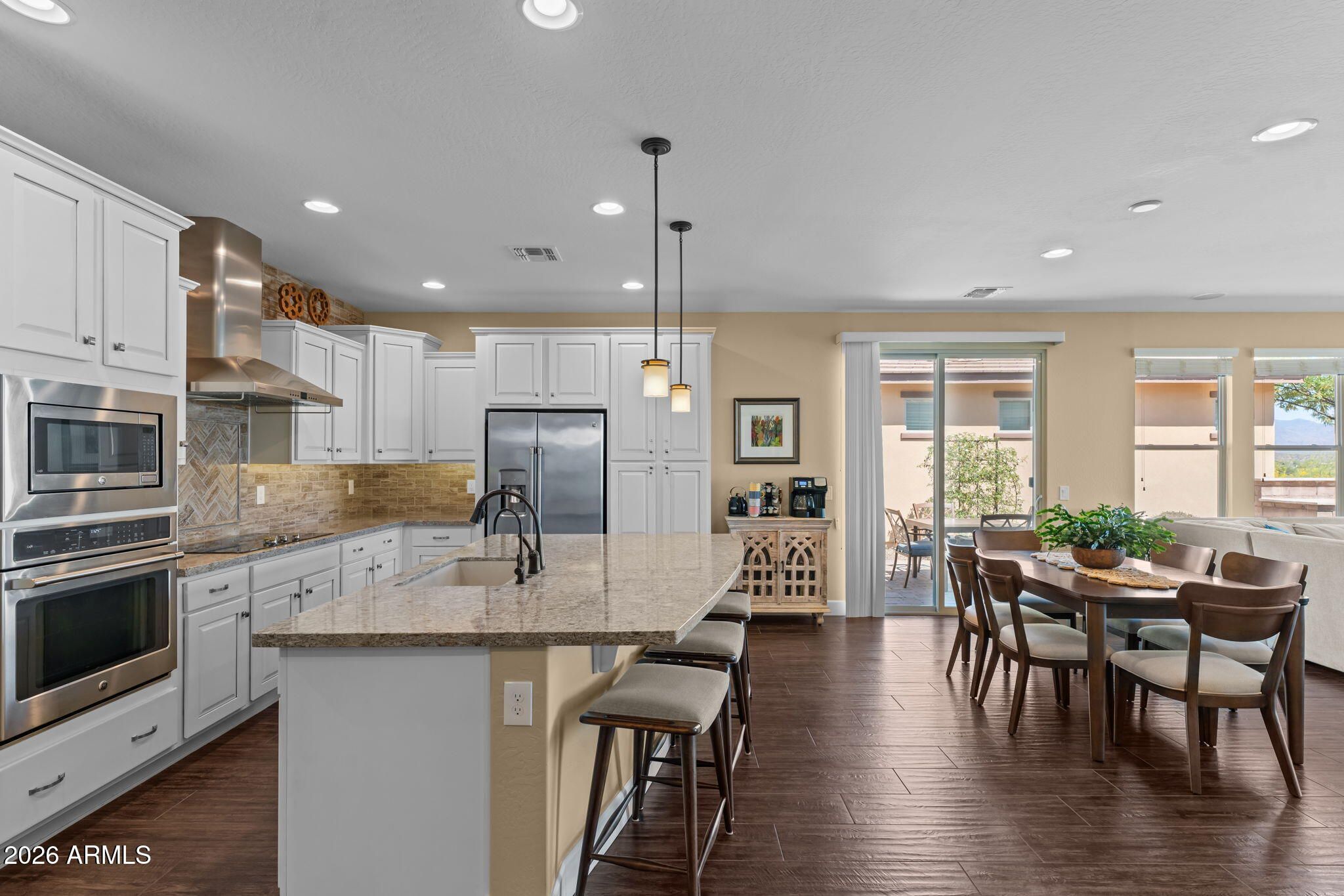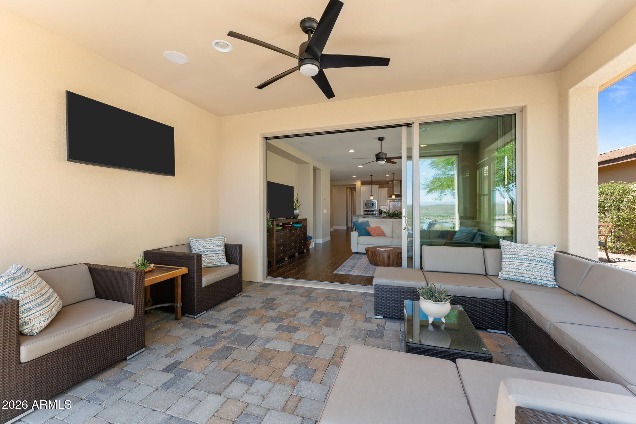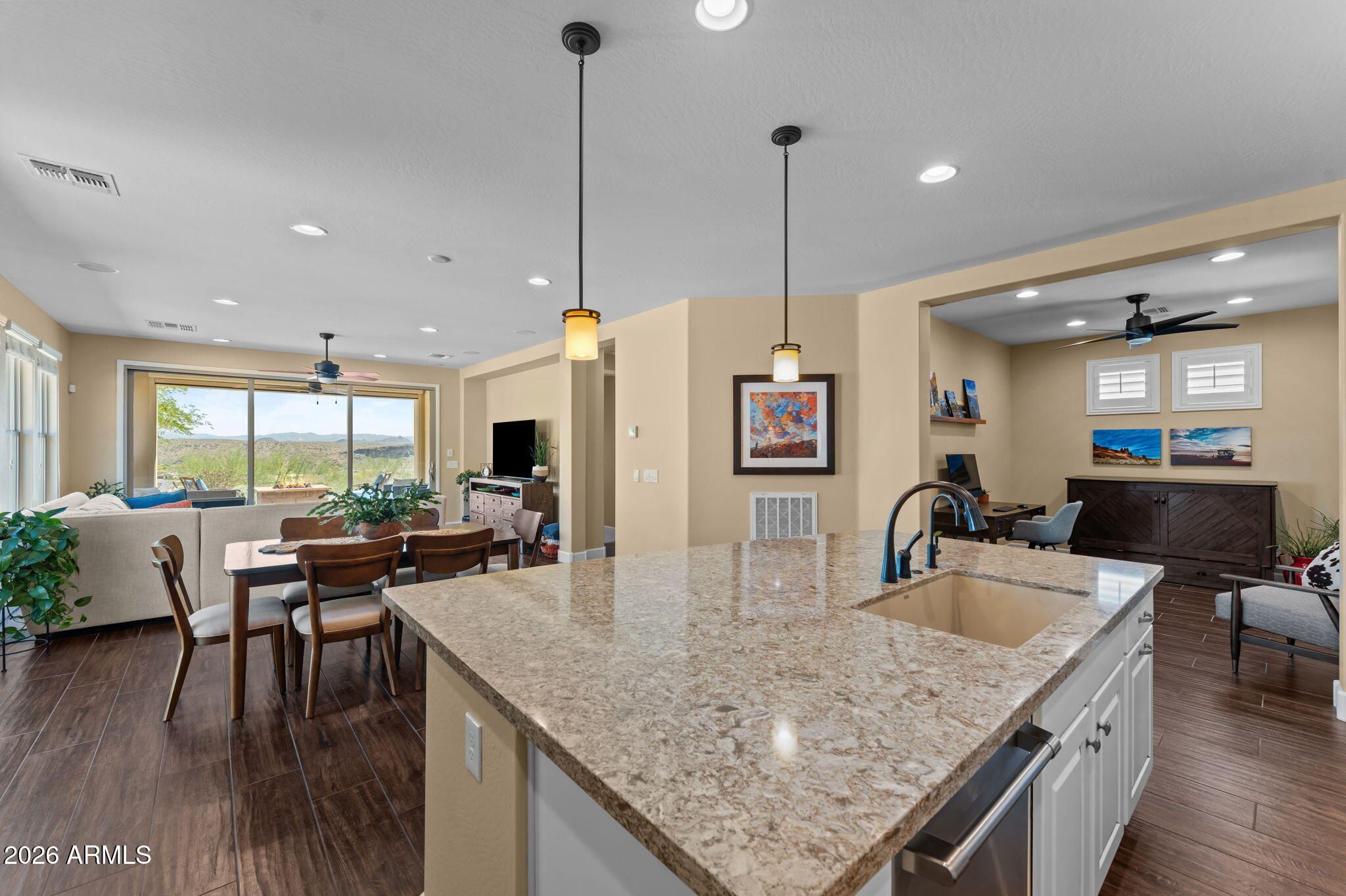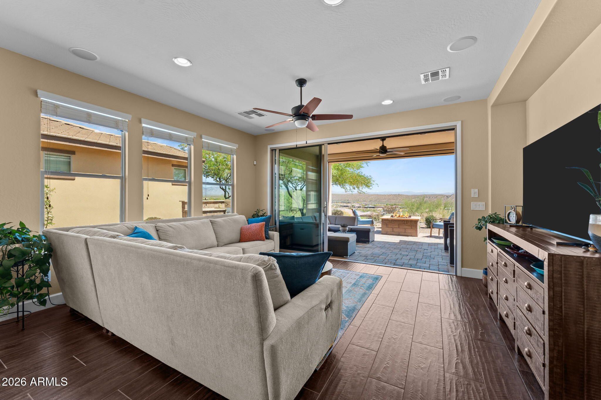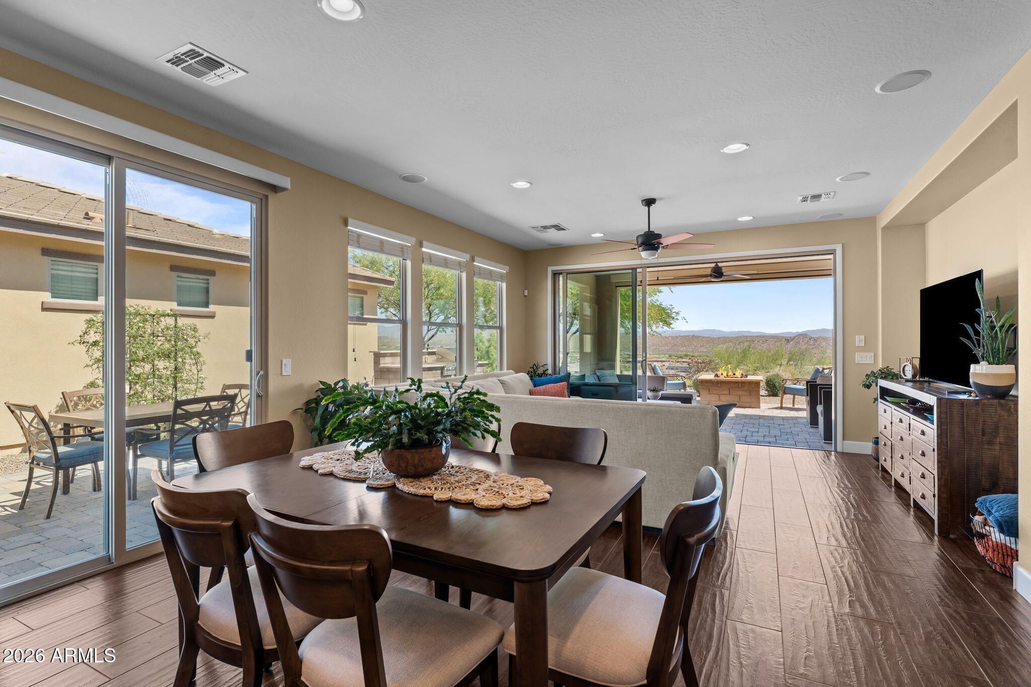COMES FULLY FURNISHED WITH ALL DECOR. Experience spectacular mountain views from this highly upgraded 2 bed, 2 bath home and a den with murphy bed that can serve as a 3rd bedroom. Thoughtful enhancements shine throughout; from the extended 2-car garage to the expansive paver patio, outdoor kitchen, remote screen, and custom fire pit designed for effortless indoor-outdoor living. The gourmet kitchen features upgraded quartz countertops, an electric cooktop, wall oven, and a generous center island perfect for entertaining. The great room offers a dramatic 15' sliding glass door that fills the space with natural light. The dining room boasts a second sliding glass door which opens to a private side patio that seamlessly connects to the built-in BBQ and beautifully finished backyard. The primary suite is a true retreat with dual sinks, a fully tiled shower, a walk-in closet, and gorgeous mountain views. The guest bath offers a spacious, upgraded shower enclosure. Professionally decorated and impeccably maintained, this former model home is offered fully furnished, ready for you to move in and enjoy.