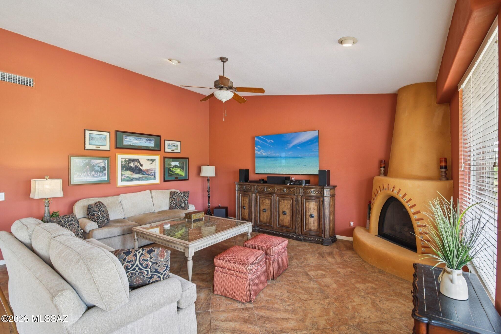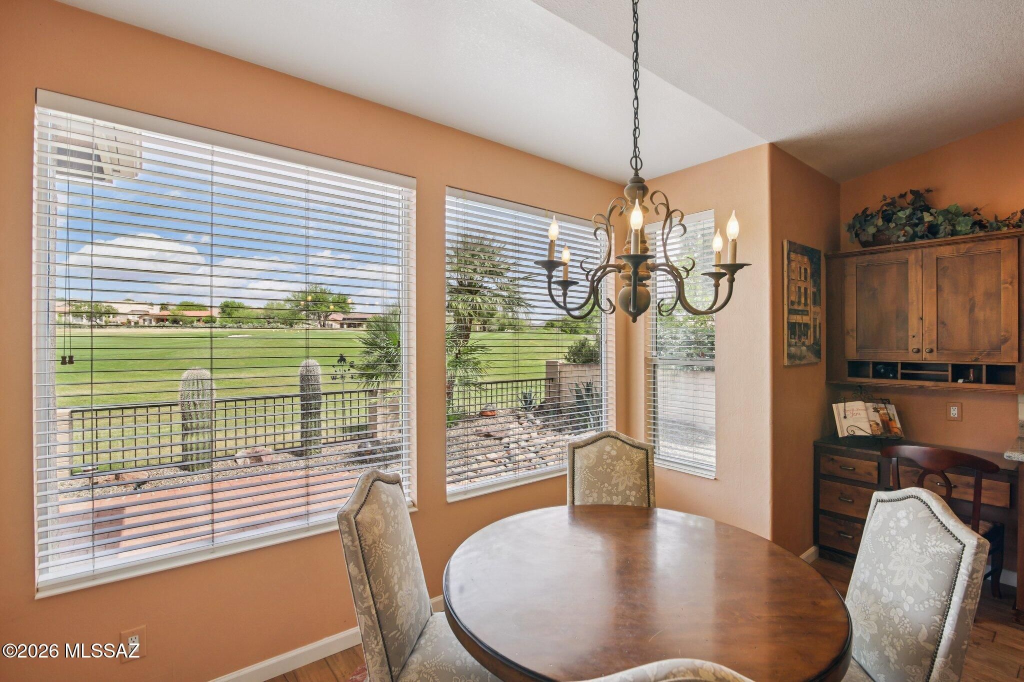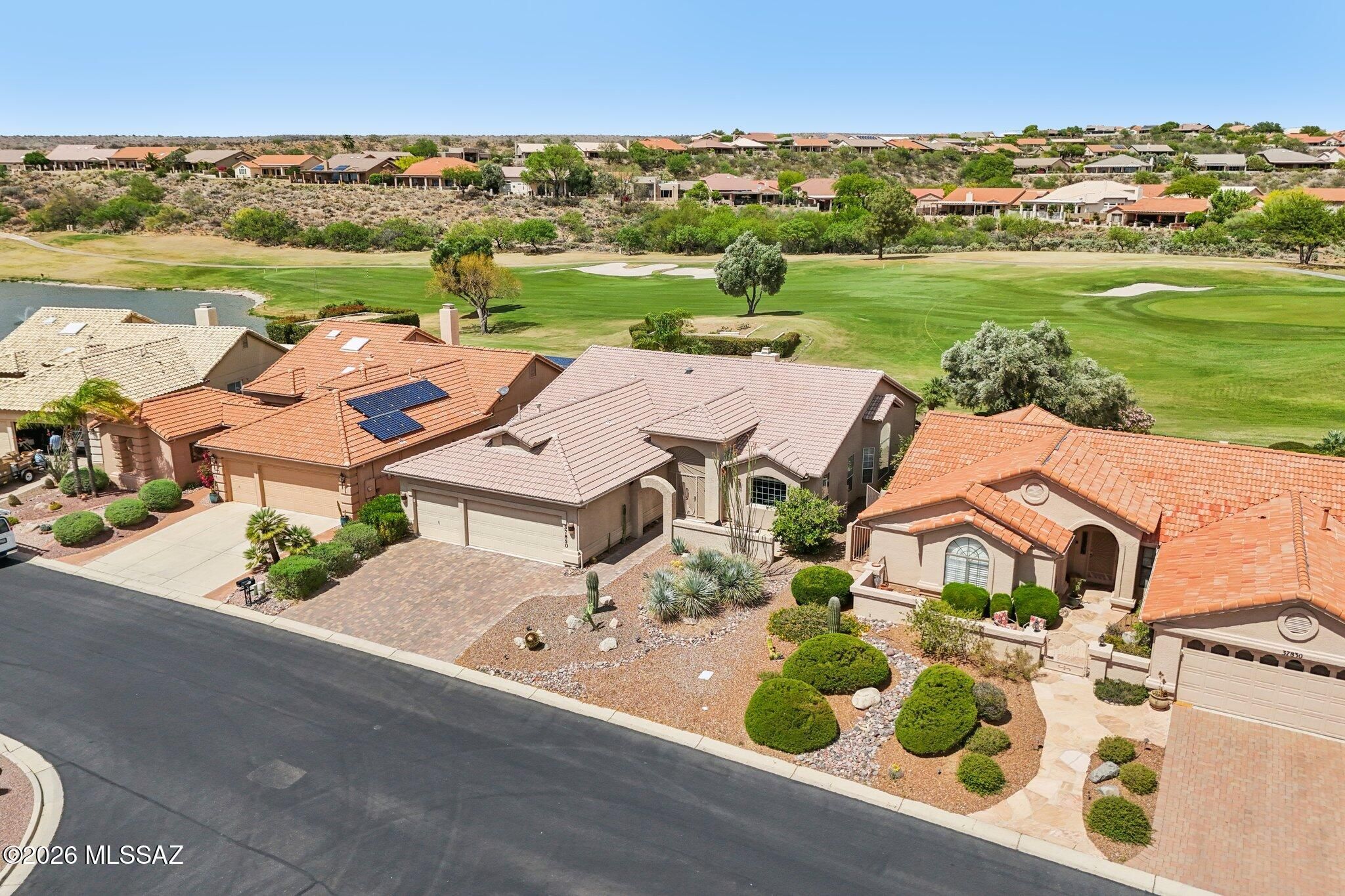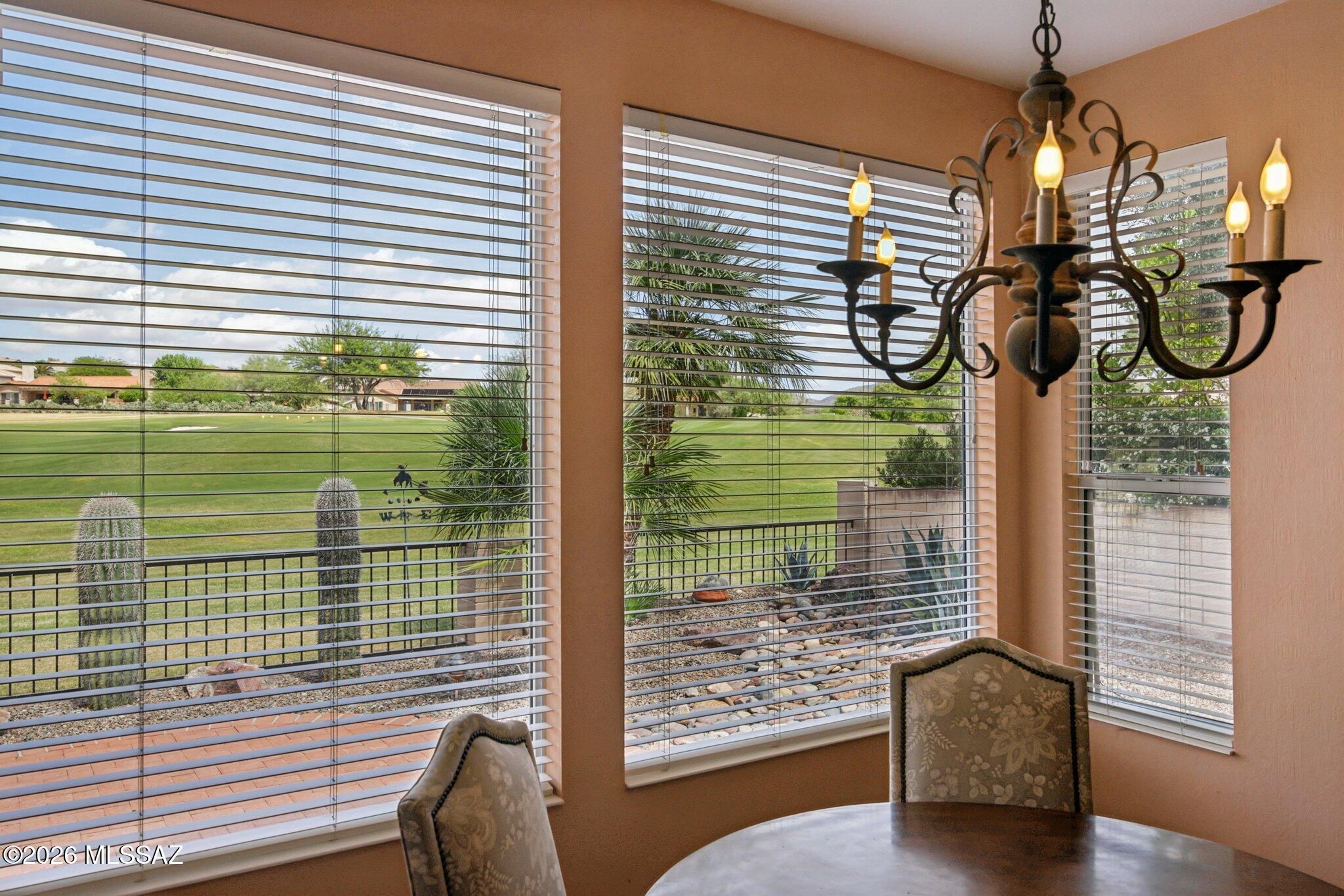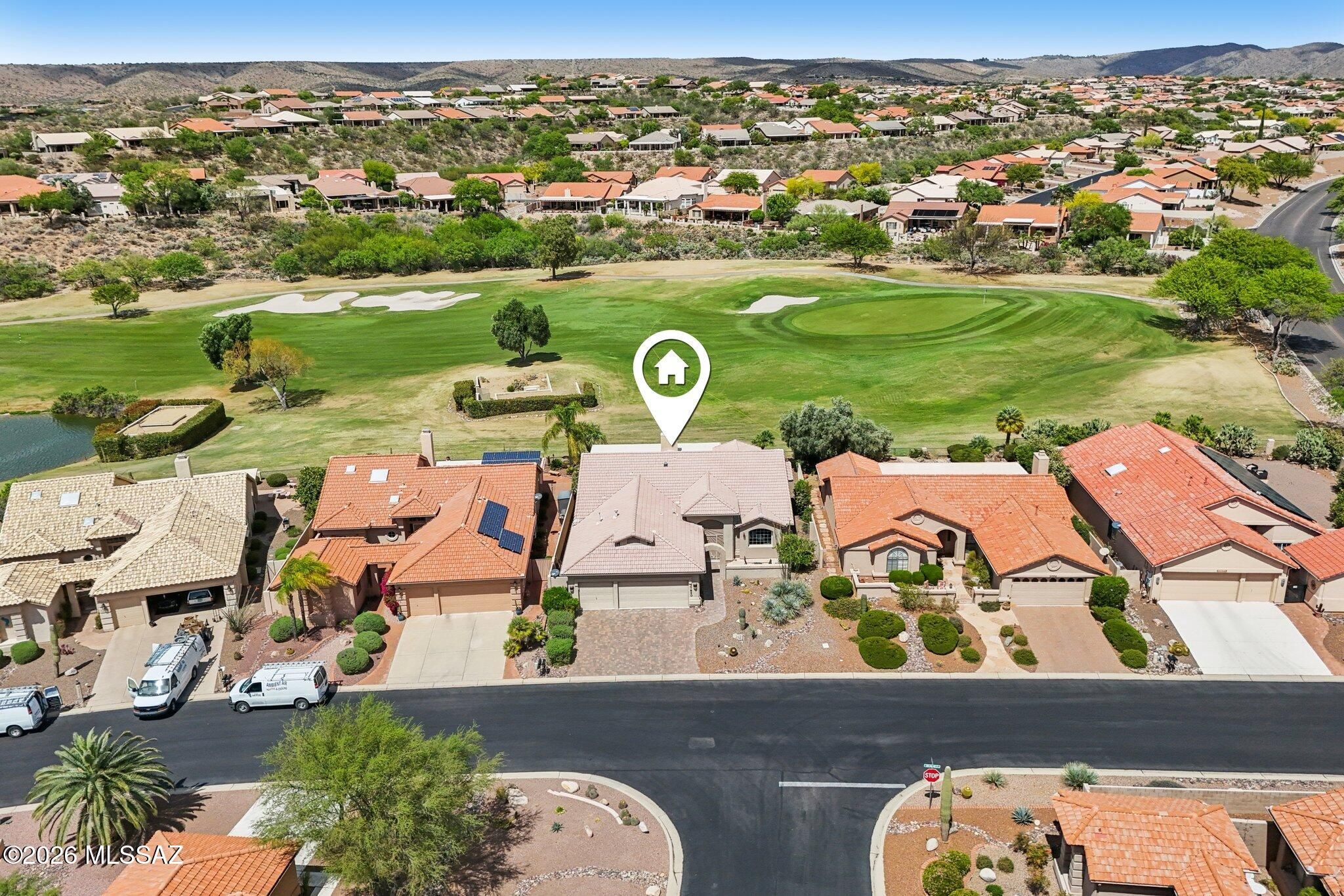 Don't miss this highly upgraded single story Galleria model situated on the 4th Green of the Tucson-Nine golf course with wonderful views. This move-in ready home boasts a large remodeled chef's kitchen with custom Alder cabinets, granite countertops, tile backsplash and sit up bar. New wood floors throughout, custom cabinetry, bookshelves, built-in desks in the den, and new arched window in living room. Large oversized primary suite with sitting area, remodeled primary bath including new vanity and shower with glass door plus storage, updated hall bath and new flooring in bath and laundry. Kitchen overlooks wonderful family room with gorgeous corner style kiva gas fireplace and soft desert colors throughout. Brick paver courtyard entrance plus wonderful extended covered patio