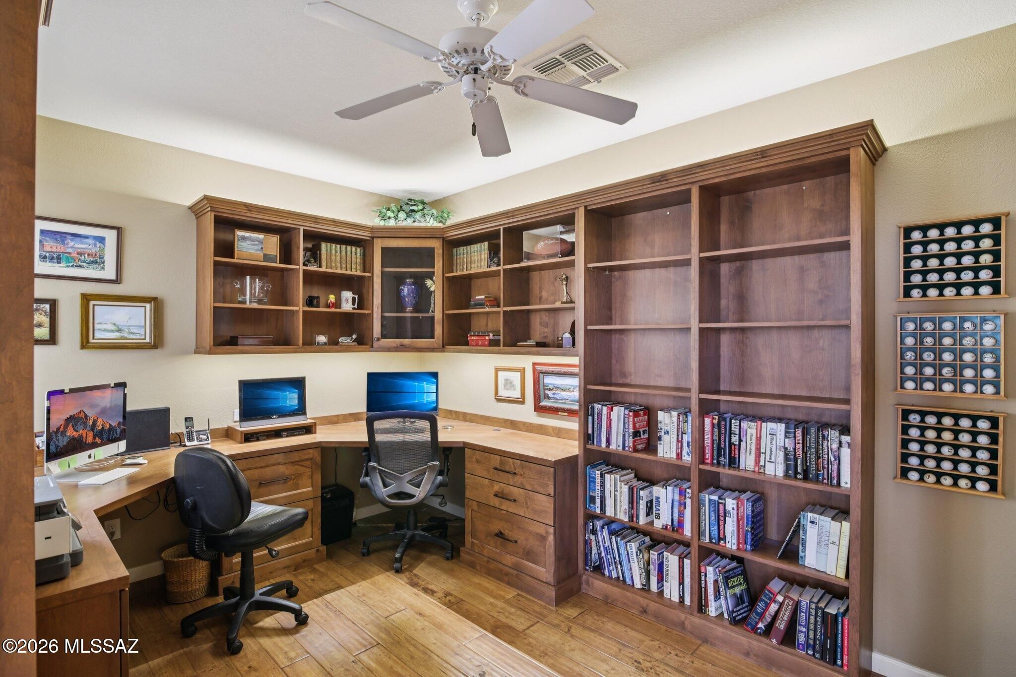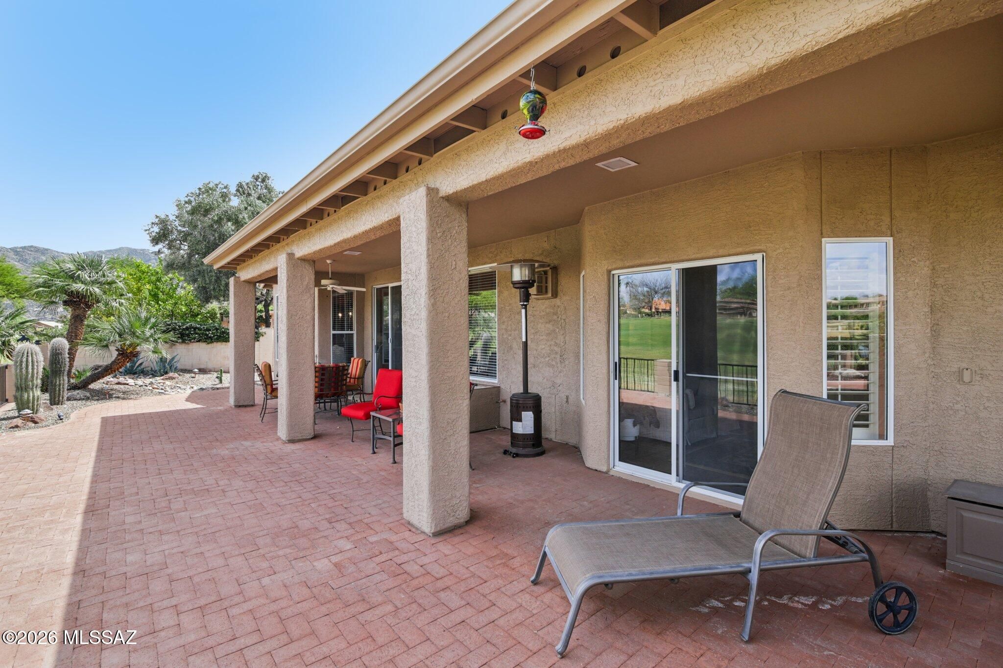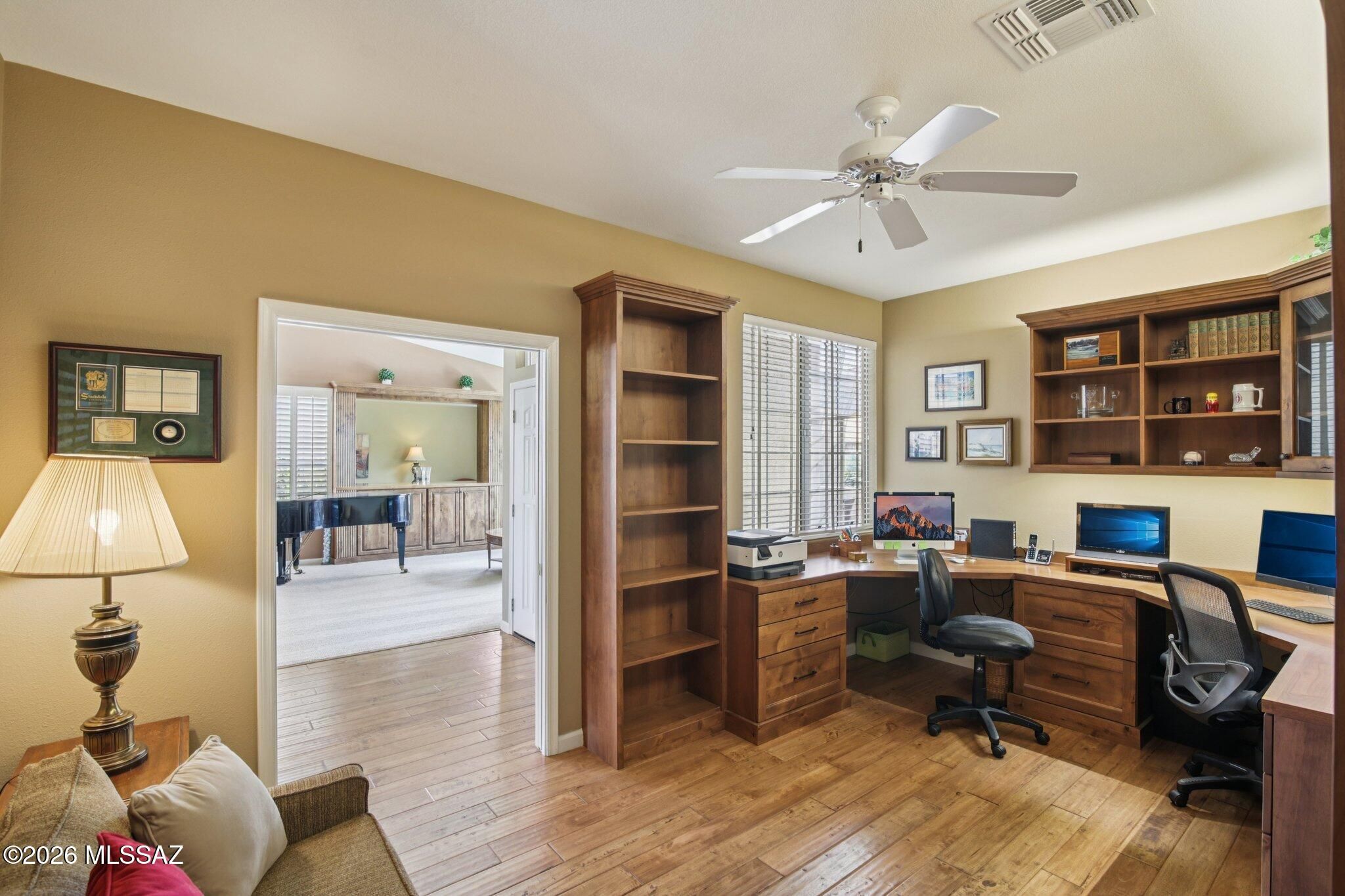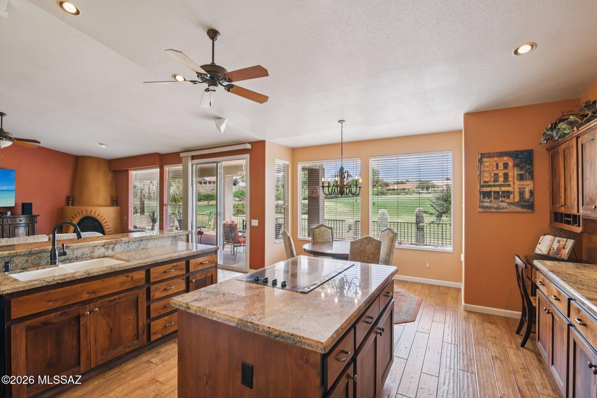 Don't miss this highly upgraded single story Galleria model situated on the 4th Green of the Tucson-Nine golf course with wonderful views. This move-in ready home boasts a large remodeled chef's kitchen with custom Alder cabinets, granite countertops, tile backsplash and sit up bar. New wood floors throughout, custom cabinetry, bookshelves, built-in desks in the den, and new arched window in living room. Large oversized primary suite with sitting area, remodeled primary bath including new vanity and shower with glass door plus storage, updated hall bath and new flooring in bath and laundry. Kitchen overlooks wonderful family room with gorgeous corner style kiva gas fireplace and soft desert colors throughout. Brick paver courtyard entrance plus wonderful extended covered patio