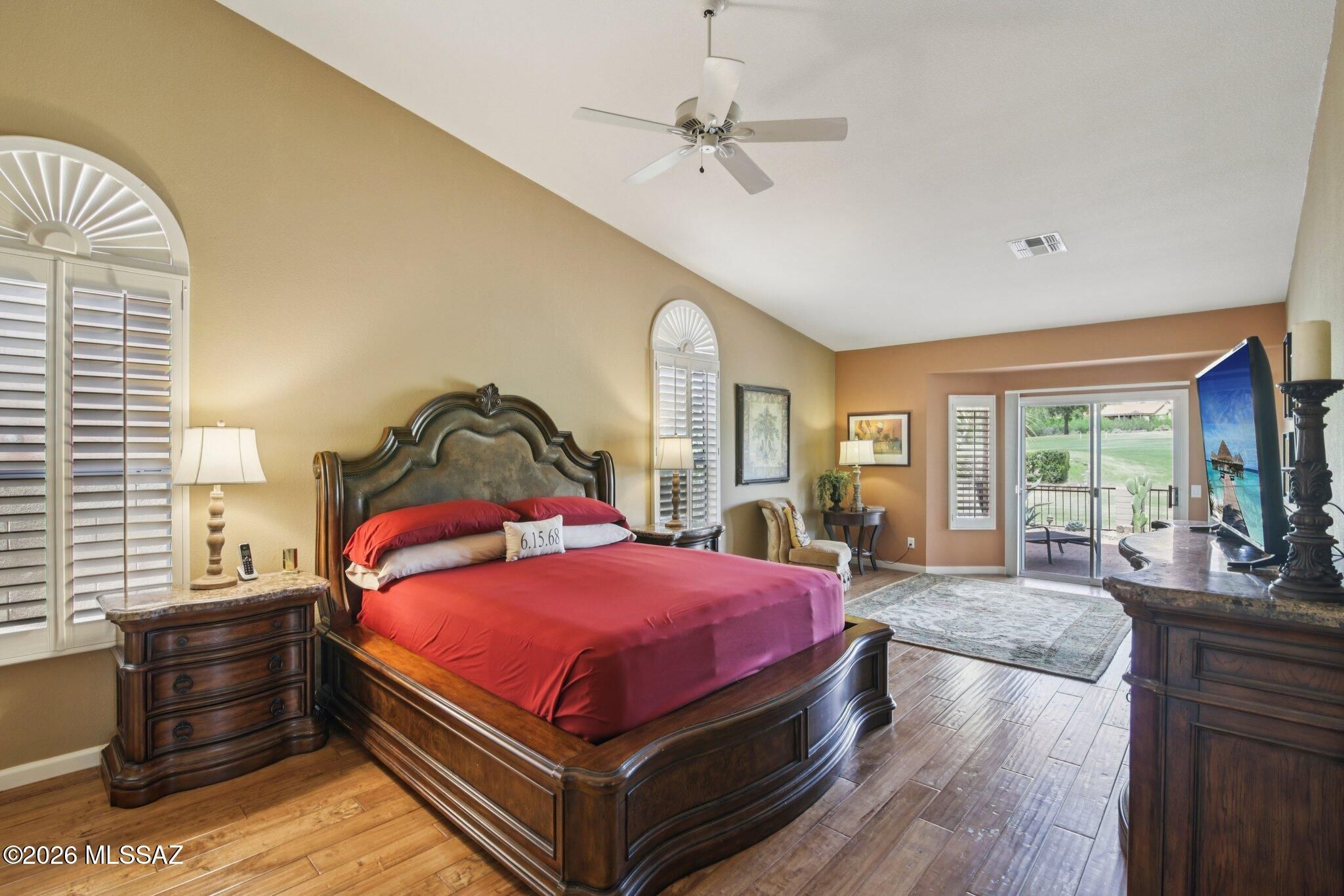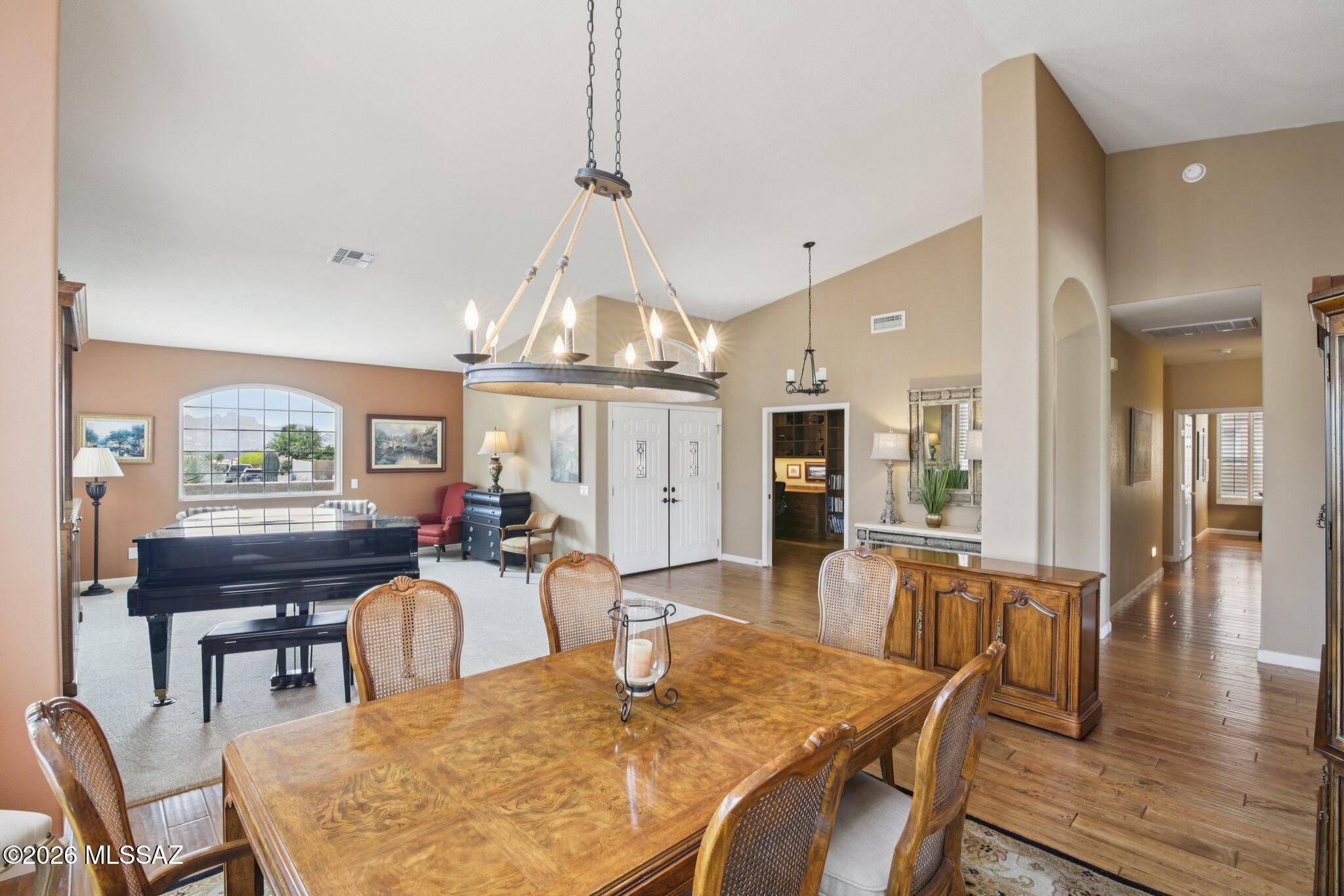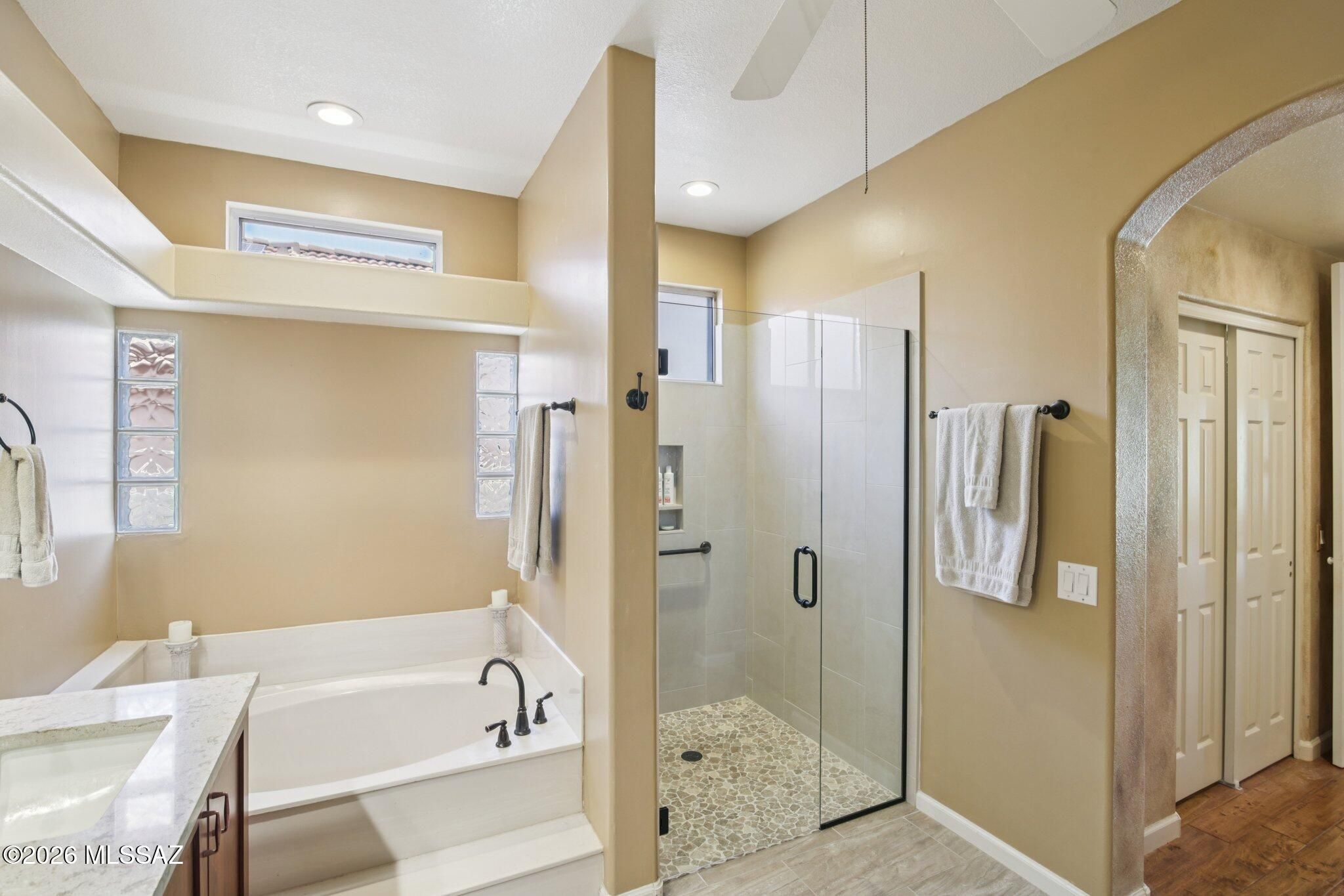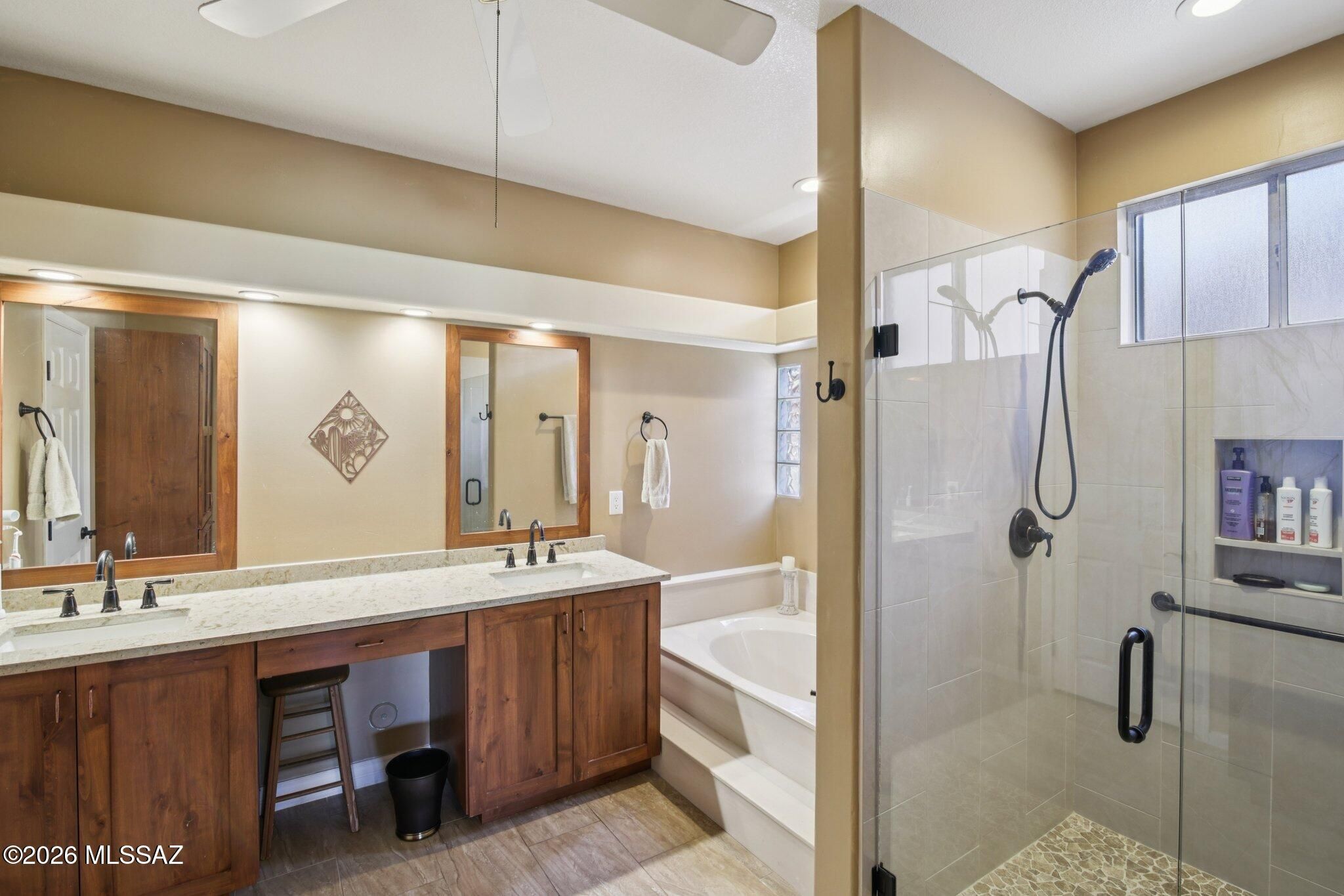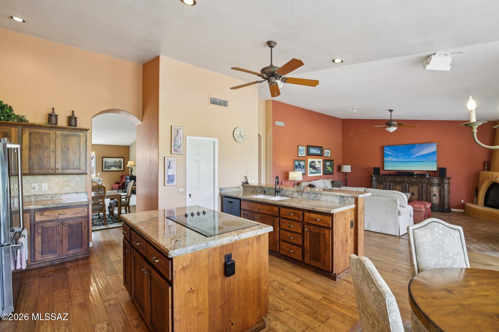 Don't miss this highly upgraded single story Galleria model situated on the 4th Green of the Tucson-Nine golf course with wonderful views. This move-in ready home boasts a large remodeled chef's kitchen with custom Alder cabinets, granite countertops, tile backsplash and sit up bar. New wood floors throughout, custom cabinetry, bookshelves, built-in desks in the den, and new arched window in living room. Large oversized primary suite with sitting area, remodeled primary bath including new vanity and shower with glass door plus storage, updated hall bath and new flooring in bath and laundry. Kitchen overlooks wonderful family room with gorgeous corner style kiva gas fireplace and soft desert colors throughout. Brick paver courtyard entrance plus wonderful extended covered patio