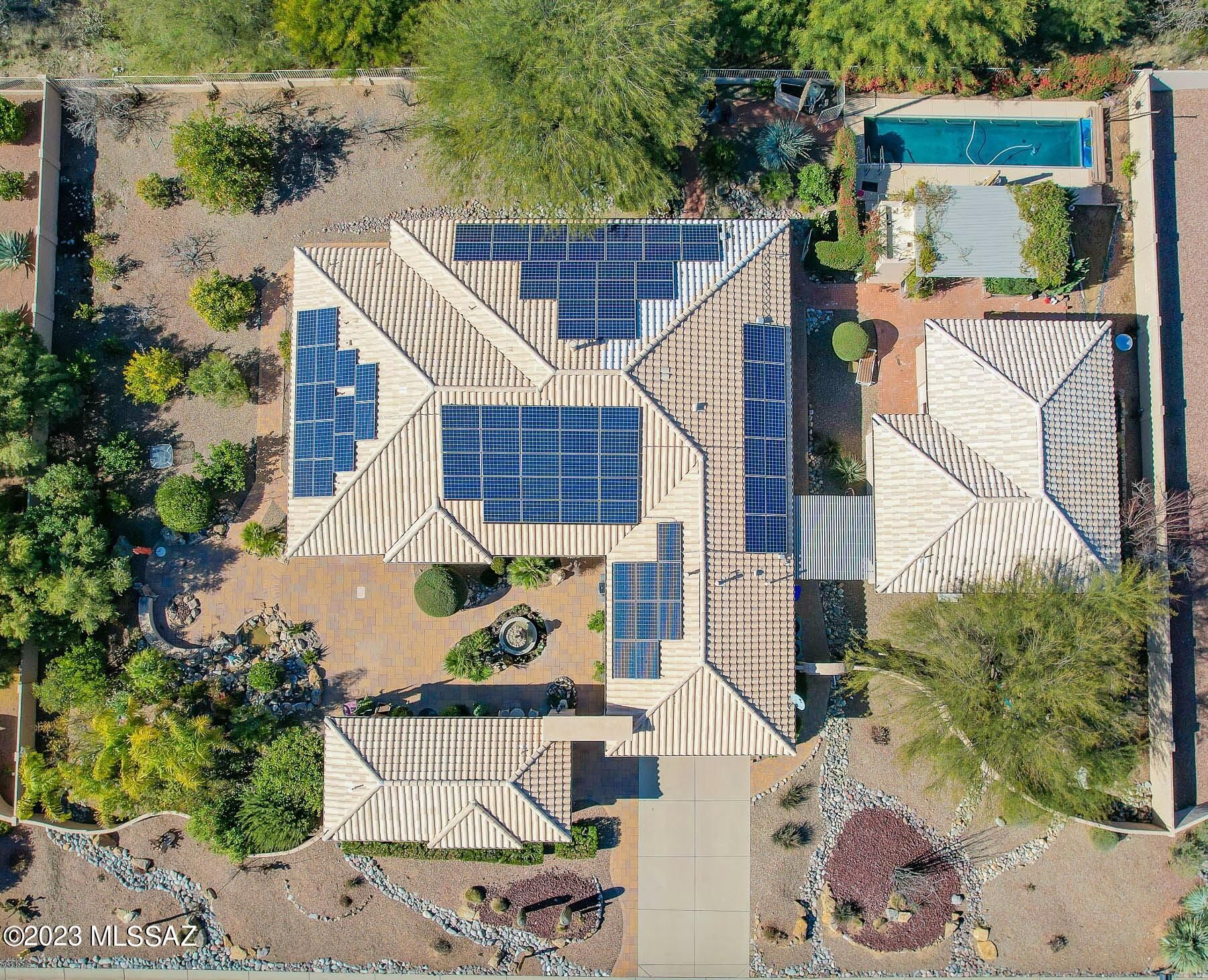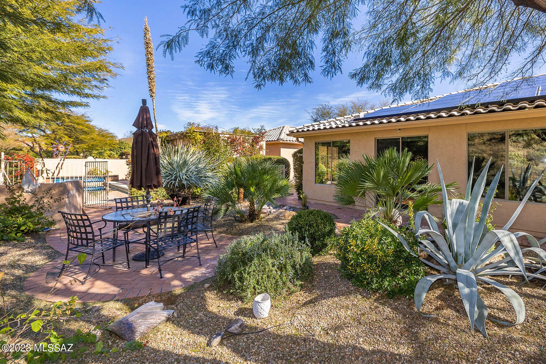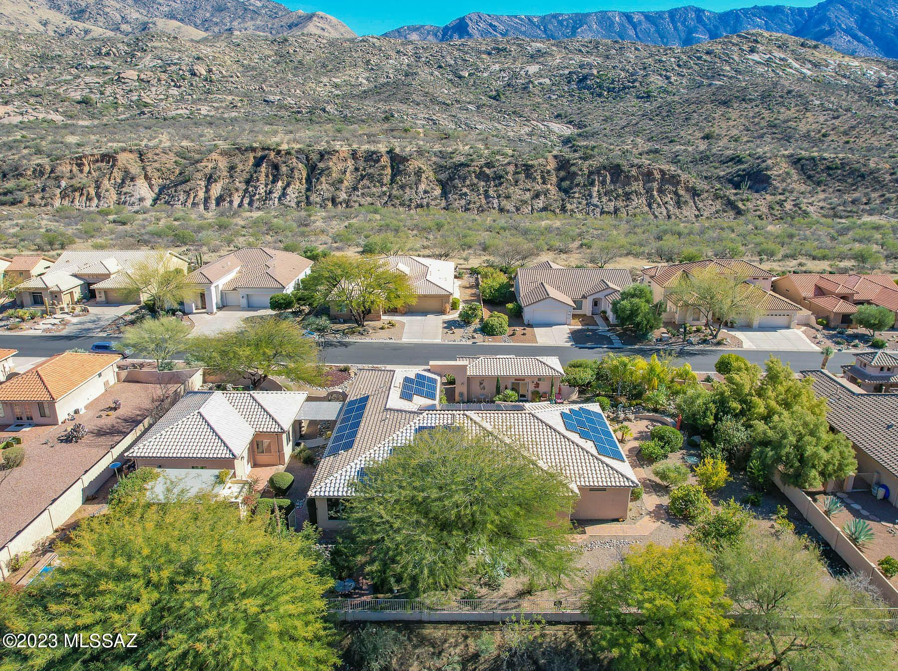 Situated on a 1 acre, resort-like lot with pool, hillside backdrop and front Catalina views. This spectacular retreat boasts a 2BD/3BA (3,161 sf) main home plus detached 1BD/1BA (434 sf) Casita and 1BD/1BA (704 sf) Casita w/workshop. Newer roof and HVAC plus leased solar on main home. Enter the large main living space with tray ceiling, recessed in-wall fireplace, sunroom plus media room. Gourmet kitchen hosts center island and breakfast nook. Main bedrooms feature room-size closets and en-suite baths w/jetted tub & walk-in shower. Gated paver courtyard w/tiered fountain flows to large fire pit patio and trickling water feature. Paver walkway spans side & rear of home boasting lush desert plantings, fruit & shade trees, pool ramada w/bath and lap pool. SaddleBrooke Active Adult Community.