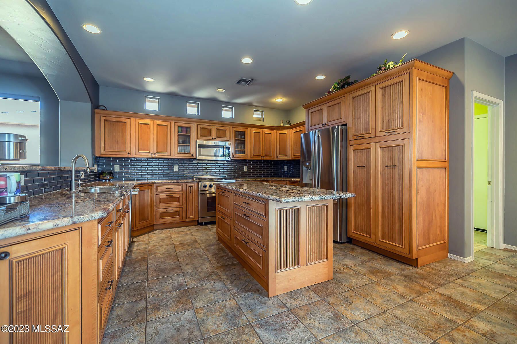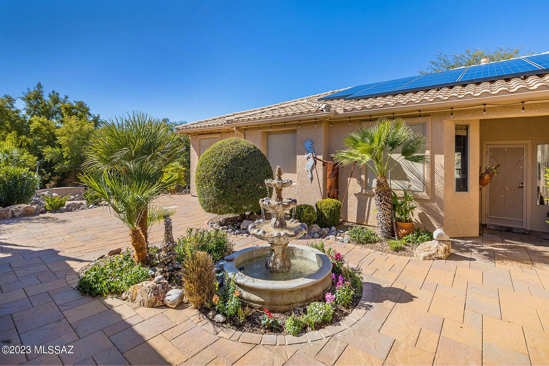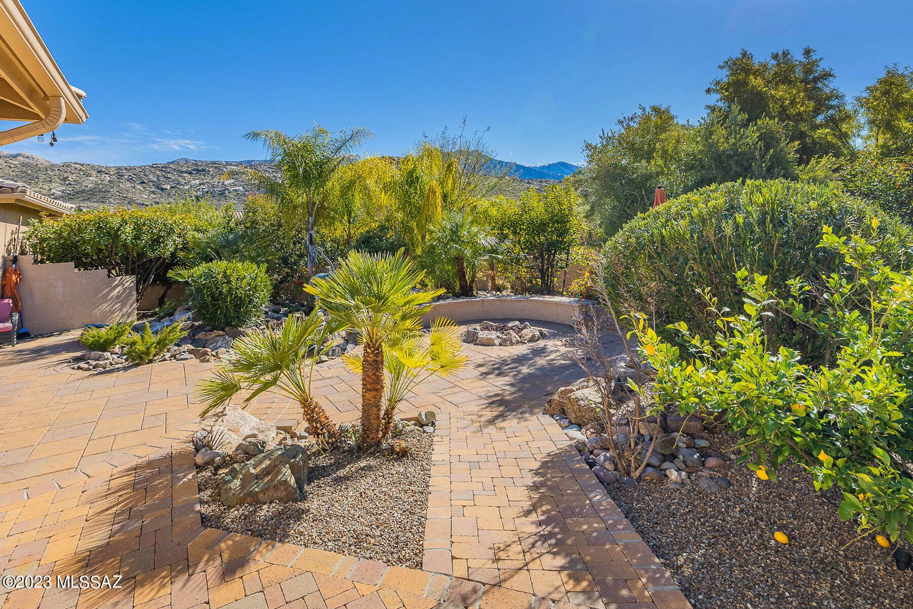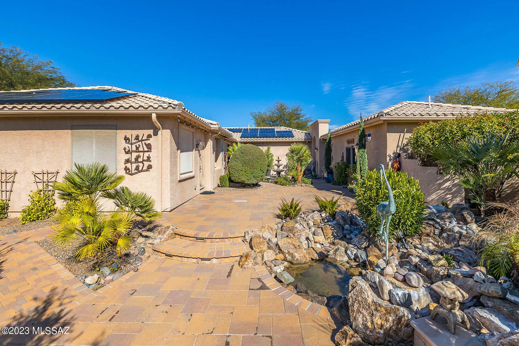 Situated on a 1 acre, resort-like lot with pool, hillside backdrop and front Catalina views. This spectacular retreat boasts a 2BD/3BA (3,161 sf) main home plus detached 1BD/1BA (434 sf) Casita and 1BD/1BA (704 sf) Casita w/workshop. Newer roof and HVAC plus leased solar on main home. Enter the large main living space with tray ceiling, recessed in-wall fireplace, sunroom plus media room. Gourmet kitchen hosts center island and breakfast nook. Main bedrooms feature room-size closets and en-suite baths w/jetted tub & walk-in shower. Gated paver courtyard w/tiered fountain flows to large fire pit patio and trickling water feature. Paver walkway spans side & rear of home boasting lush desert plantings, fruit & shade trees, pool ramada w/bath and lap pool. SaddleBrooke Active Adult Community.