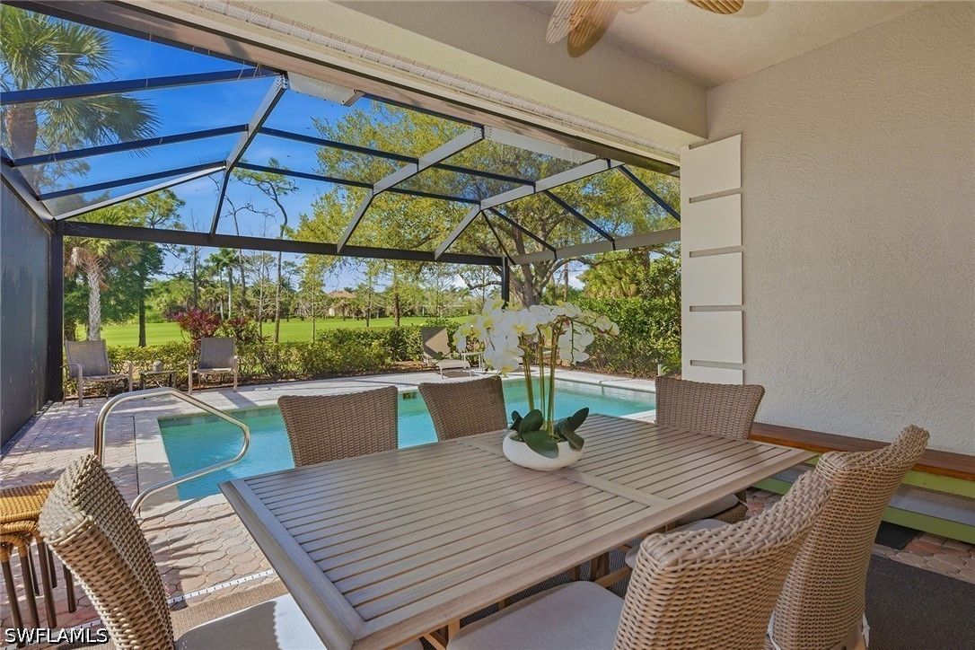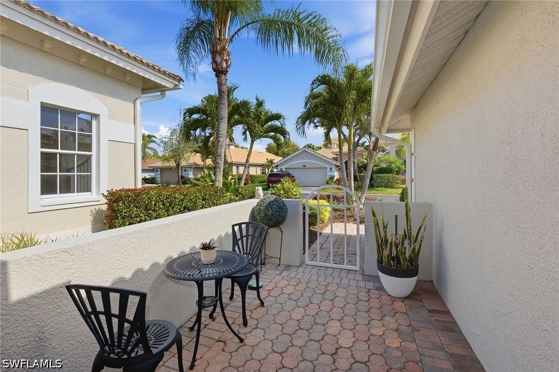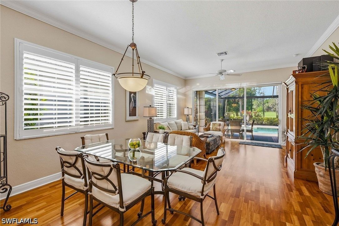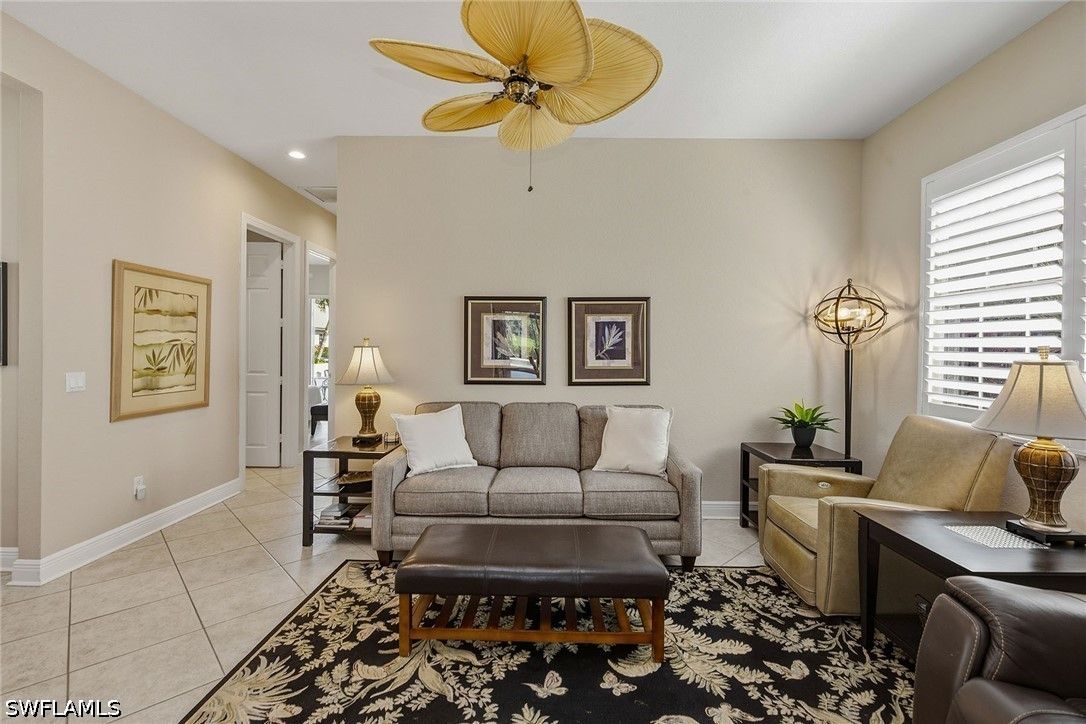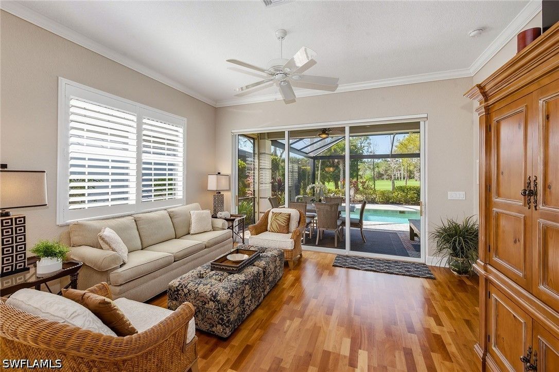Rare (optional) opportunity, enjoy immediate full golf membership and skip the extensive waitlist at the prestigious Members Club at Marco, offering access to the regarded championship Rookery and Hammock Bay Golf courses, two elegant clubhouses, and private beach privileges at JW Marriott. Quality built by the Gulf Bay and showcasing the popular Cedarcrest floor plan, this beautifully furnished Cotton Green residence is positioned overlooking the 12th fairway of the Rookery Golf course, lush tropical landscaping, and offering coveted southwestern exposure delivering breathtaking sunset skies and plentiful natural light on your private pool. Designed for effortless luxury living, the three-bedroom, two-bath home with a two-car garage features a refined, light-filled interior with wood-look luxury vinyl plank flooring, new baseboards, arched walkways, recessed LED lighting, plantation shutters, crown molding and integrated in-ceiling speakers, all flowing seamlessly to the outdoor living space. The chef-inspired kitchen with breakfast area is elegant and functional with quartz countertops, mosaic tile backsplash, sleek cabinetry, pantry and stainless steel appliances including a double-oven range, microwave, new refrigerator with ice maker (2026), and dishwasher. The primary suite is a private retreat with a vaulted ceiling, arched window with transom, lanai access, custom walk-in closet, and a spa-style bath featuring dual quartz vanities, a soaking tub, and a glass-enclosed walk-in shower, while guest bedrooms are generously sized with new carpeting and well-appointed baths. Outdoor living is elevated on the expansive screened lanai with pavers, covered seating, ceiling fan, in-ceiling speakers and a heated pool with a pool heater replaced in 2023, enhanced by a newer picture-frame screen enclosure (2023) that maximizes the picturesque setting. Significant updates provide peace of mind, including a new roof (2024), new air handler and condenser (2024/2025), and additional system improvements. The garage is upgraded with a painted floor, LED lighting, EV-ready outlet and overhead storage. As a resident of the award-winning Fiddler’s Creek community, you will enjoy resort-style amenities including an impressive clubhouse with swimming pools with waterfalls and slides, the updated Gator Grille, Caxambas fine dining, 10 new pickleball courts, fitness with trainers and classes, tennis, spa services and a vibrant social calendar, with optional beach and marina memberships. Miles of scenic, tree-lined sidewalks wind throughout the community, creating a setting for recreation, biking and jogging in a tranquil environment. Ideally just minutes from everyday conveniences, an executive airport, and a short drive to Naples’ boutiques, dining and cultural attractions, and Marco Island’s renowned beaches, this exceptional residence offers a lifestyle defined by luxury, convenience and connection.