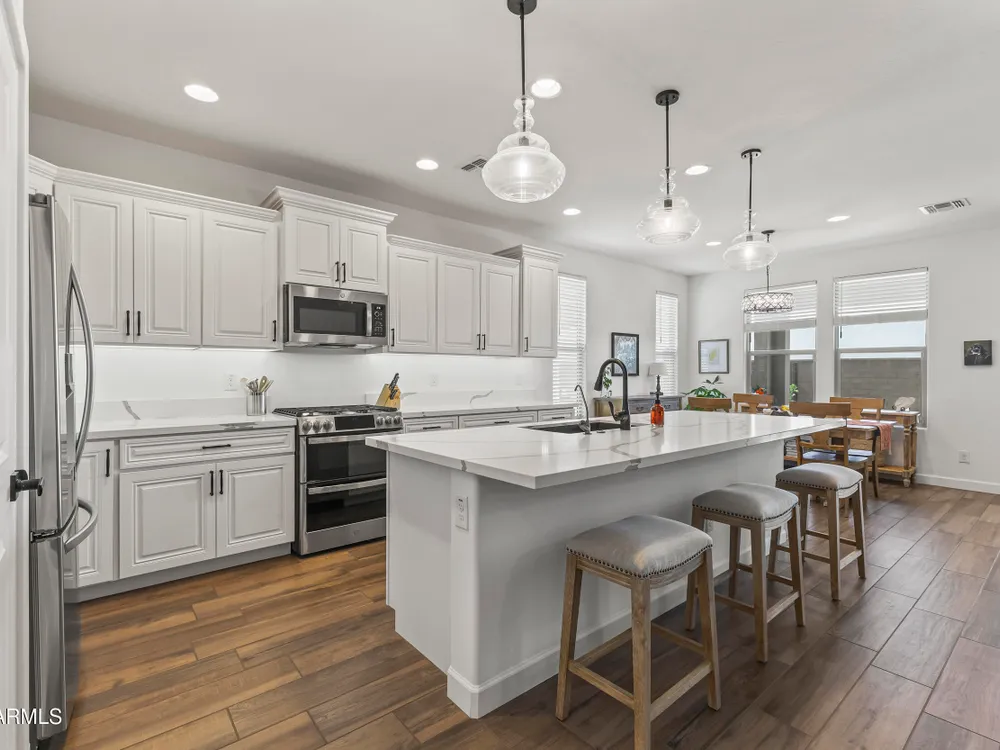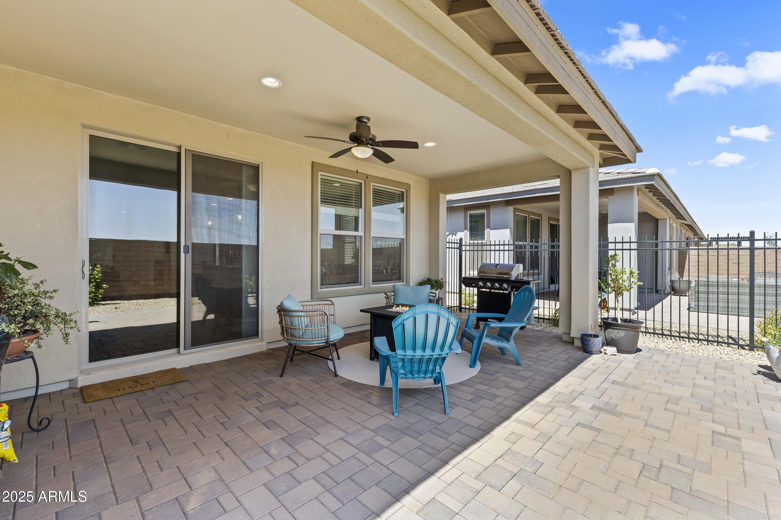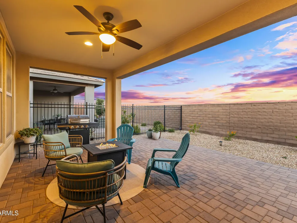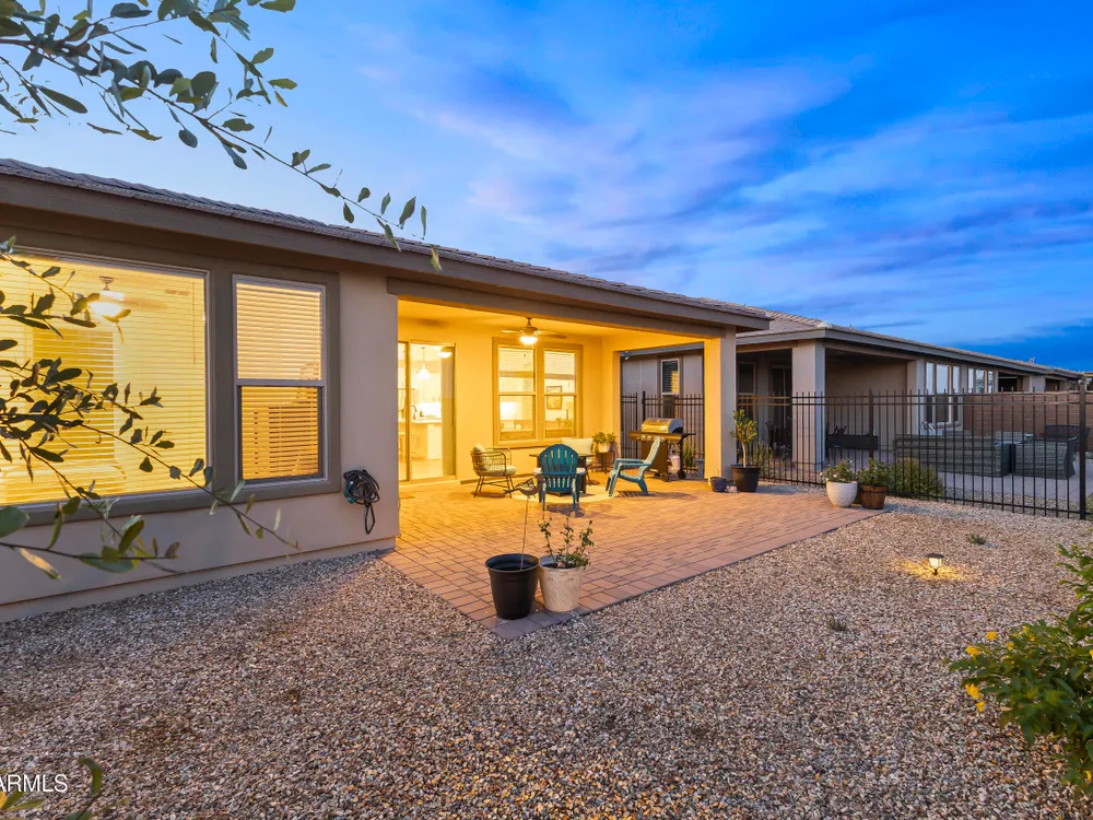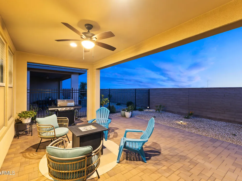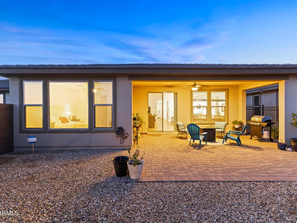 Crave RESORT vibes without the upkeep? Step into this 1,678 sq ft Valletta smart home built 2022, a single level patio jewel on Encanterra's Algarve side open to all ages (other side is 55+). Great room glides to an east patio for sunrise coffee and twilight cocktails. Chef kitchen flaunts quartz island, gas cooktop, white cabinets. Wood-look tile, split layout. Primary suite pampers with tiled shower and walk-in closet, guests get their own wing. Need flex space? Den waits for office, art, Peloton. Encanterra spoils with pools, spa, pickleball, wine tastings, demos, concerts, social clubs. Multiple public and private golf courses minutes away, while Indigo Trails and QC Crossing cover shopping, dining and fun.