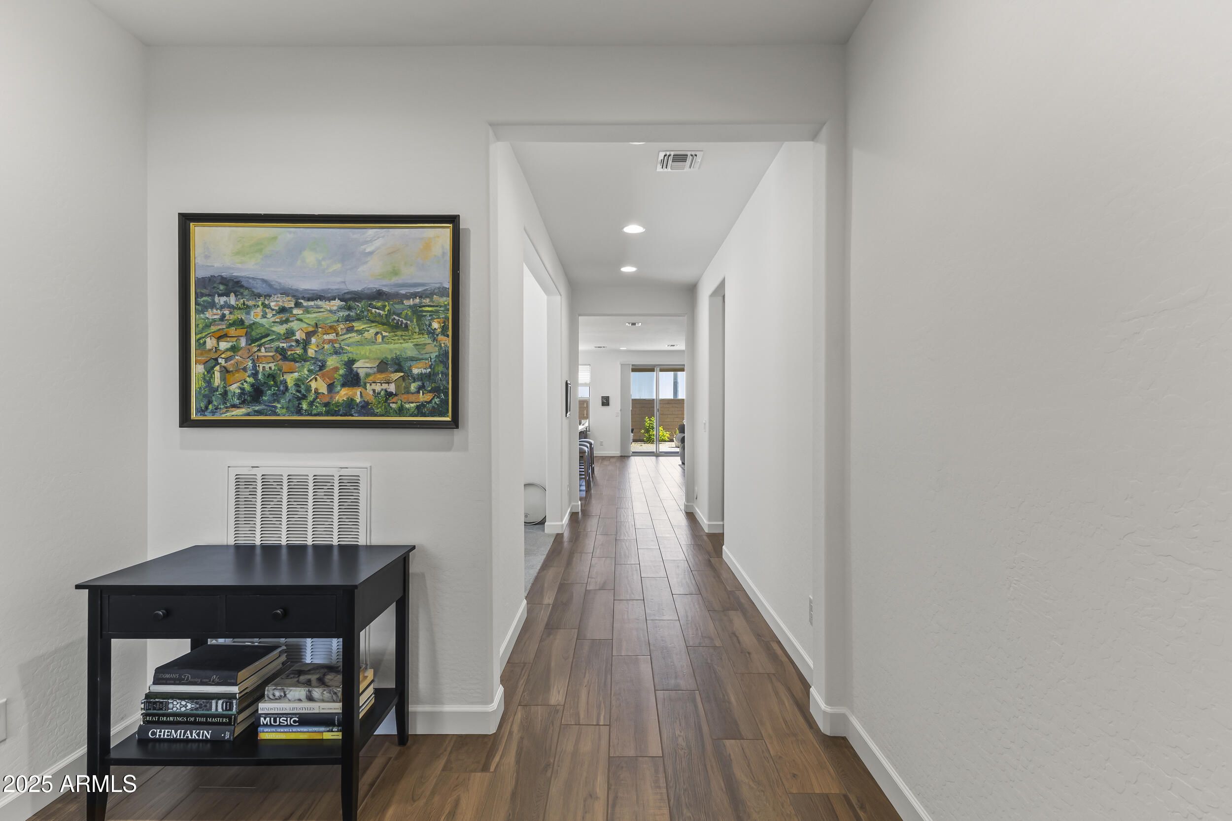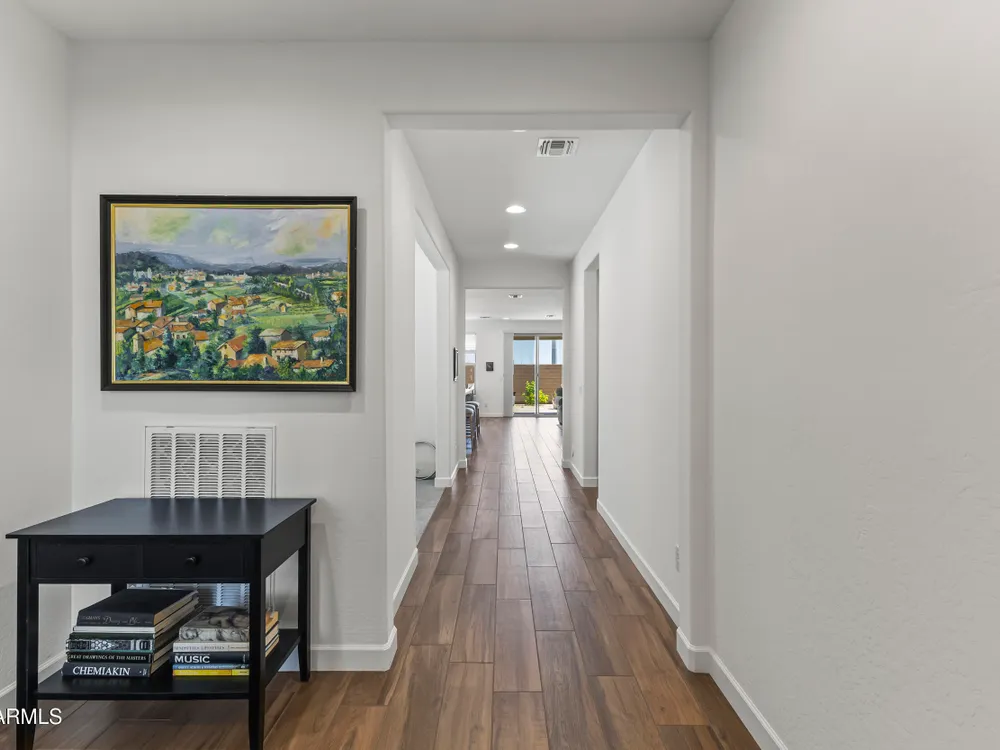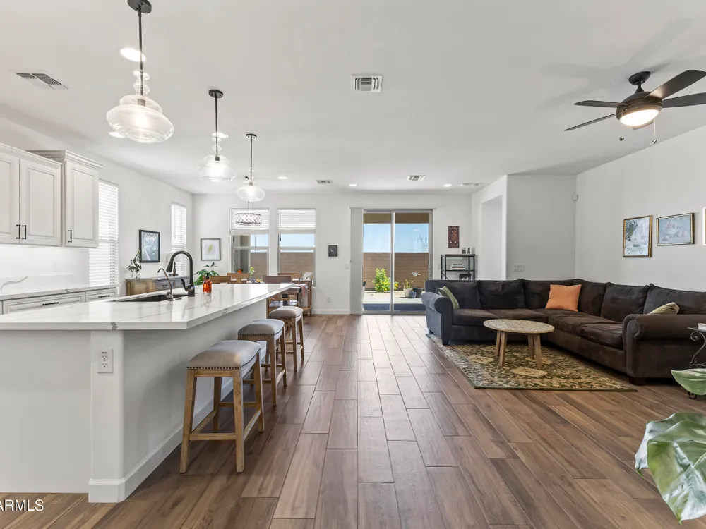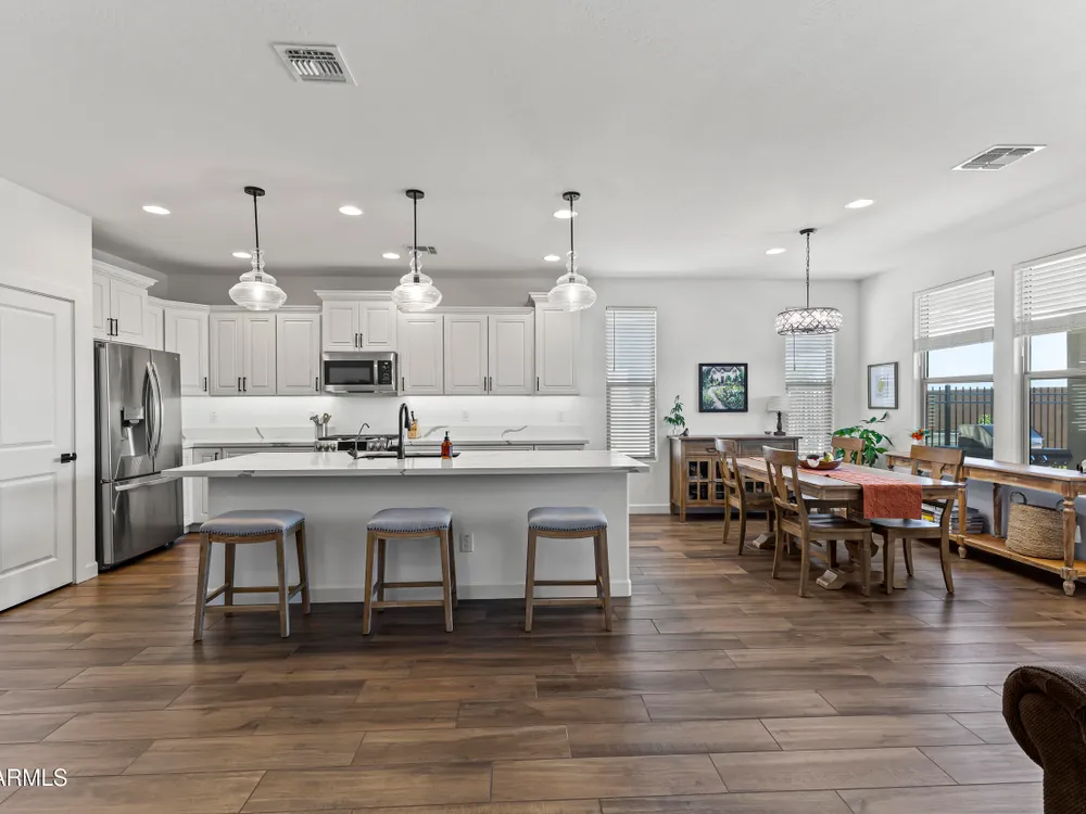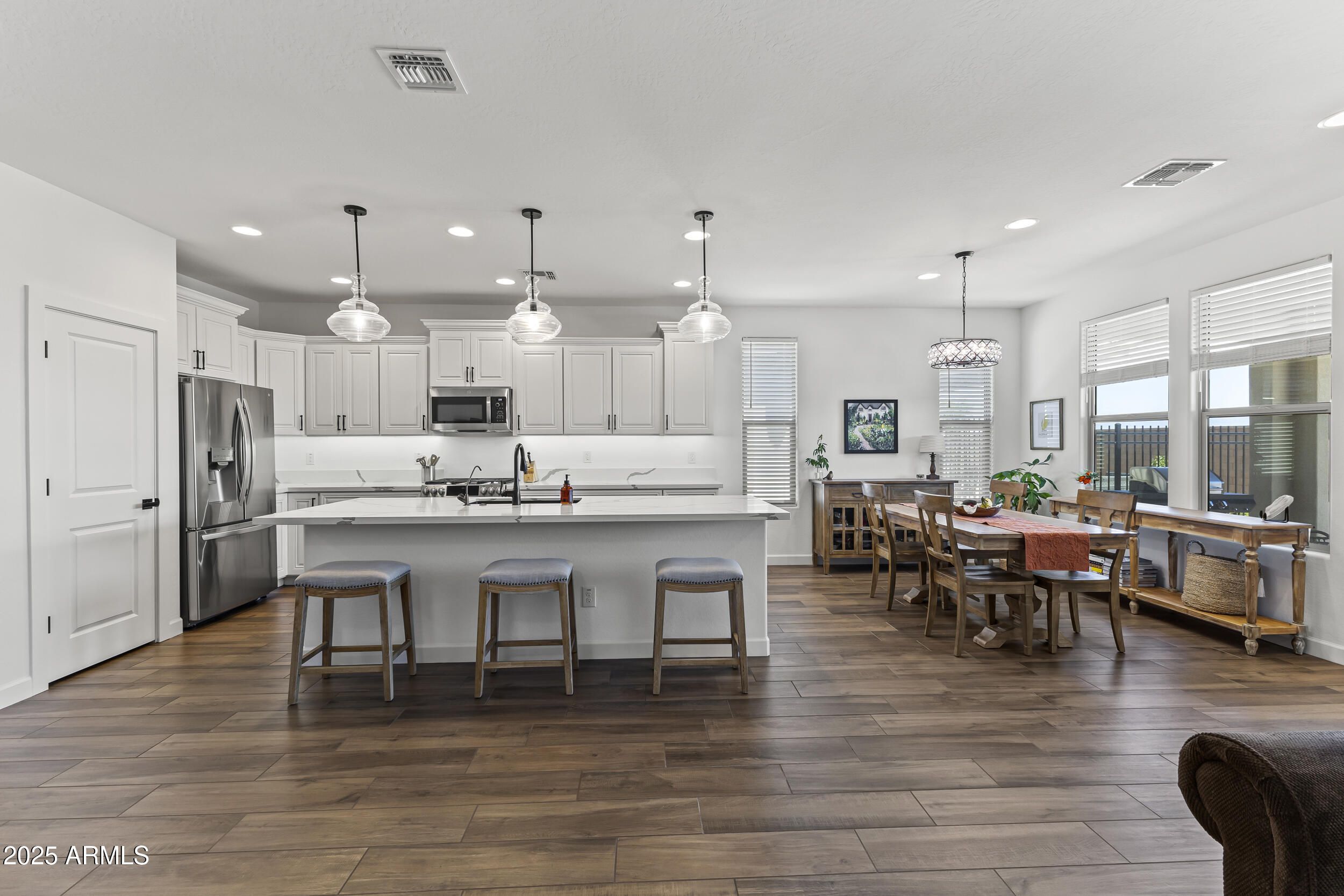 Crave RESORT vibes without the upkeep? Step into this 1,678 sq ft Valletta smart home built 2022, a single level patio jewel on Encanterra's Algarve side open to all ages (other side is 55+). Great room glides to an east patio for sunrise coffee and twilight cocktails. Chef kitchen flaunts quartz island, gas cooktop, white cabinets. Wood-look tile, split layout. Primary suite pampers with tiled shower and walk-in closet, guests get their own wing. Need flex space? Den waits for office, art, Peloton. Encanterra spoils with pools, spa, pickleball, wine tastings, demos, concerts, social clubs. Multiple public and private golf courses minutes away, while Indigo Trails and QC Crossing cover shopping, dining and fun.