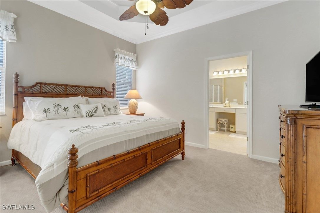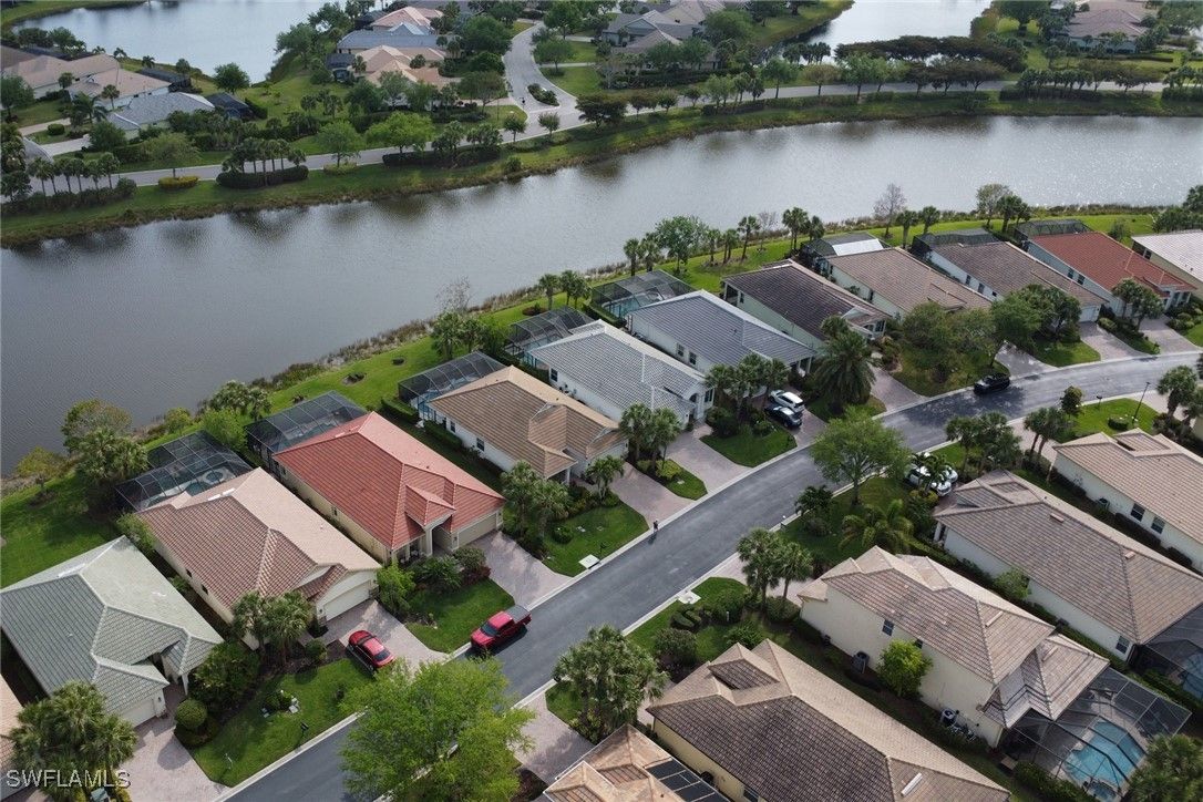 Three bedrooms and two baths on a quiet street location with excellent water views beyond your recently retiled and refurbished in ground pool. New roof and air conditioner in 2023. Tile throughout the living areas and baths and new carpeting in the bedrooms. Relax on your covered lanai and enjoy the beautiful views of the lanai pool and lake. Disappearing doors in the family room make the home feel even bigger. Home is being sold furnished including televisions! New washer and dryer stay. Epoxy floors in your two car attached garage with new storage racks. Crown molding throughout the home. Eastern exposure for beautiful sunrise views, and cooler afternoons by the pool. Owners have a transferable flood policy. Verandah has two golf courses and no waitlist. Or join as a social member and enjoy 7 months of golf (just pay the reduced greens fees), with free use of kayaks, lighted tennis, bocce, and pickleball courts, water aerobics, a lap pool, fully equipped gym with spin and other classes , plus miles of walking and biking trails. No minimums in choice of three restaurant locations. WIFI DVR and cable all included in your HOA dues. Nearby shopping and restaurants can be accessed by golf cart.